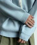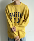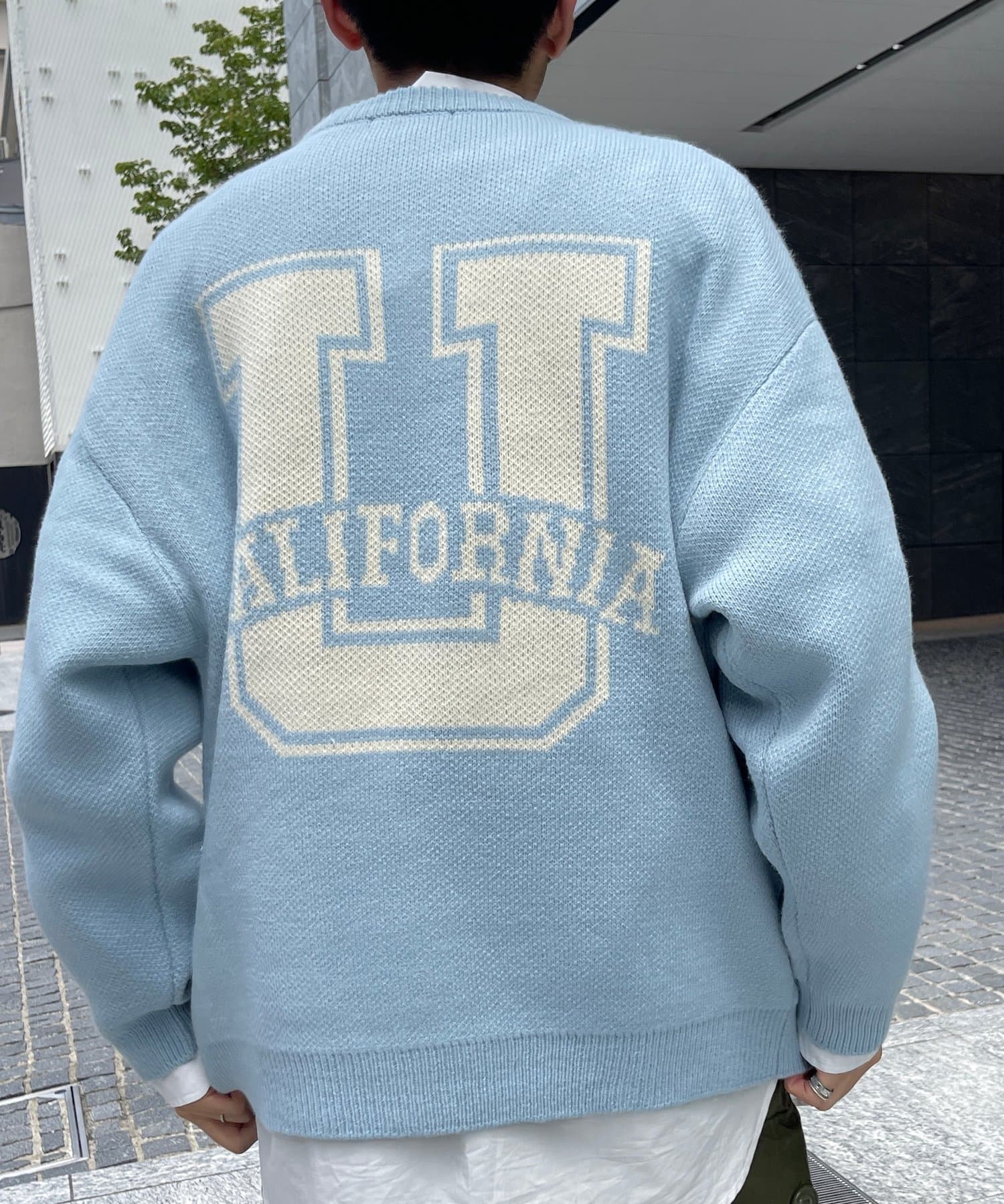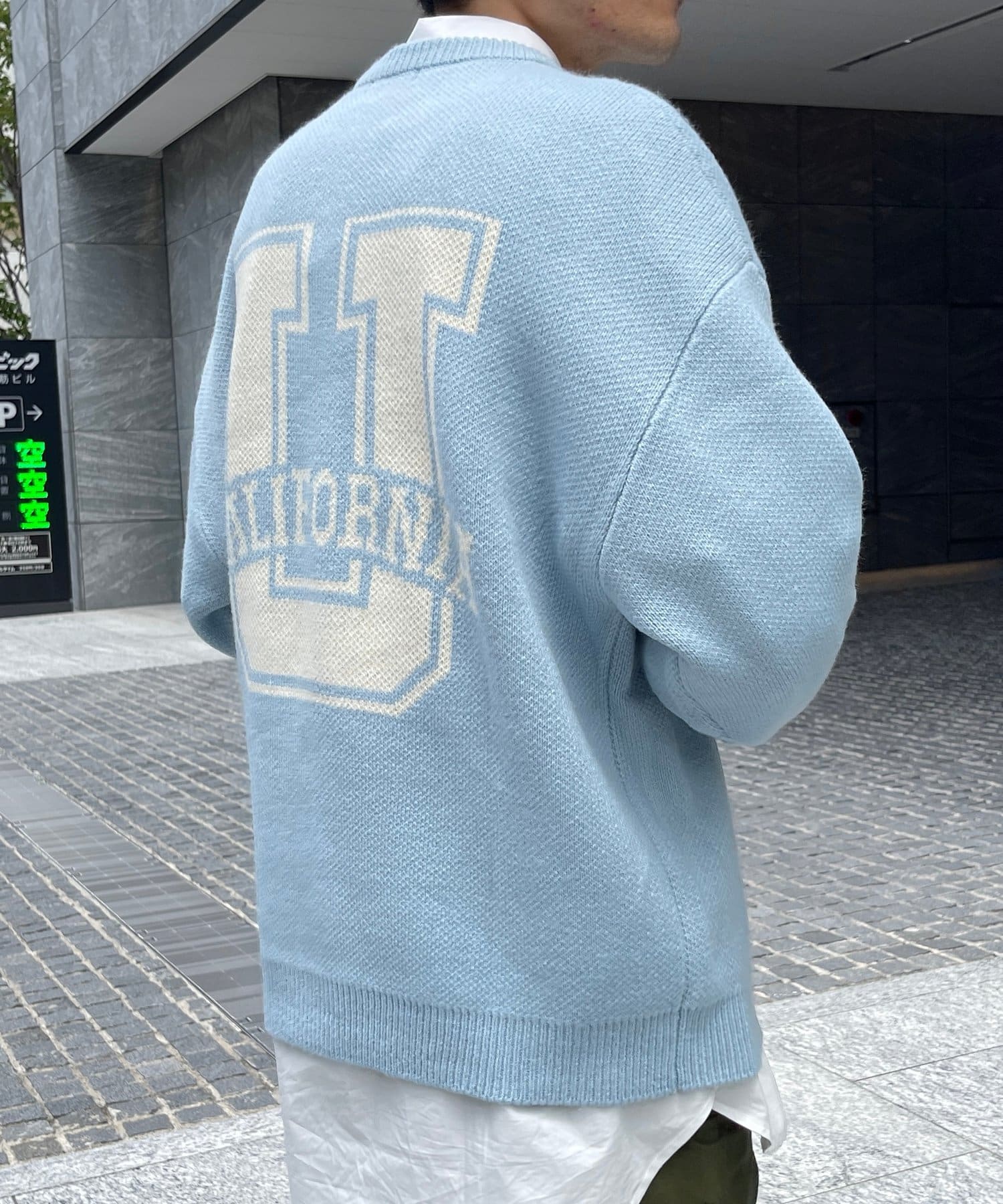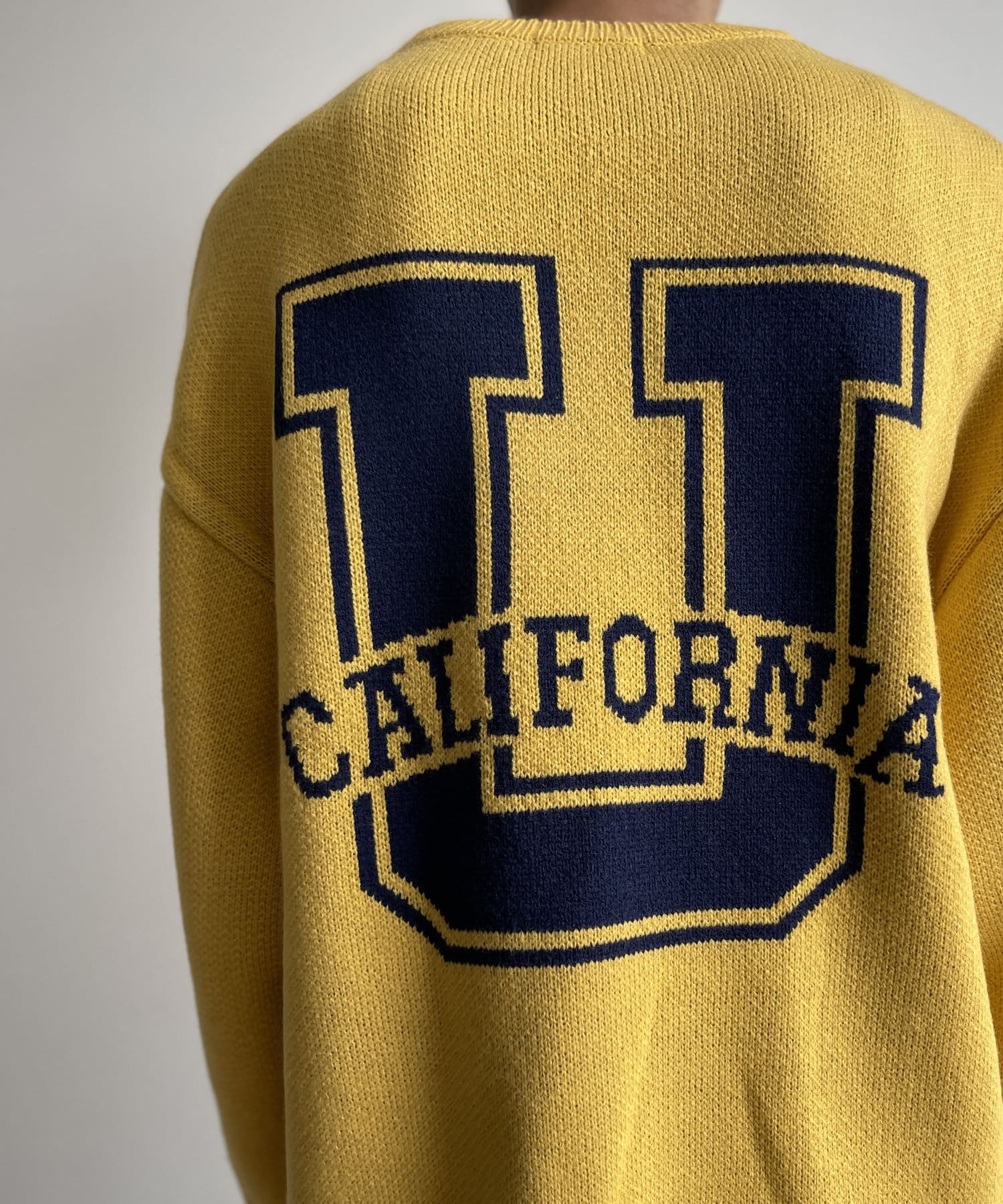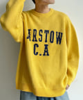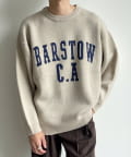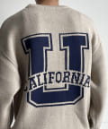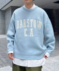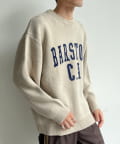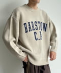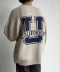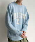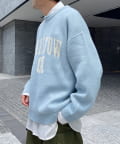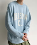前後にポイントになるカレッジロゴをあしらったクルーネックニット