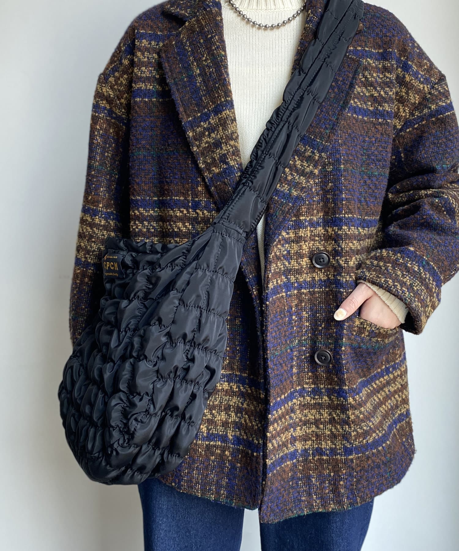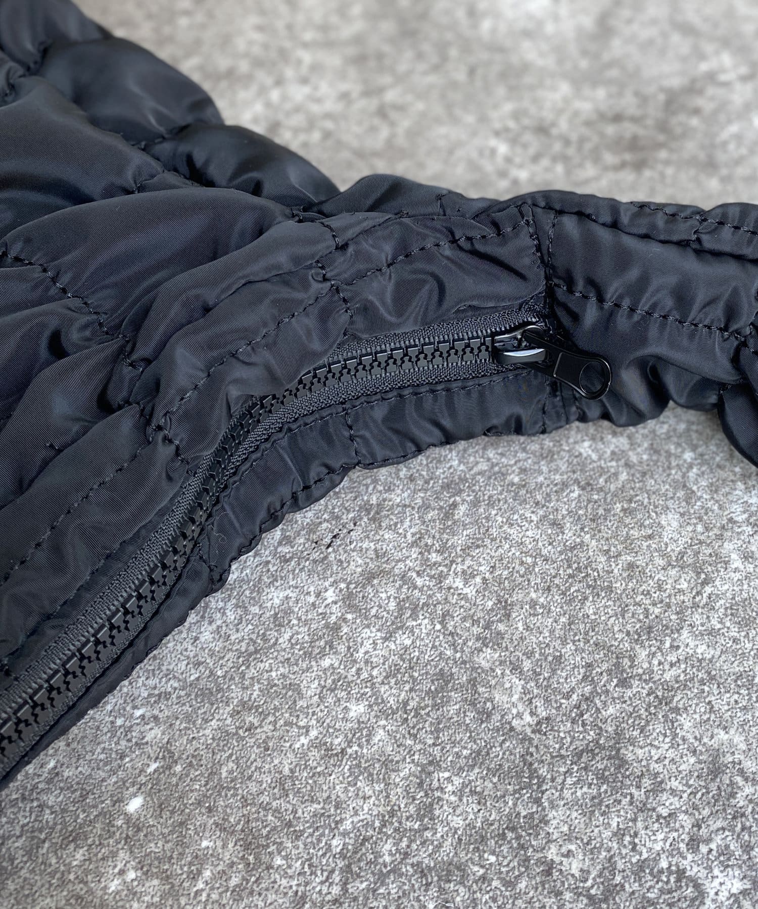 シンプルなワントーンのキルティング素材なので、いつものコーディネートにも合わせやすいアイテムです。
