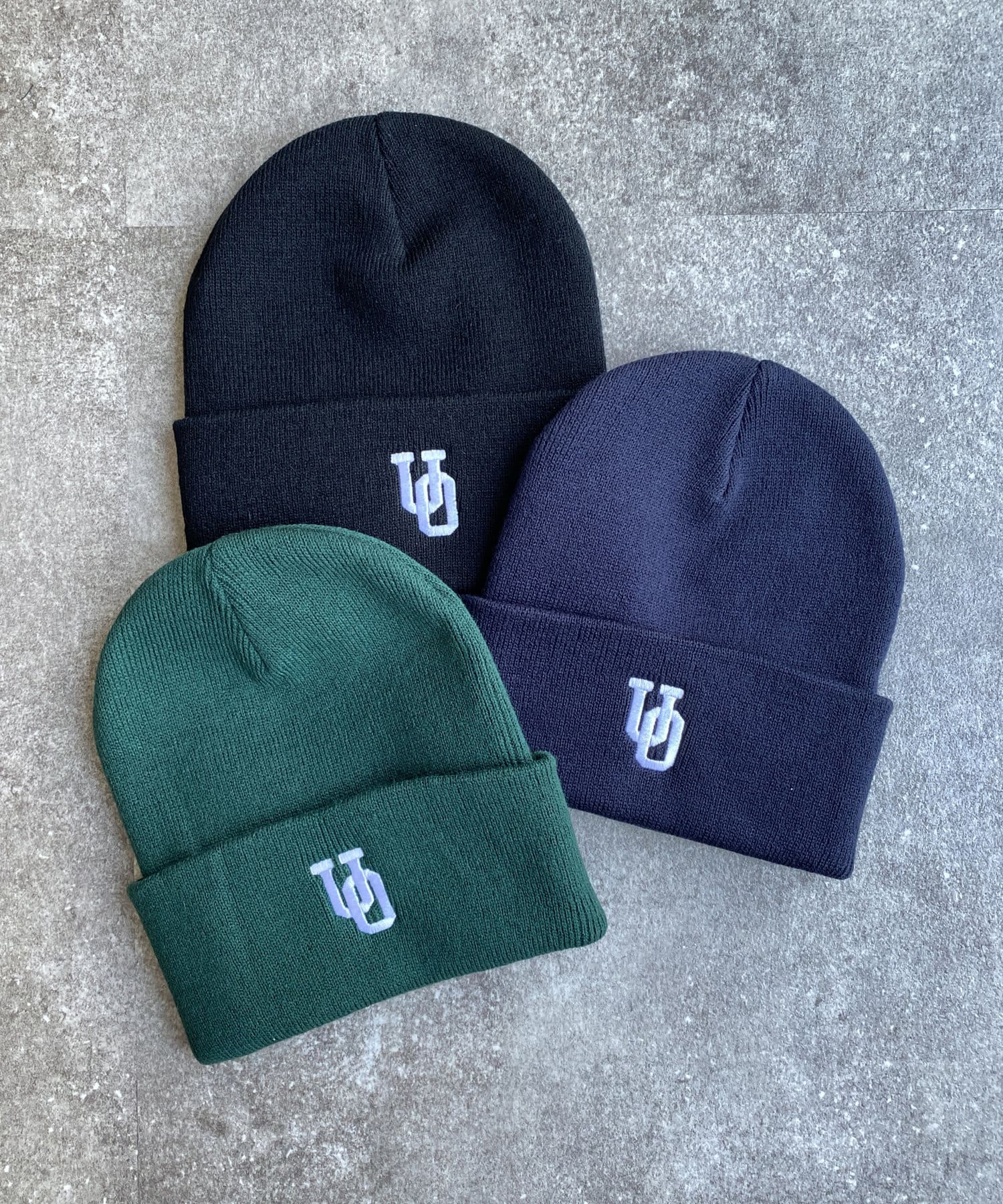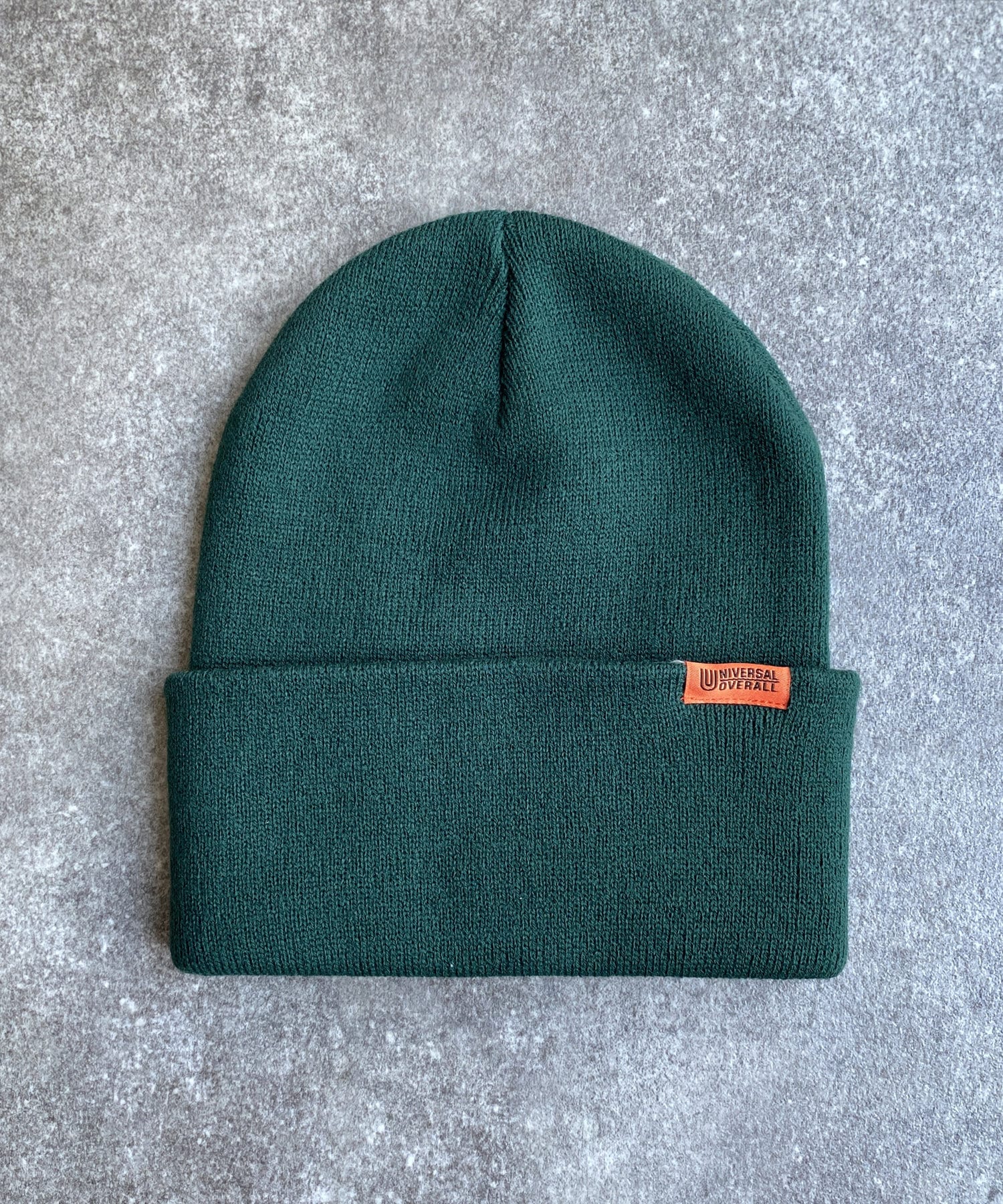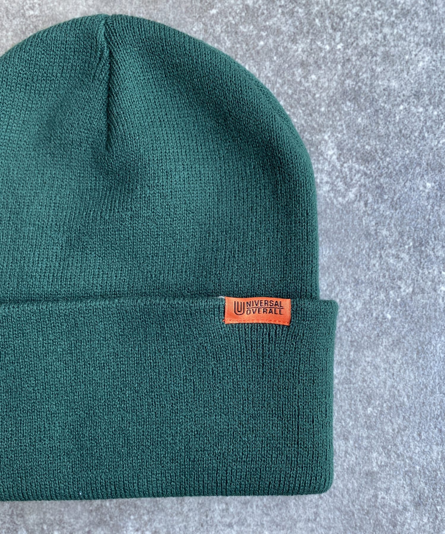 ブランドロゴを配置したUNIVERSAL OVERALLのニットキャップ。