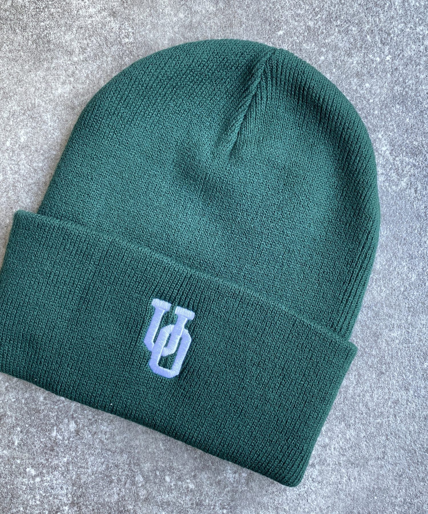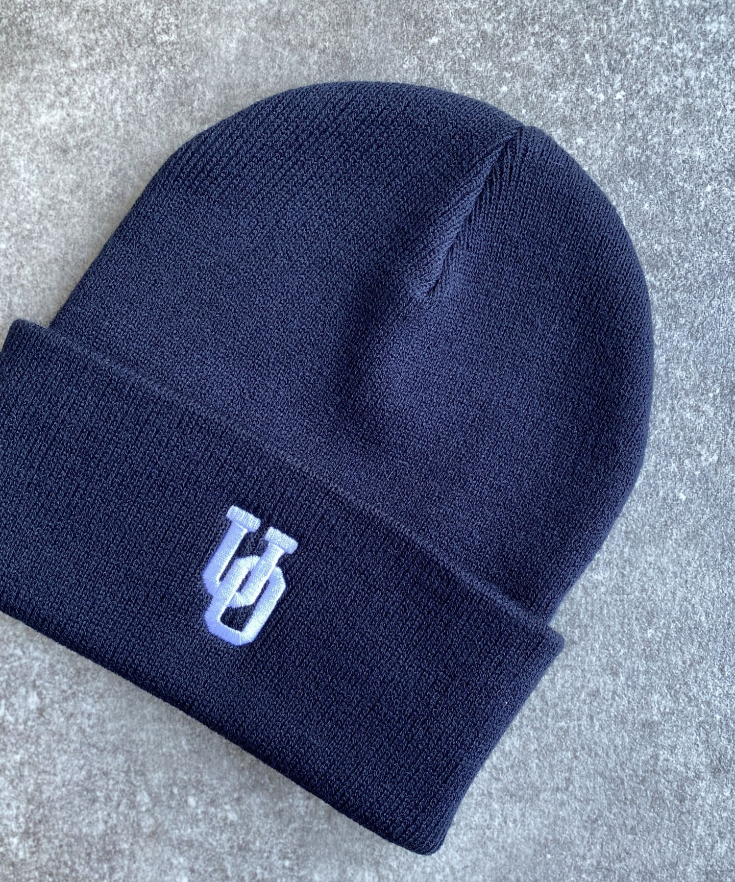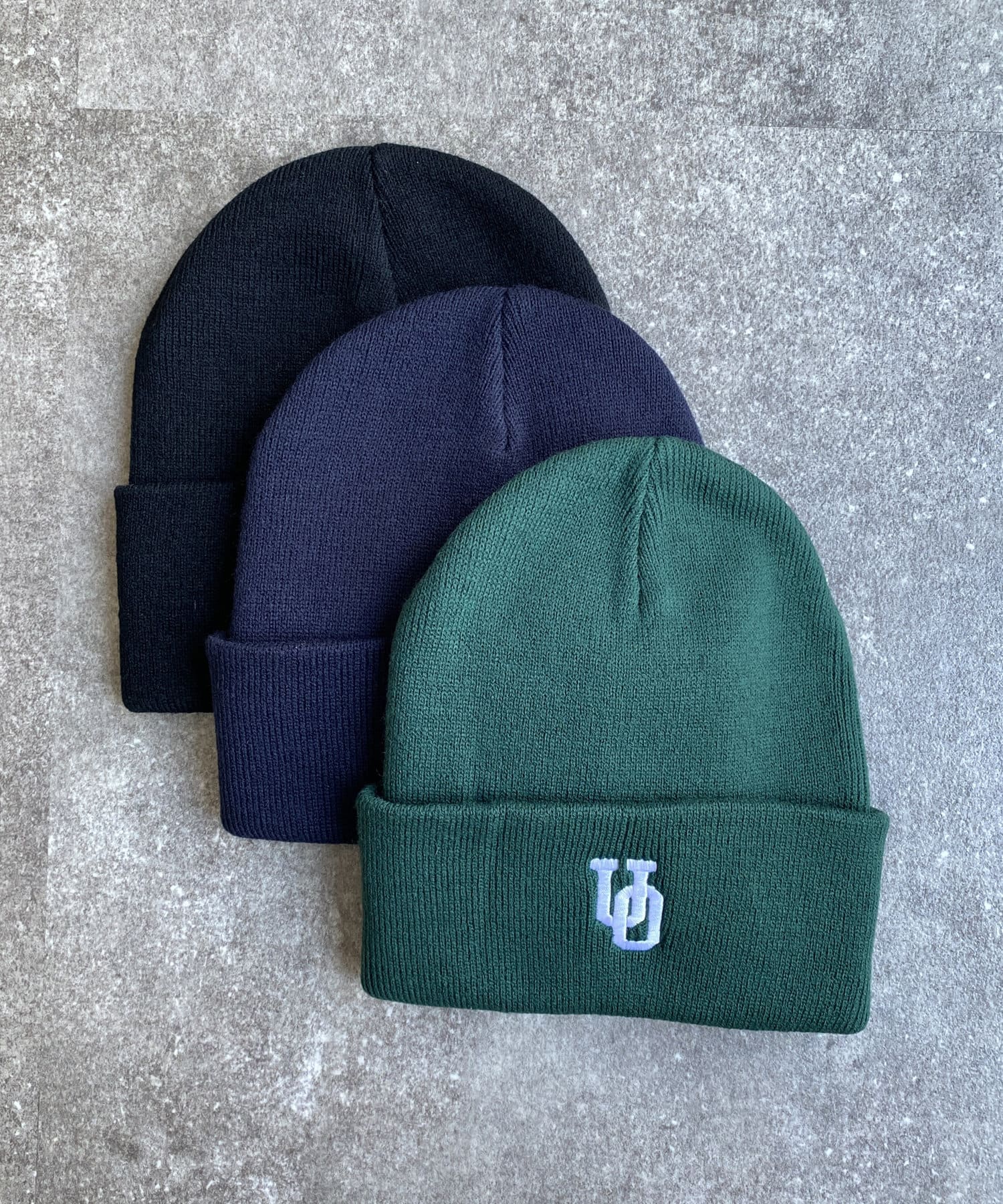 ブランドロゴを配置したUNIVERSAL OVERALLのニットキャップ。