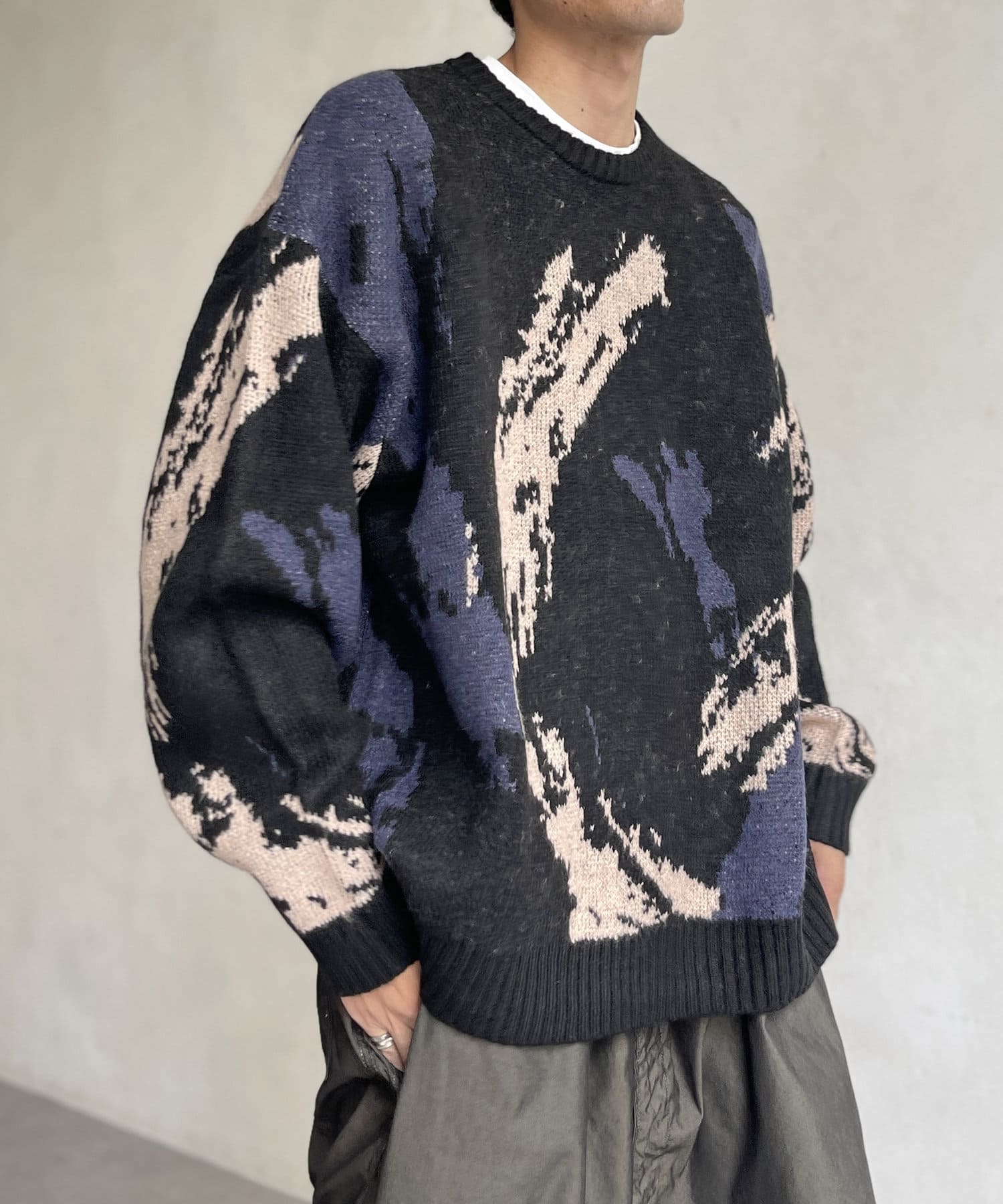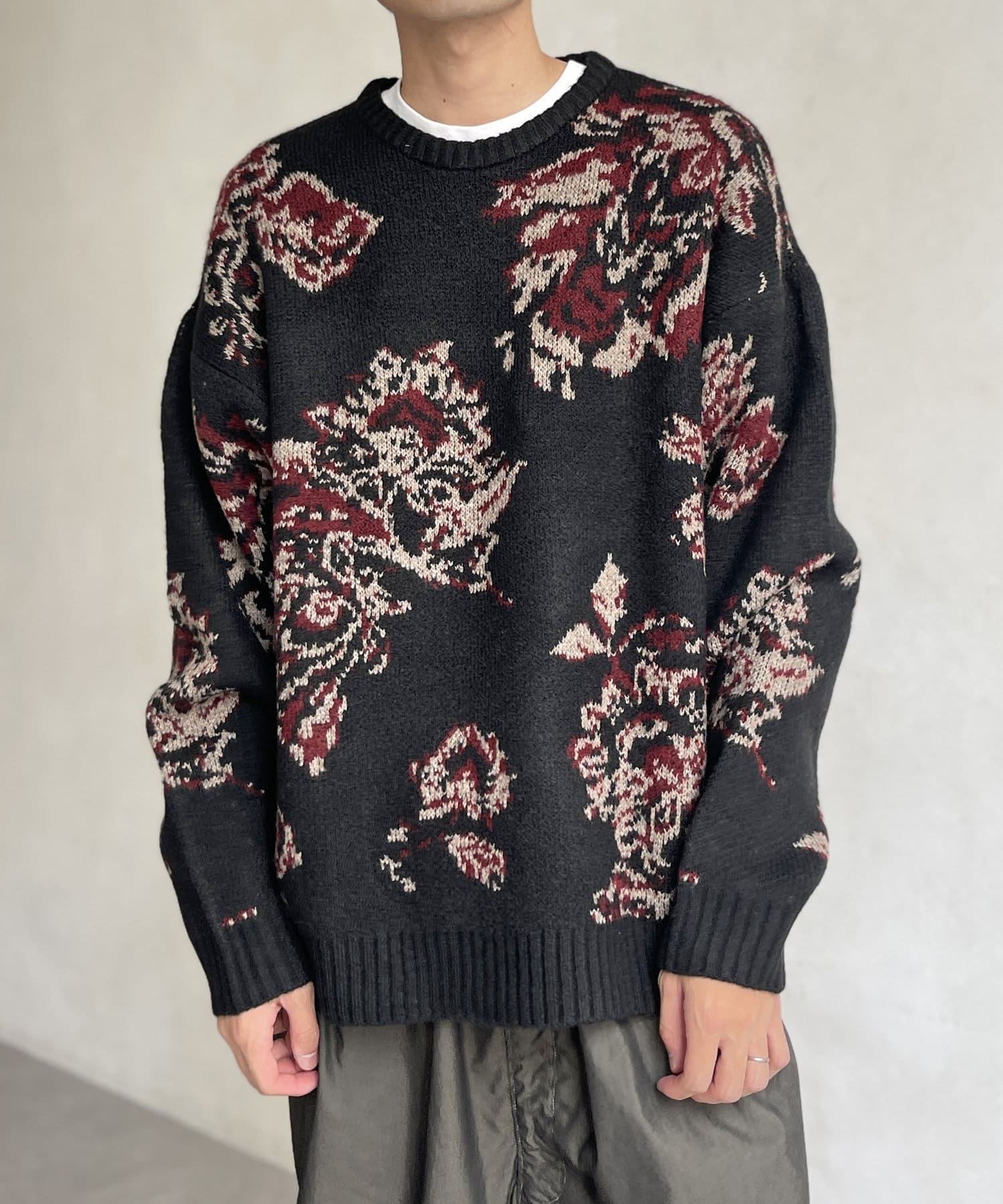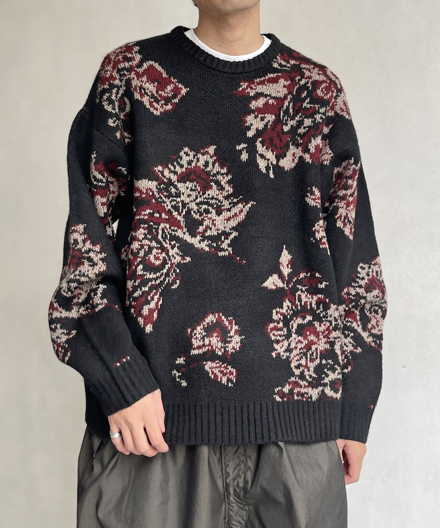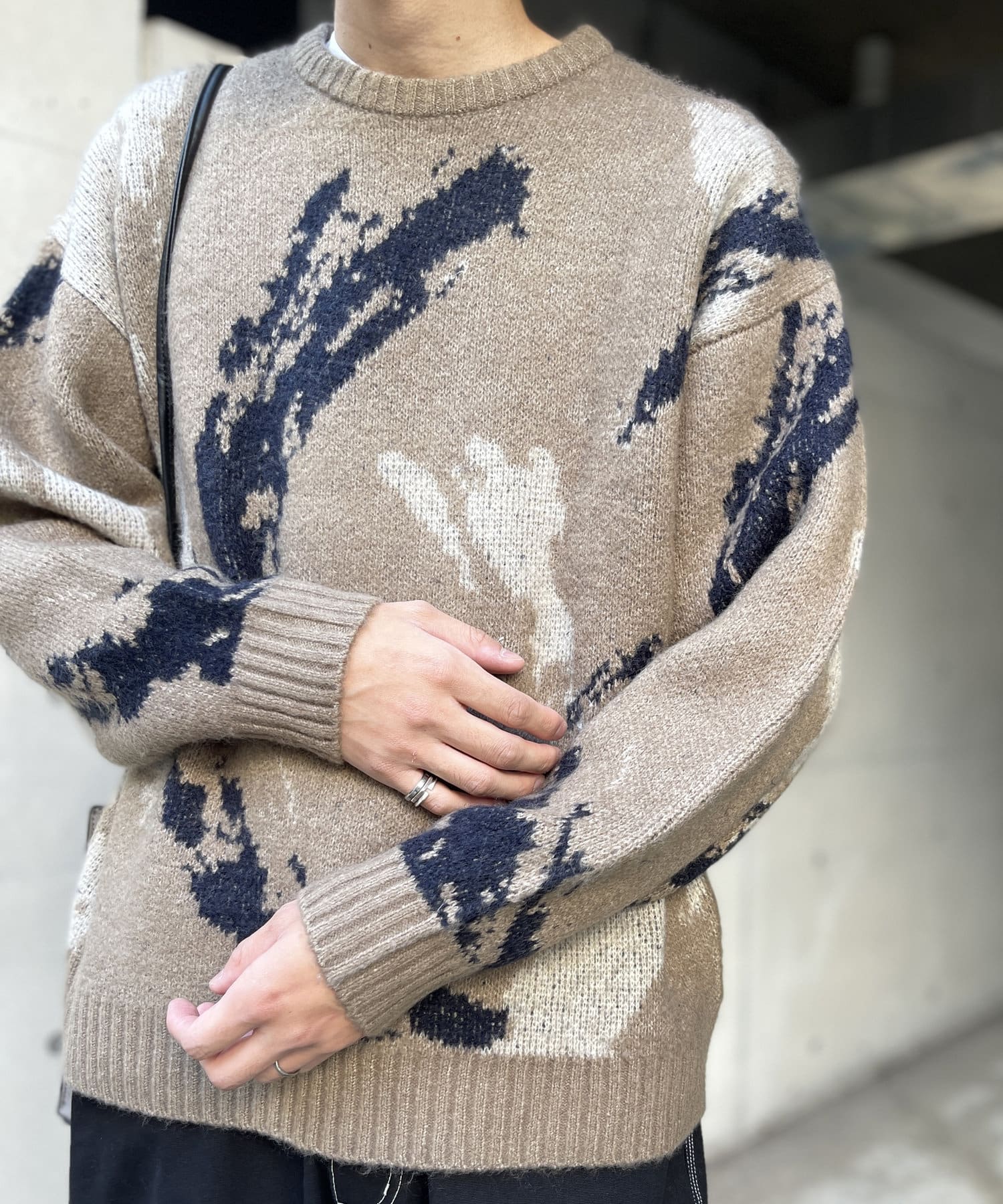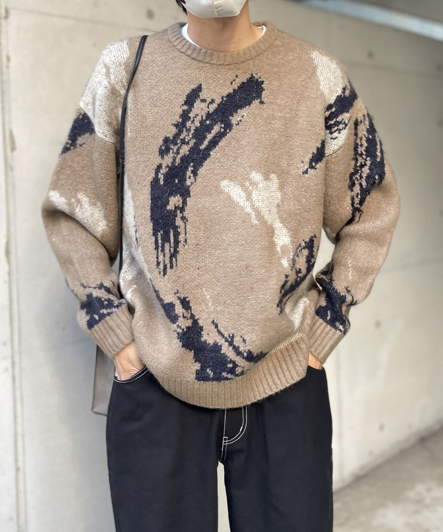ペイント柄とペイズリー柄がコーディネートをより印象的にしてくれ、1枚でスタイリング映えするジャガードニット。