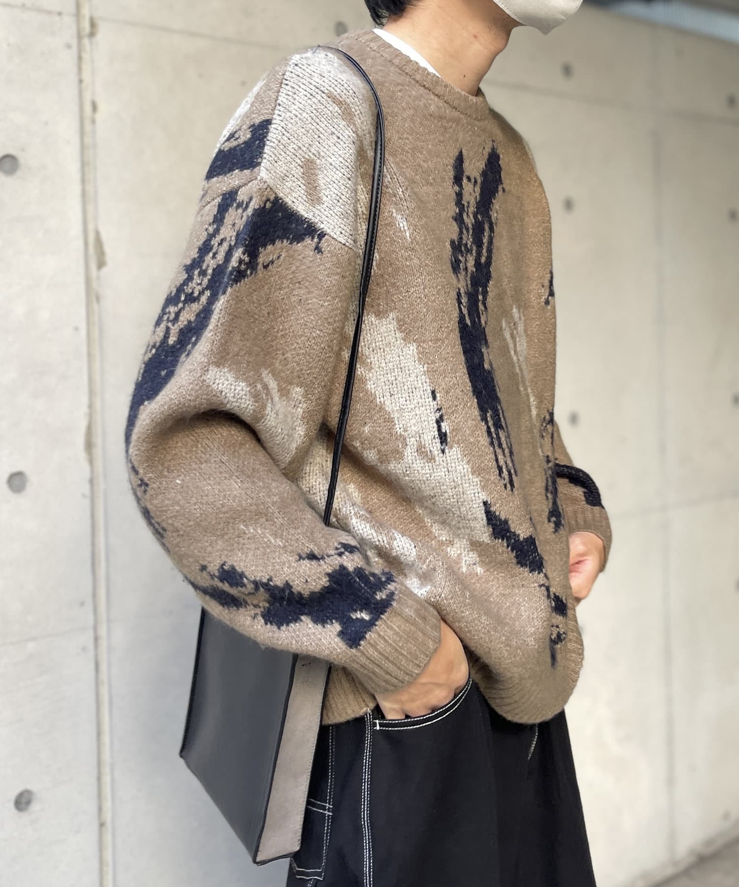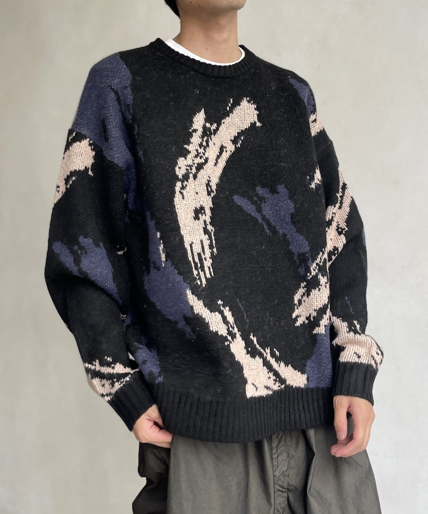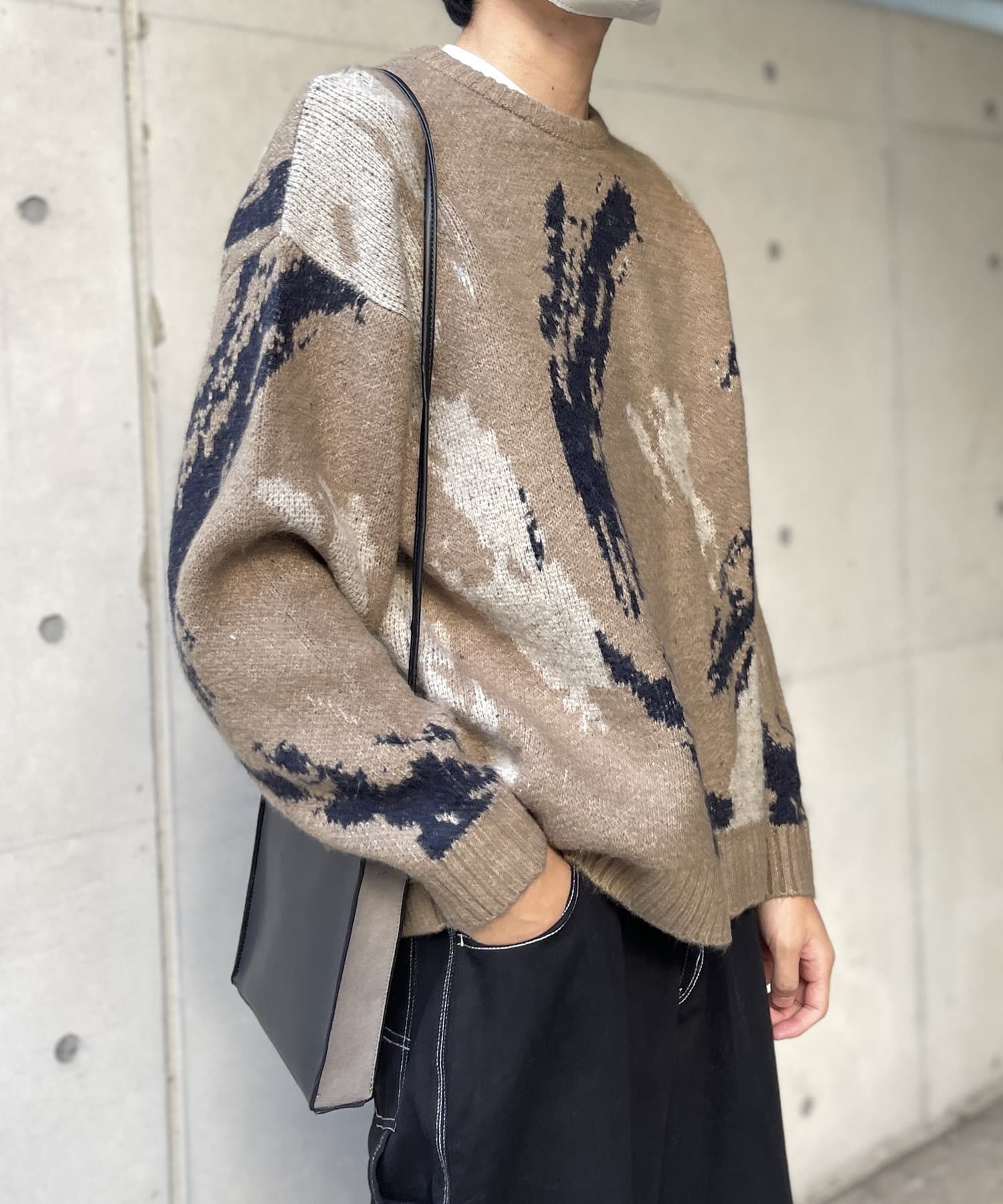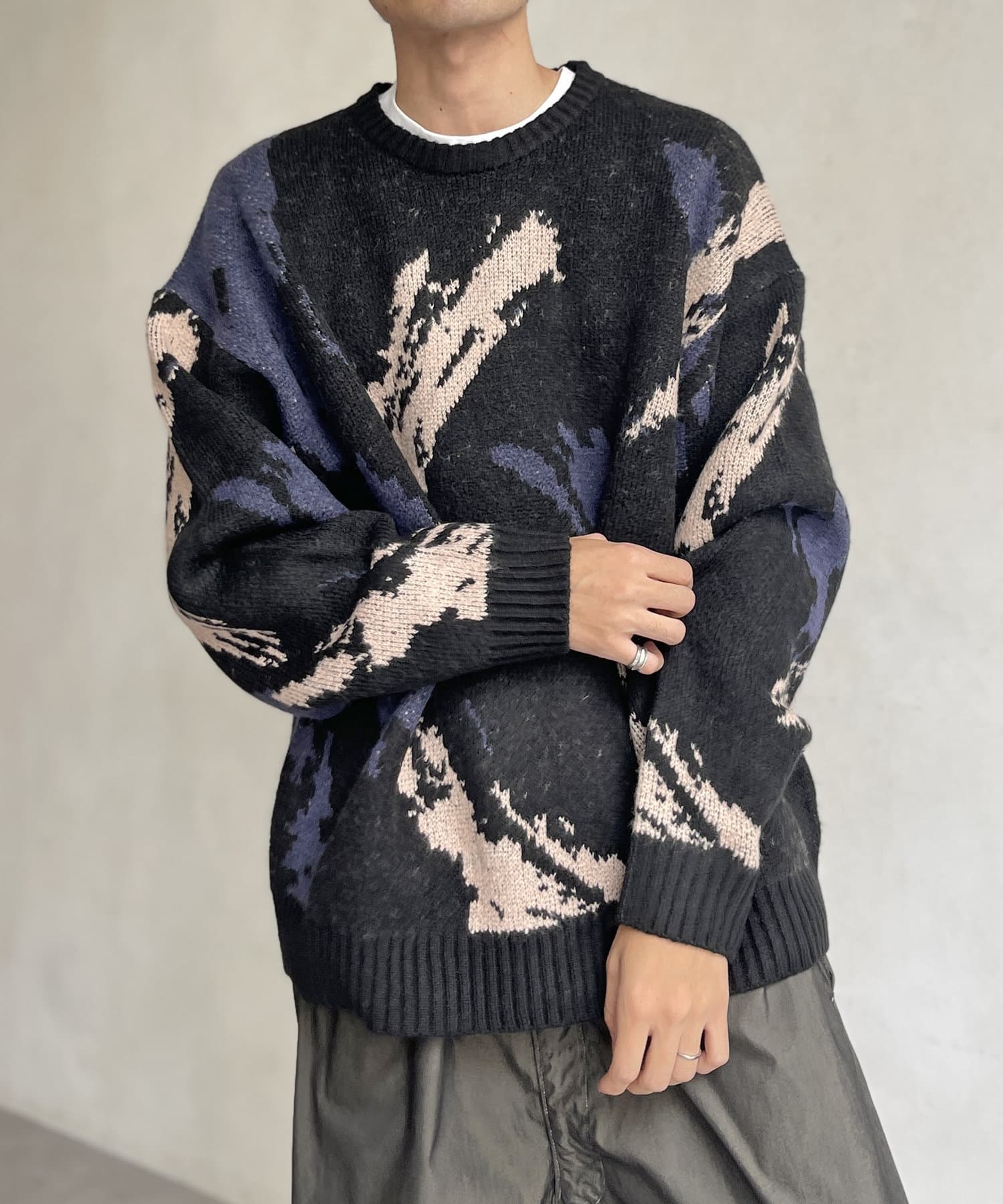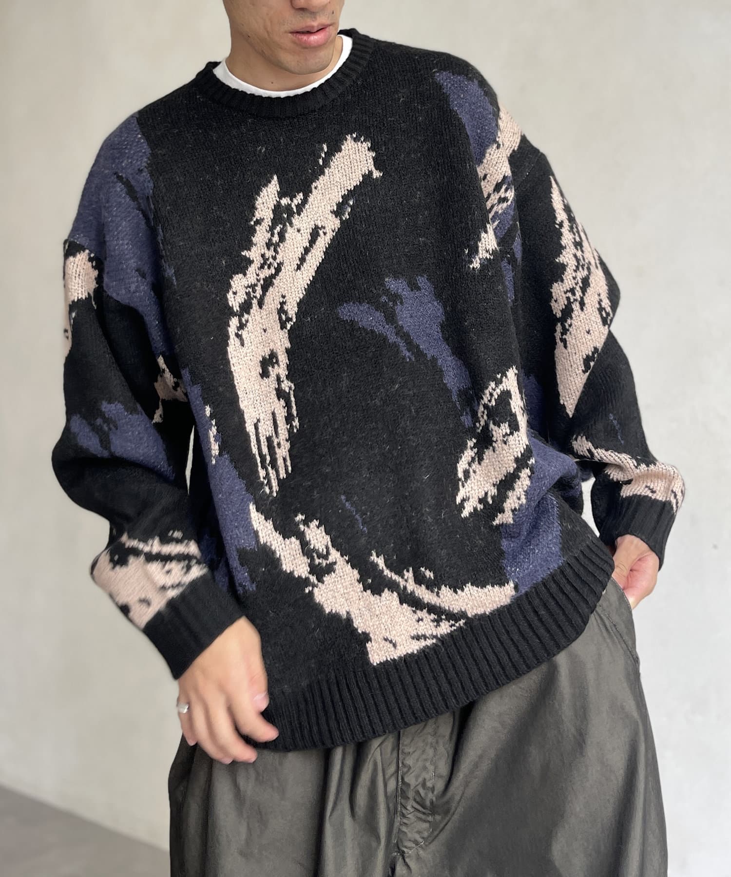ペイント柄とペイズリー柄がコーディネートをより印象的にしてくれ、1枚でスタイリング映えするジャガードニット。