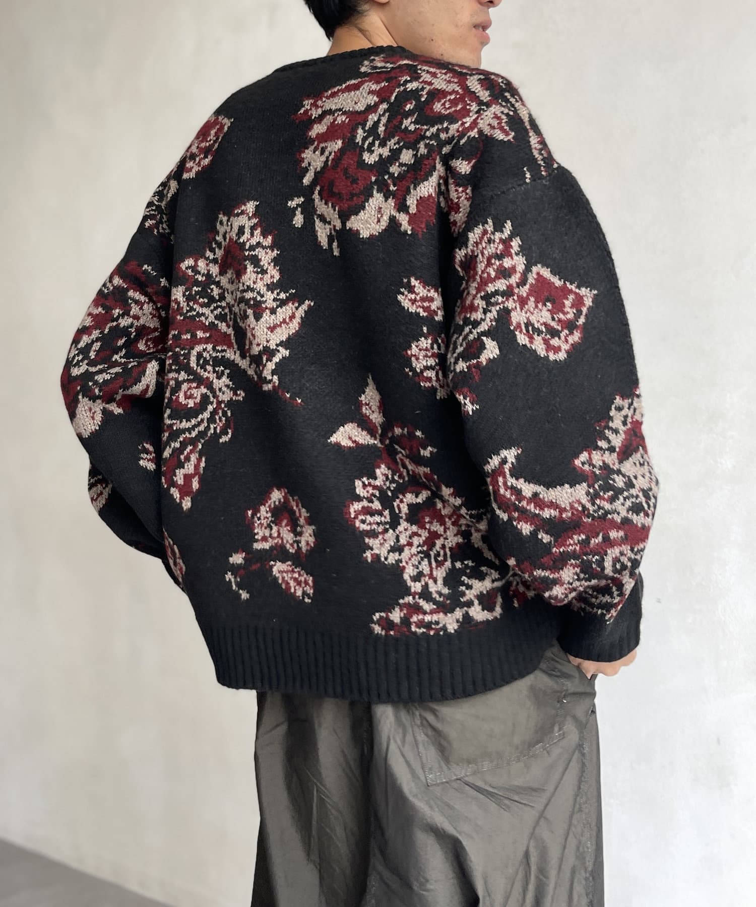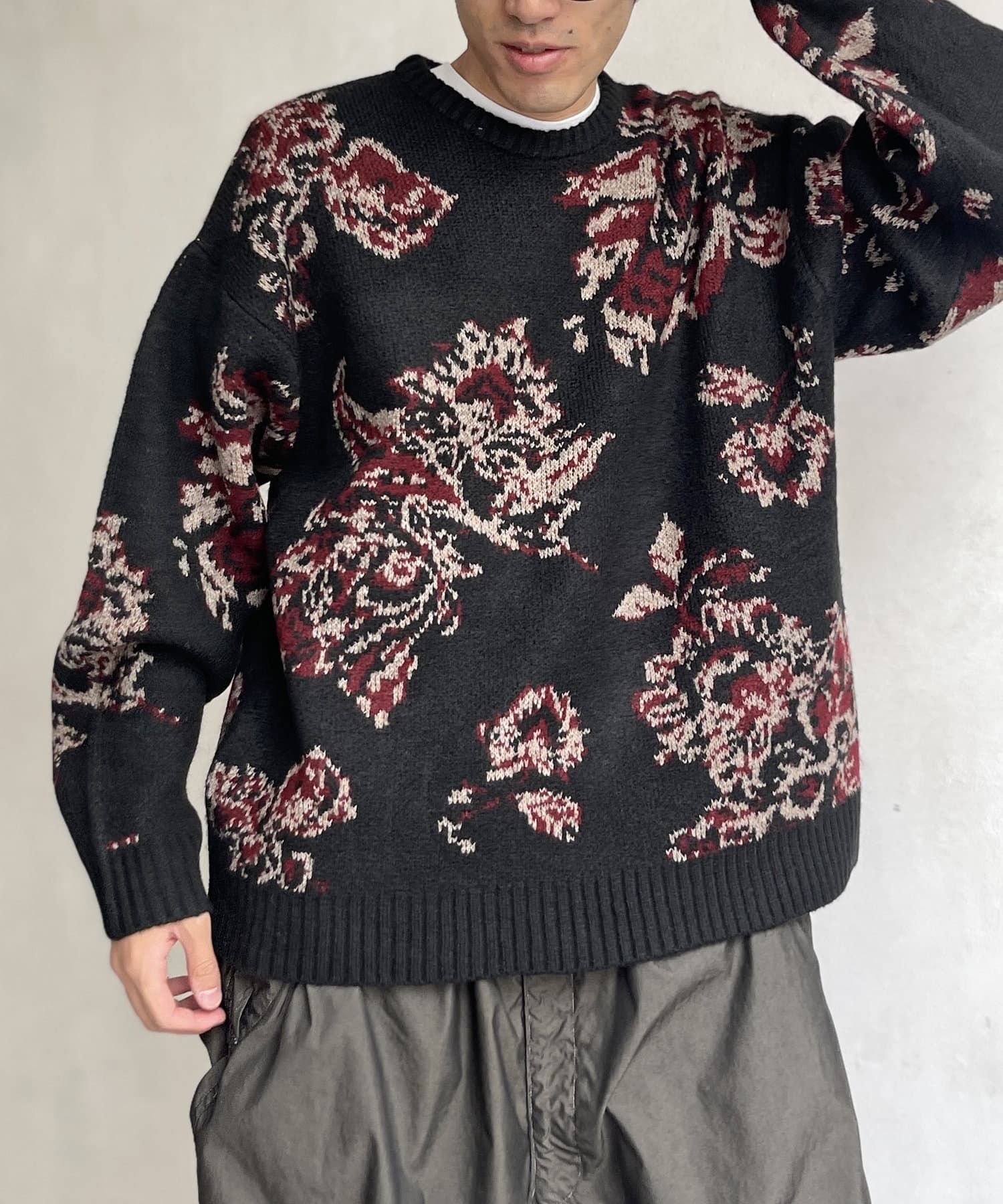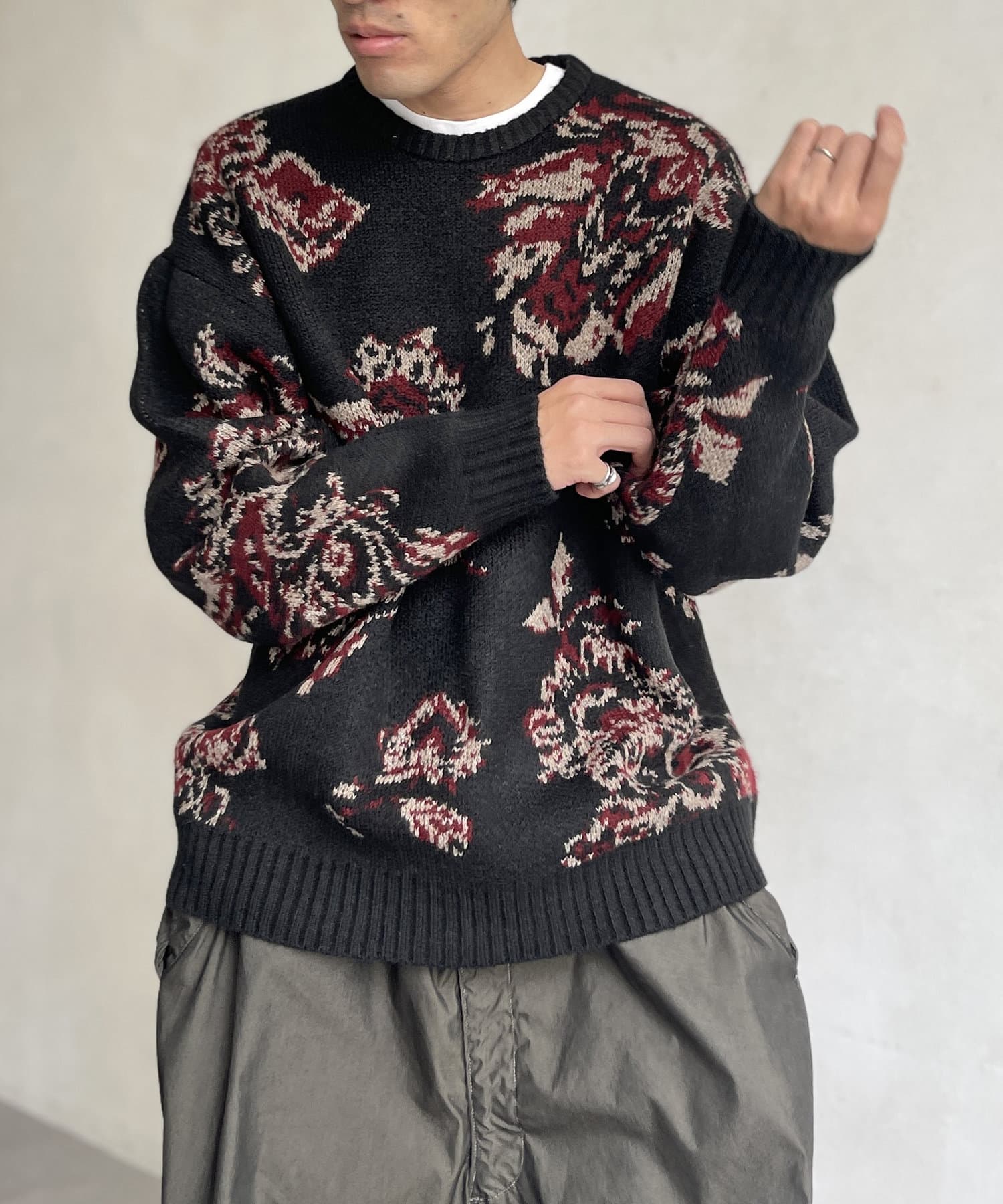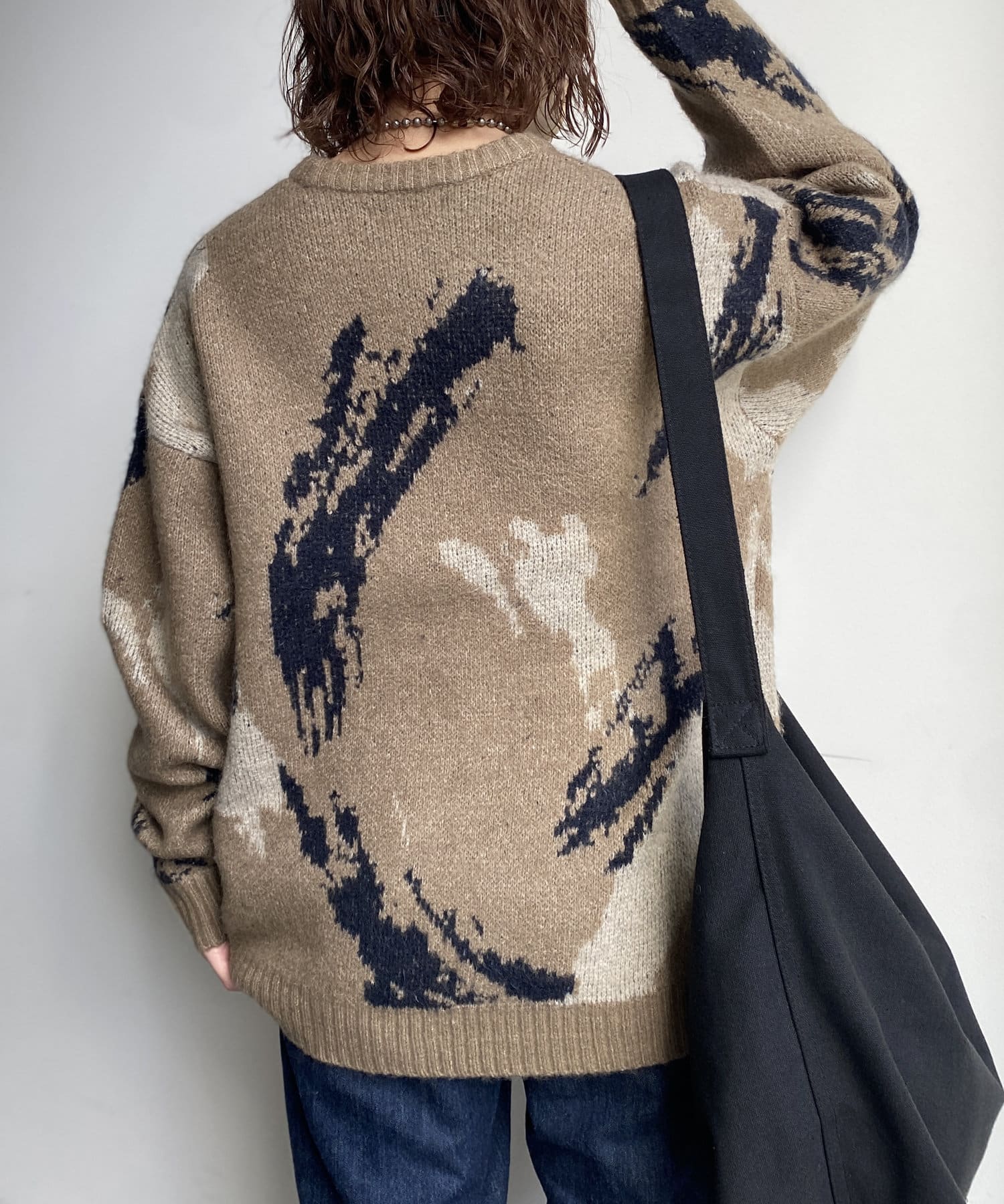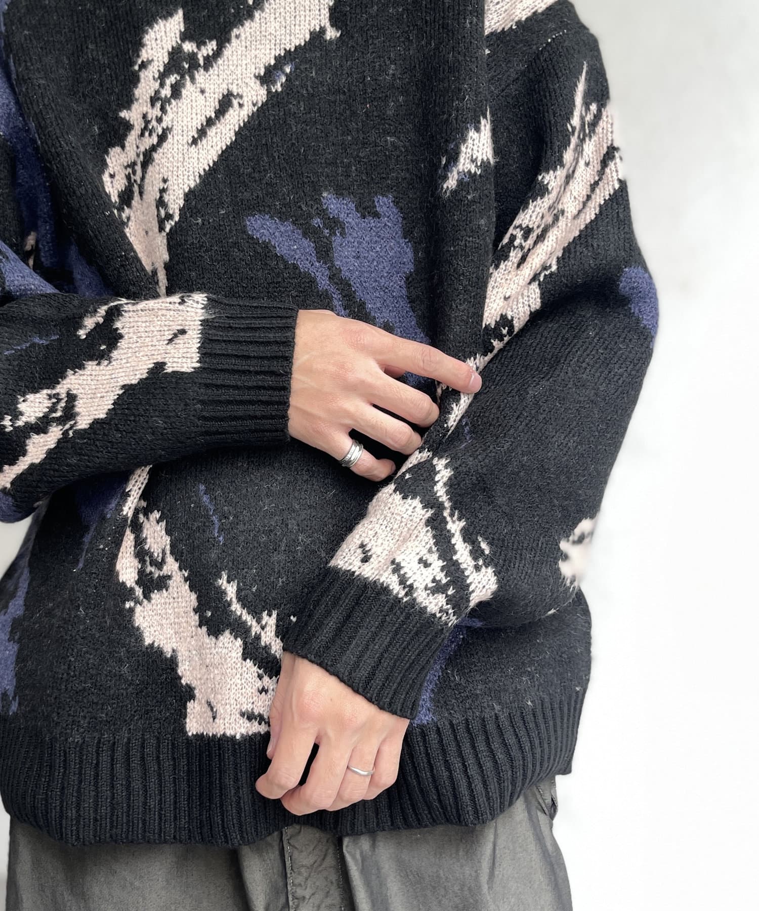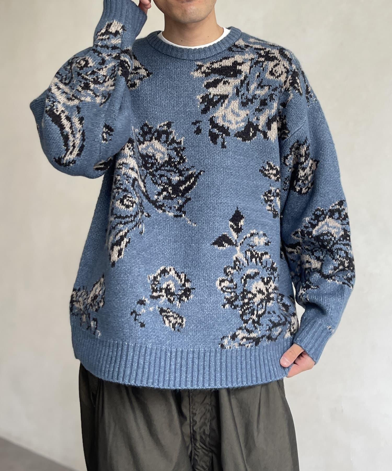 ペイント柄とペイズリー柄がコーディネートをより印象的にしてくれ、1枚でスタイリング映えするジャガードニット。