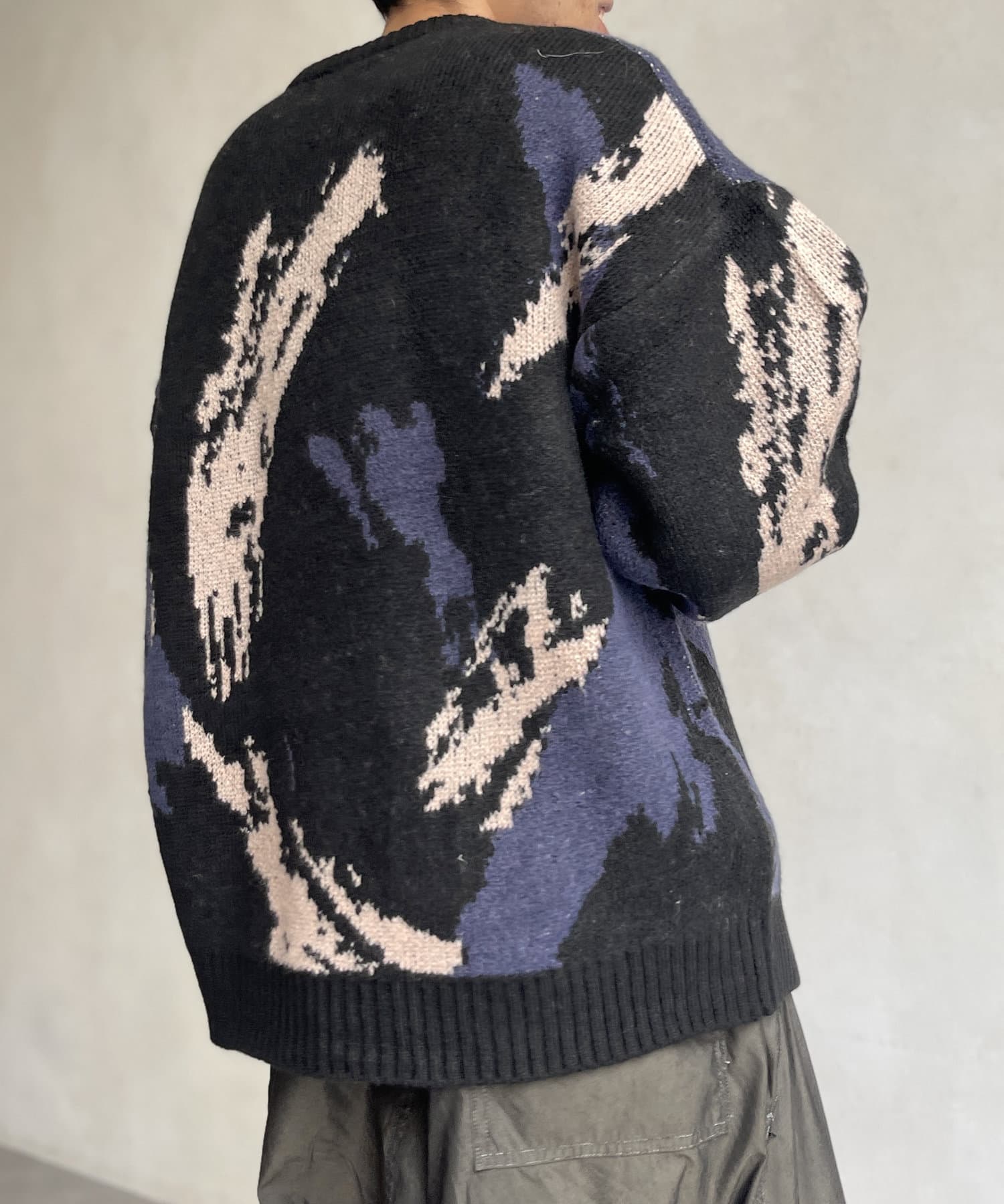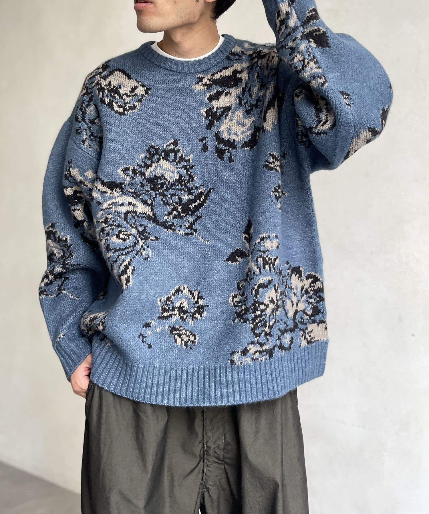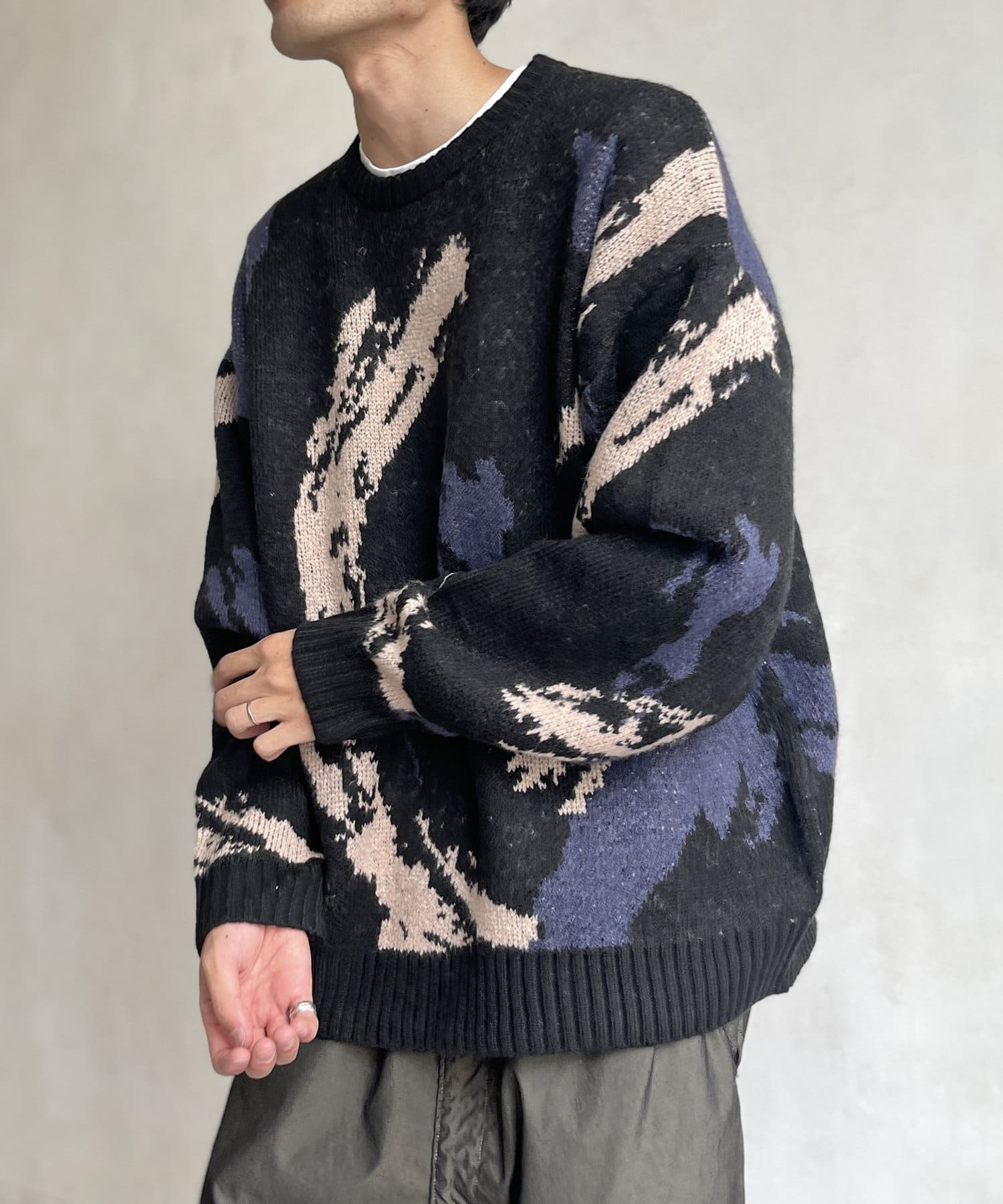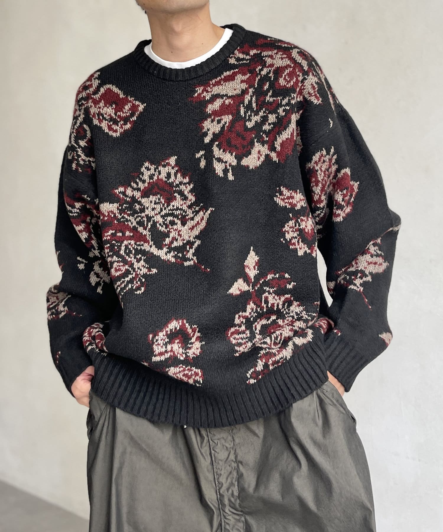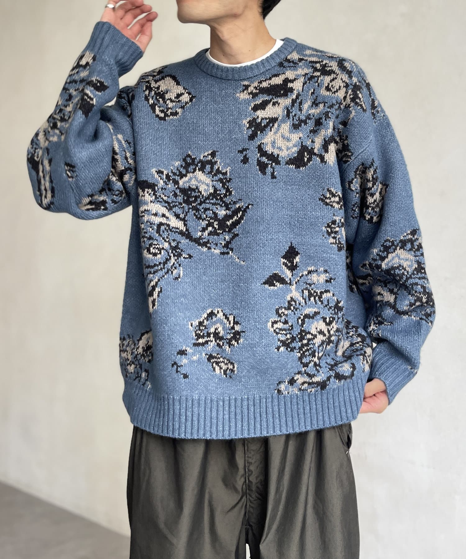 ペイント柄とペイズリー柄がコーディネートをより印象的にしてくれ、1枚でスタイリング映えするジャガードニット。