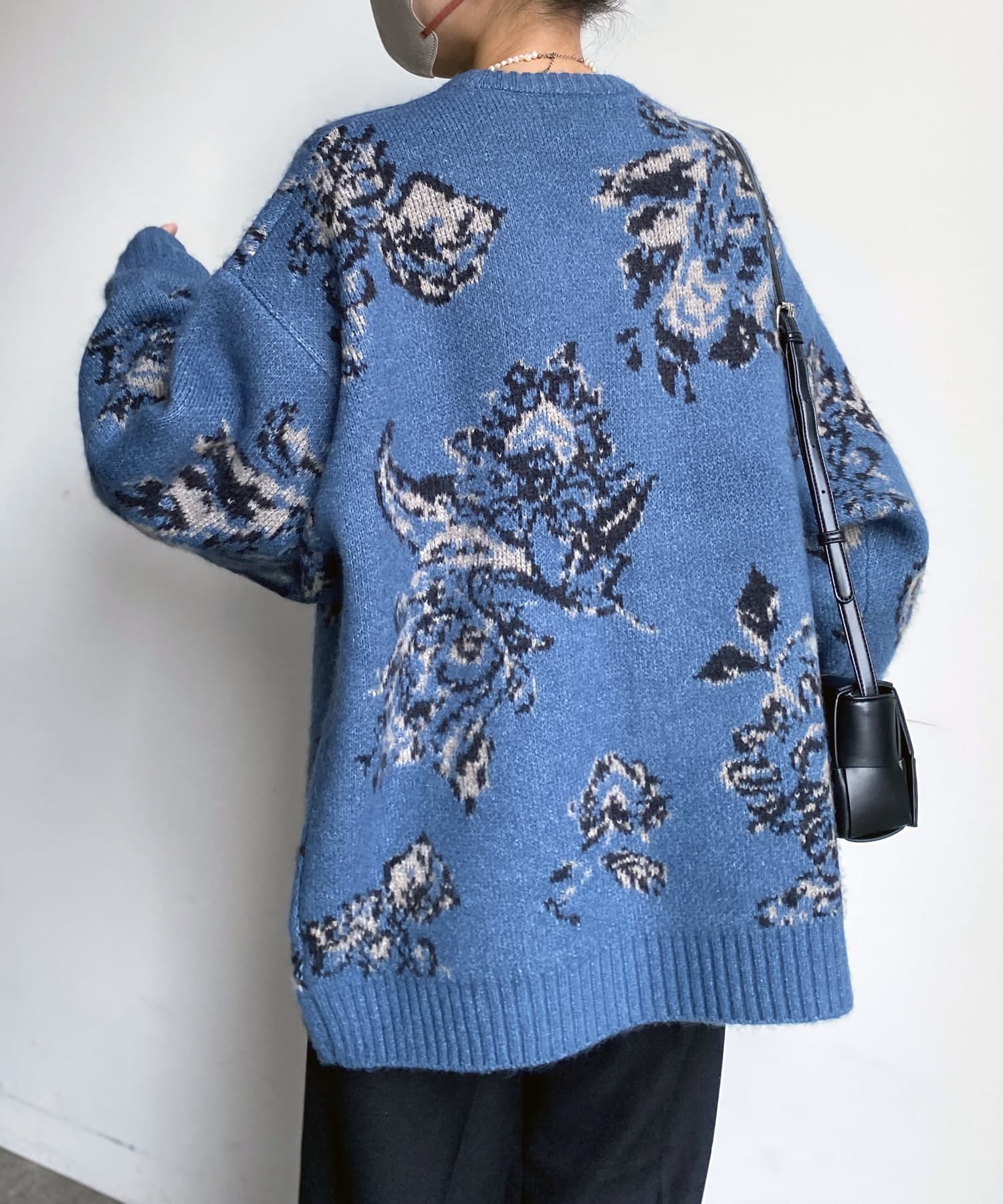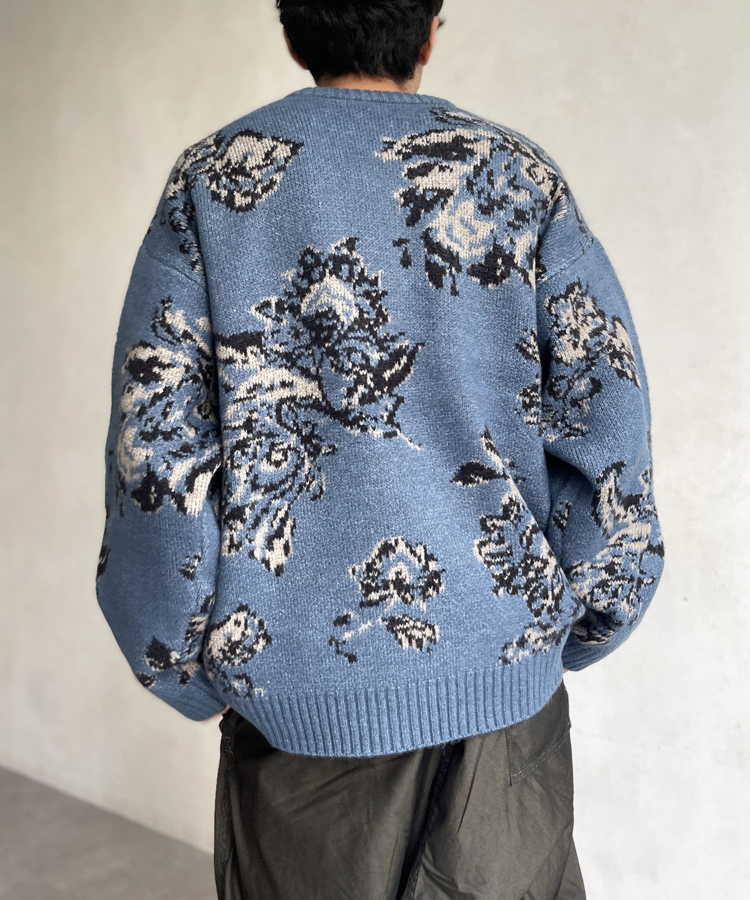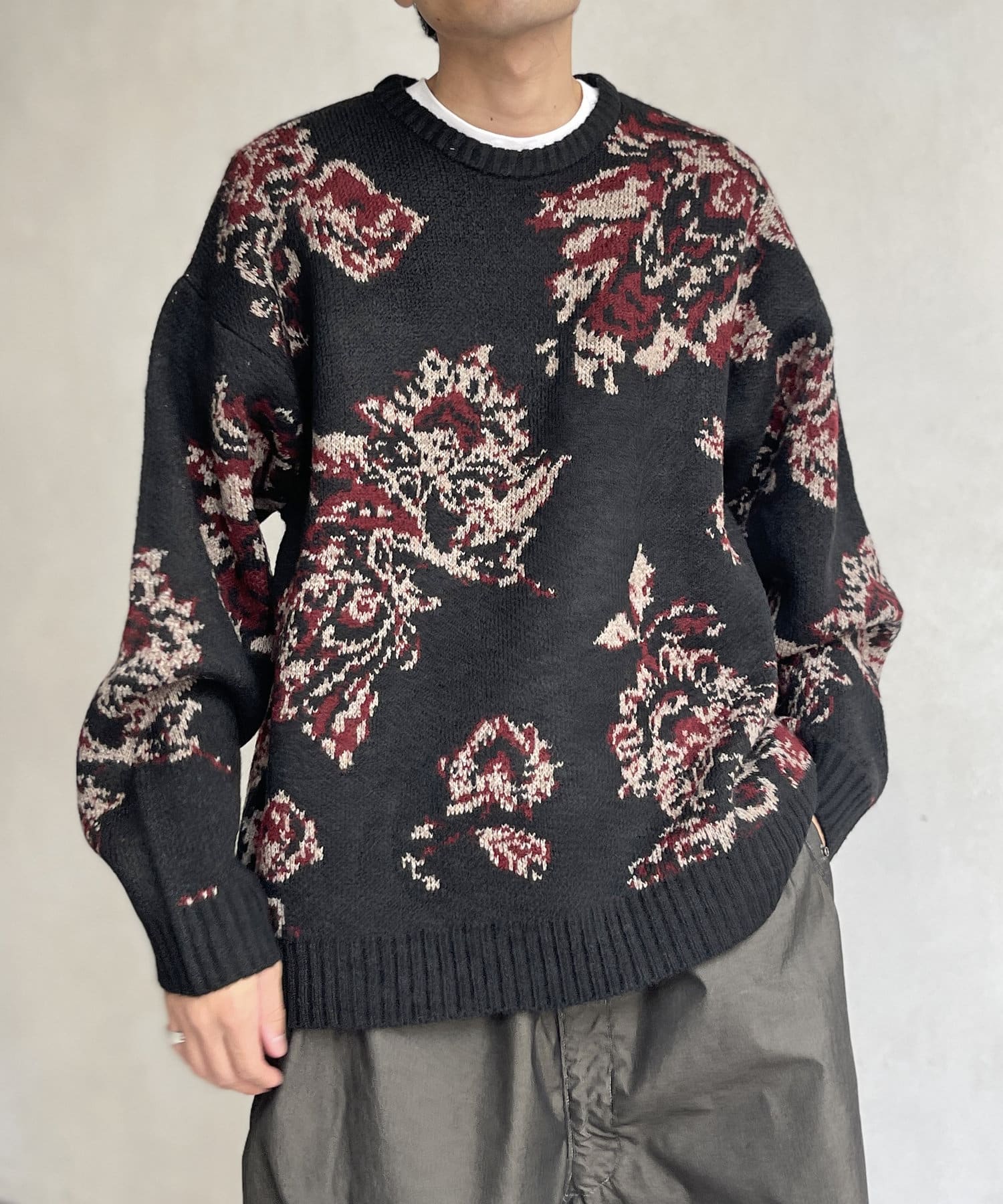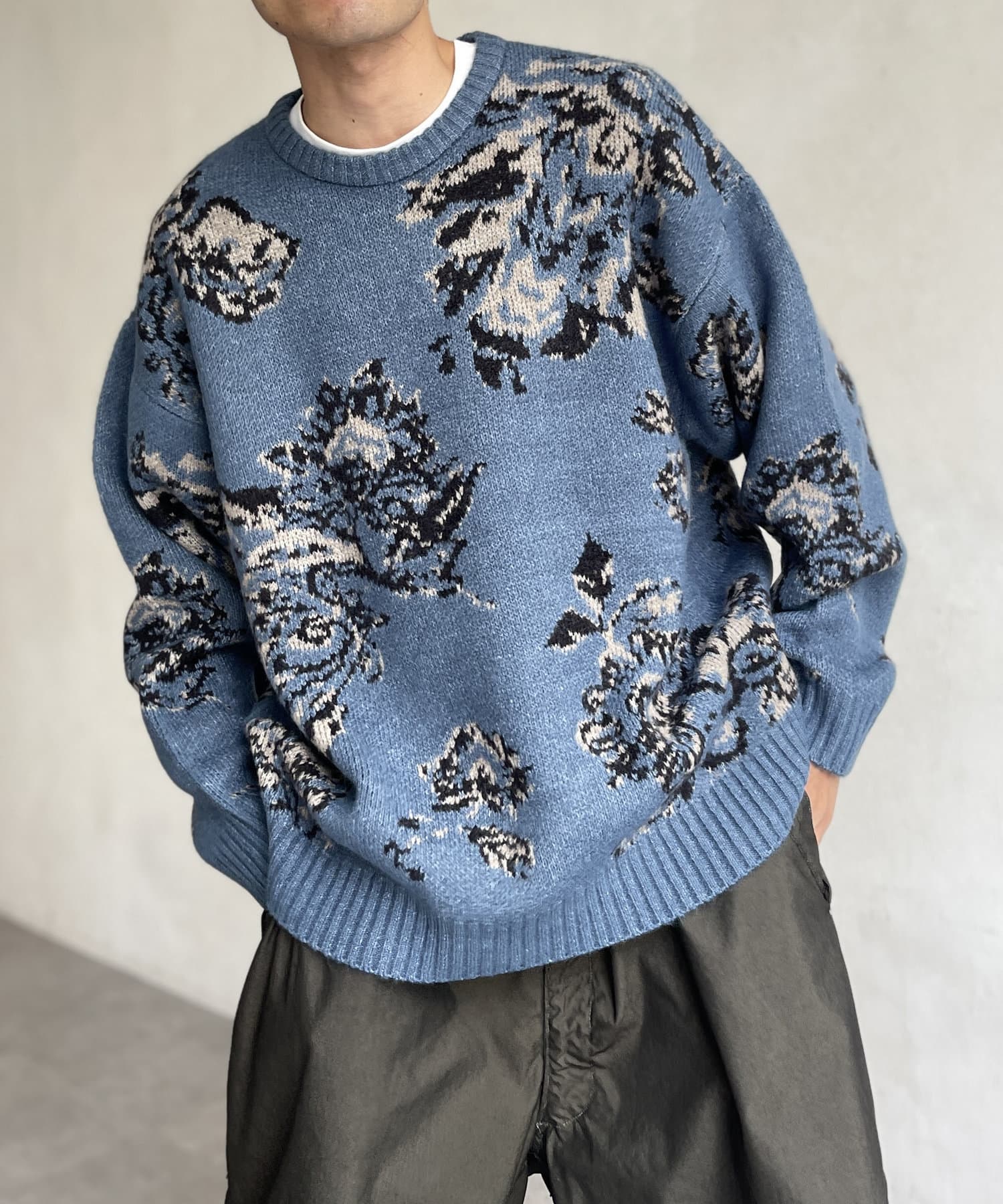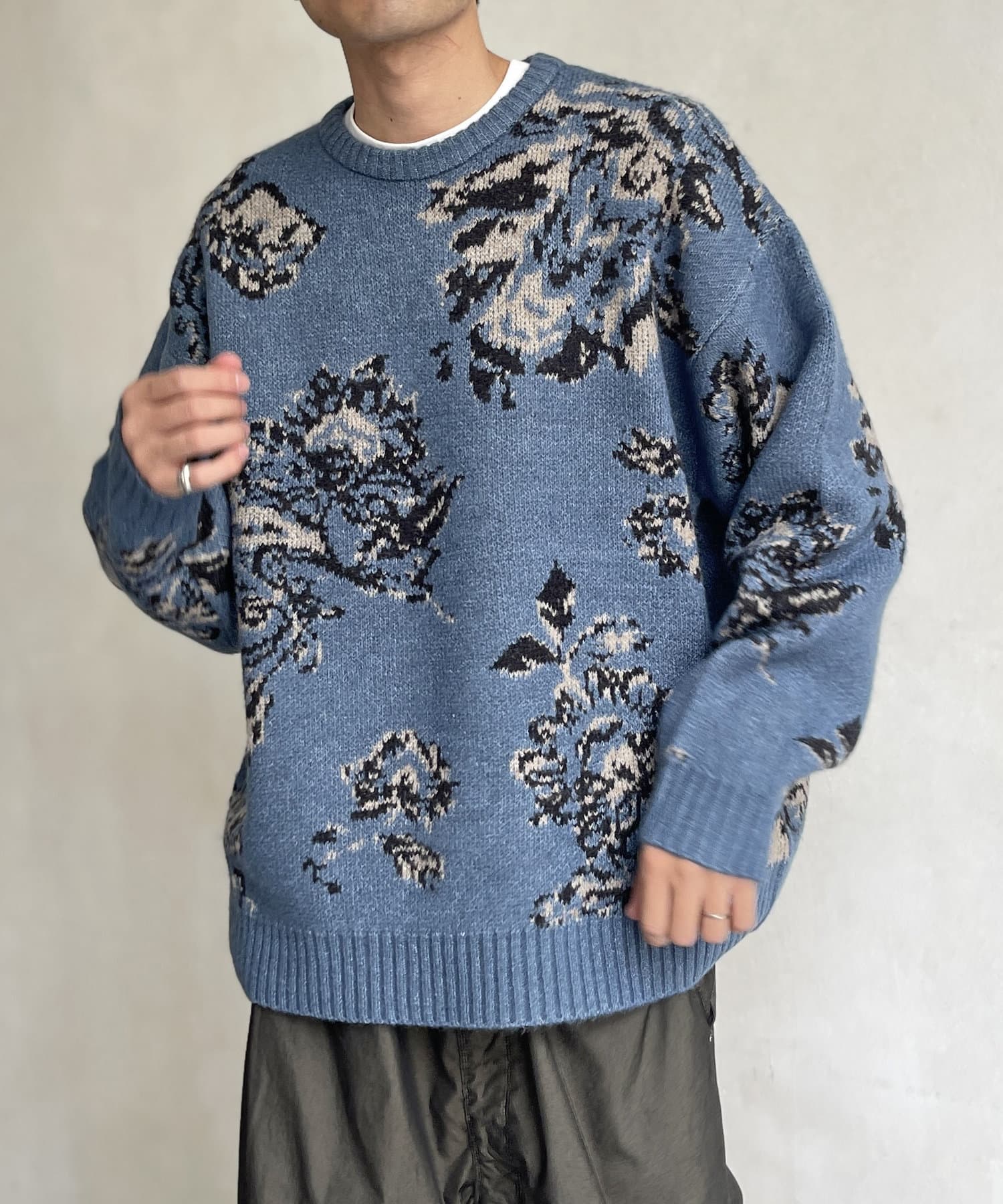 ペイント柄とペイズリー柄がコーディネートをより印象的にしてくれ、1枚でスタイリング映えするジャガードニット。