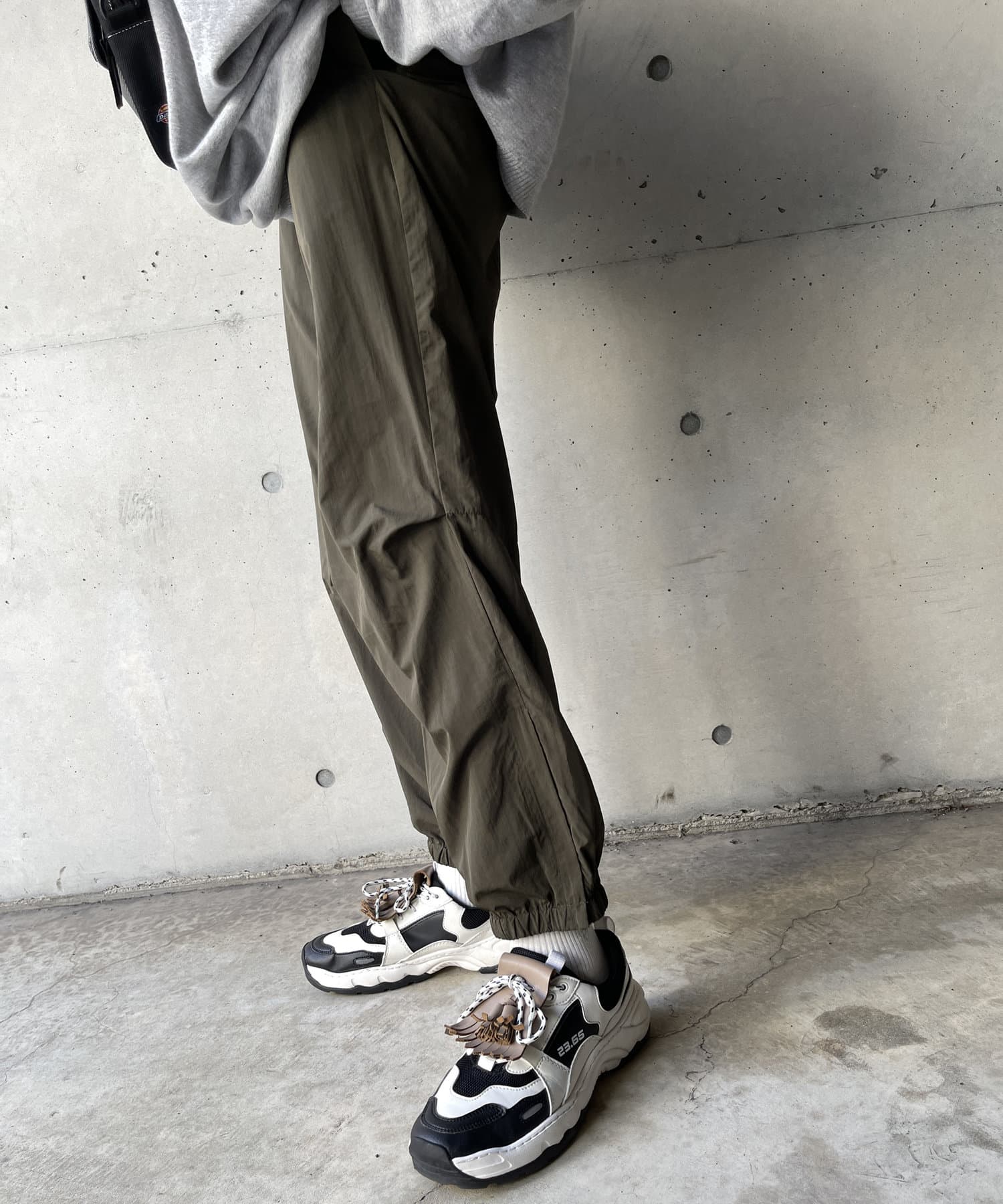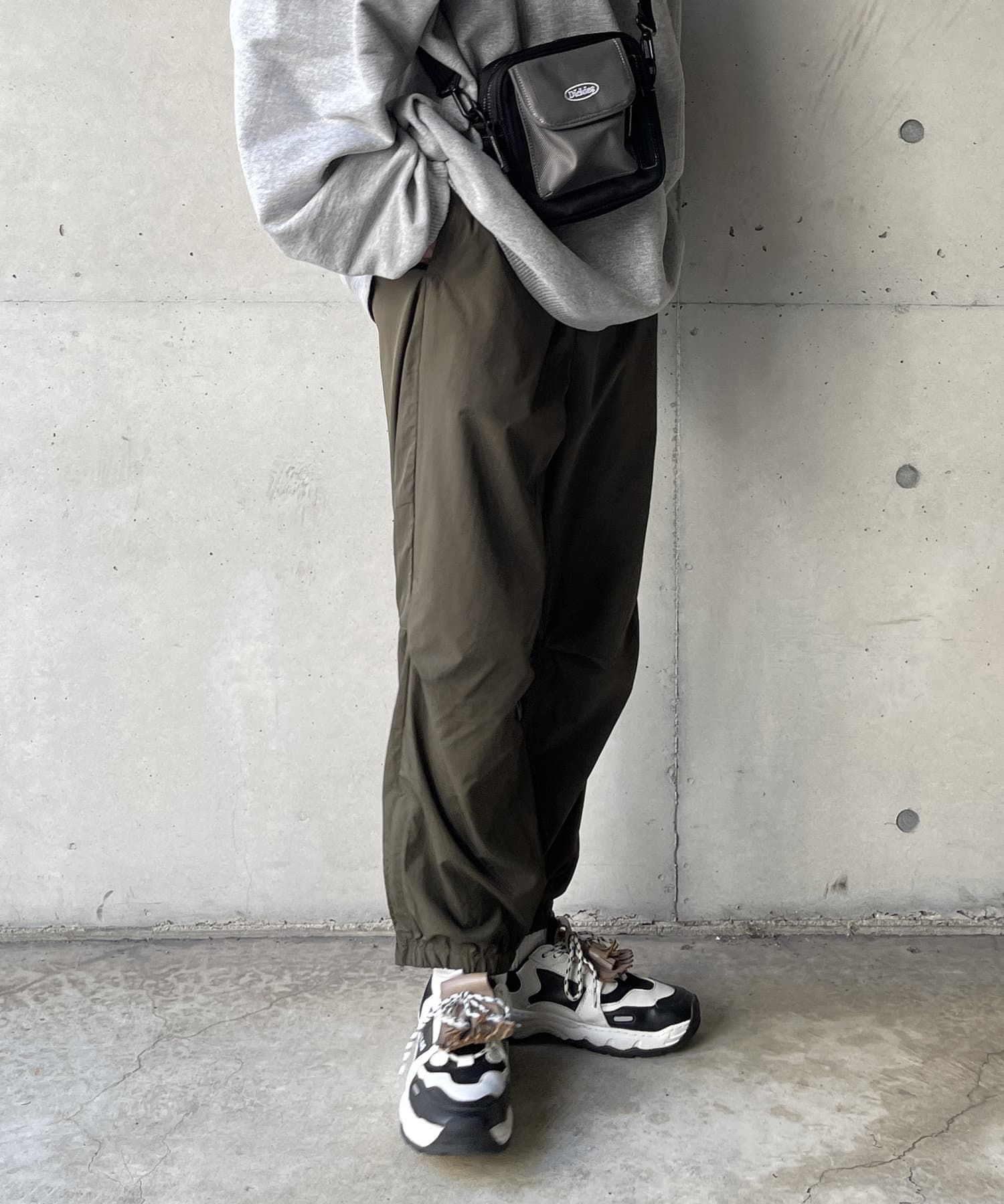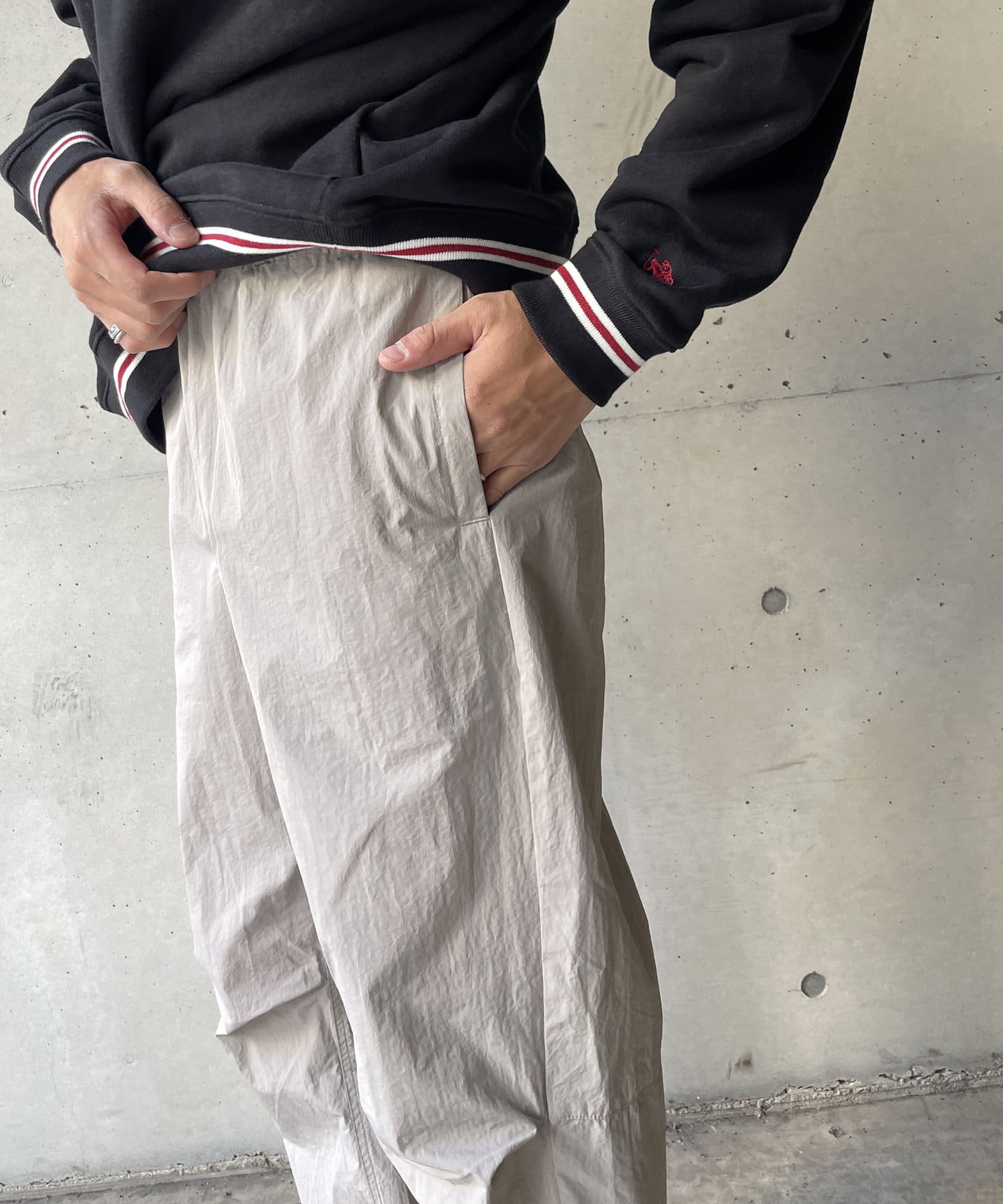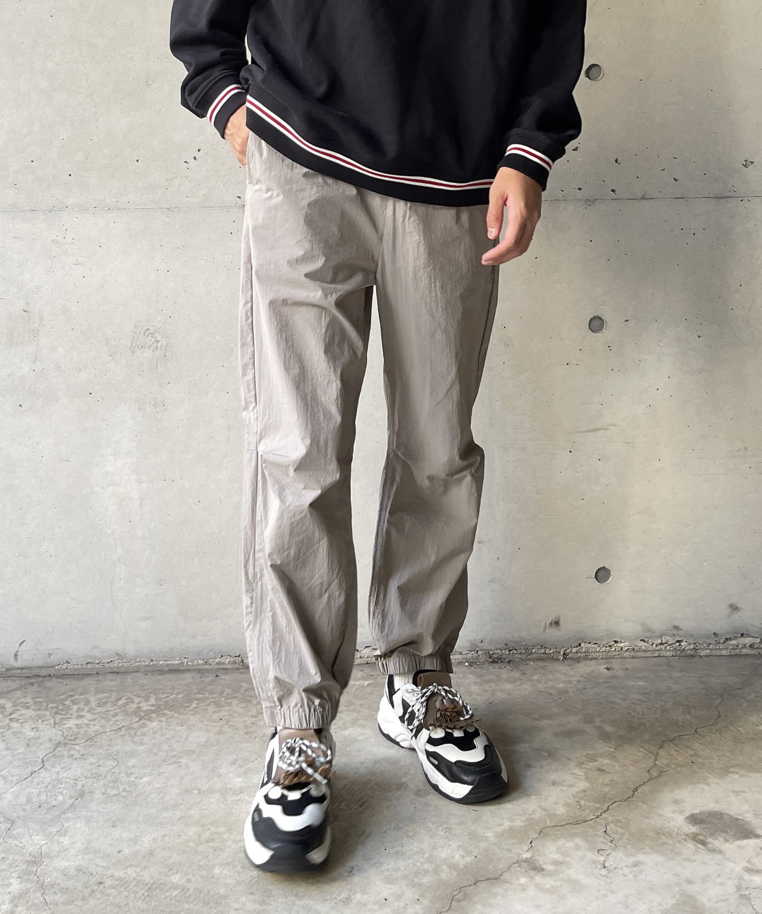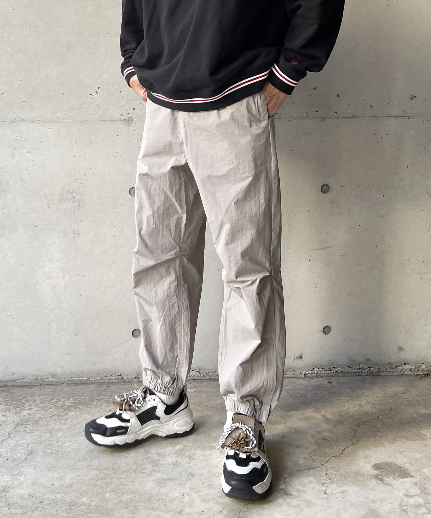 ベーシックなナイロンパンツはロンTやスウェット、ニットなど幅広いトップスと好相性。