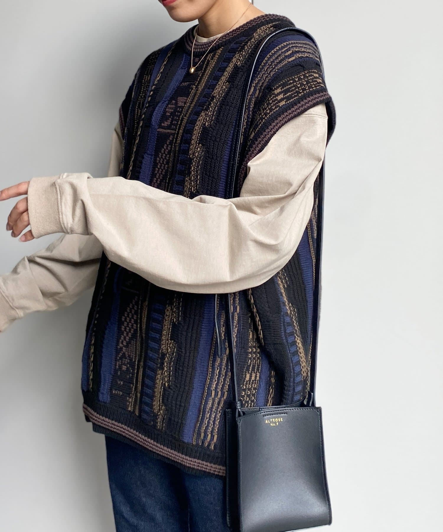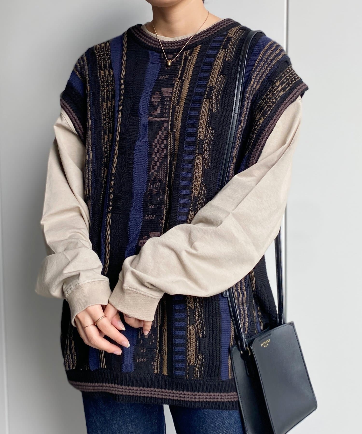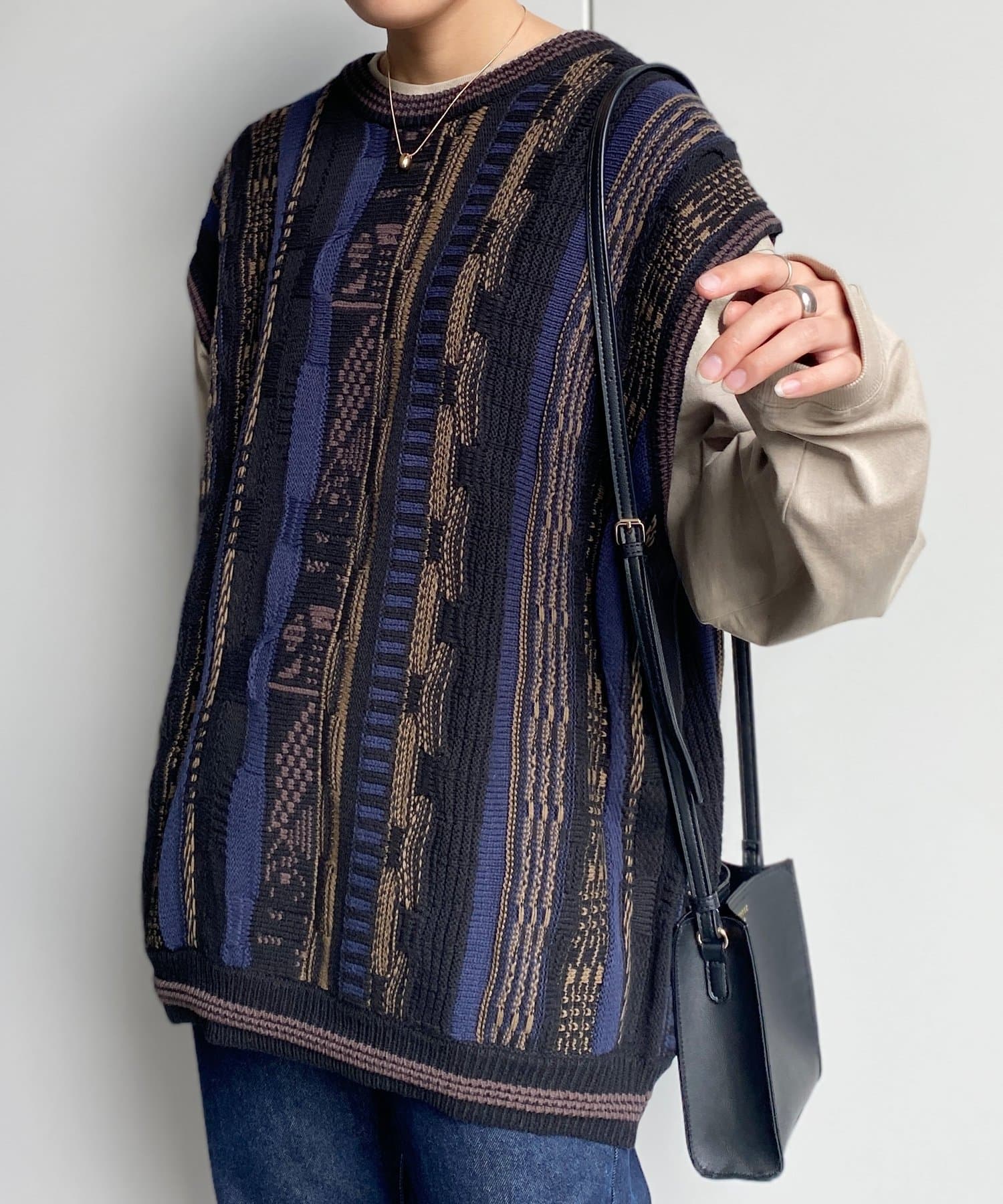 ロンTやシャツのレイヤードアイテムとして着回しができるニットベスト。デニムパンツやコーデュロイのパンツでラフなカジュアルダウンしたスタイルがおススメ。古着市場でも人気な3Dニットはインパクト抜群で、シンプルなコーディネートに合わせるだけでも秋のコーディネートが完成します。
