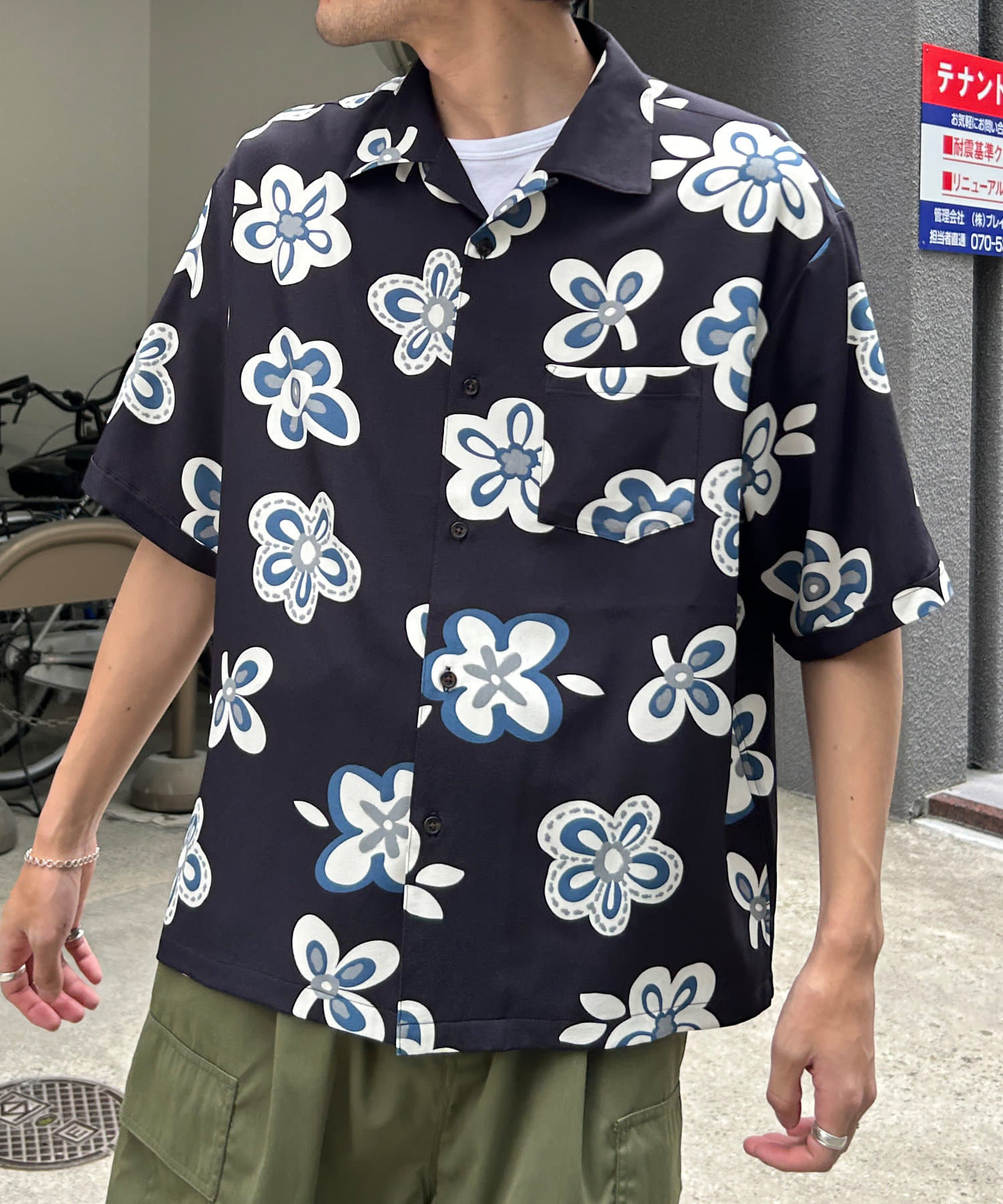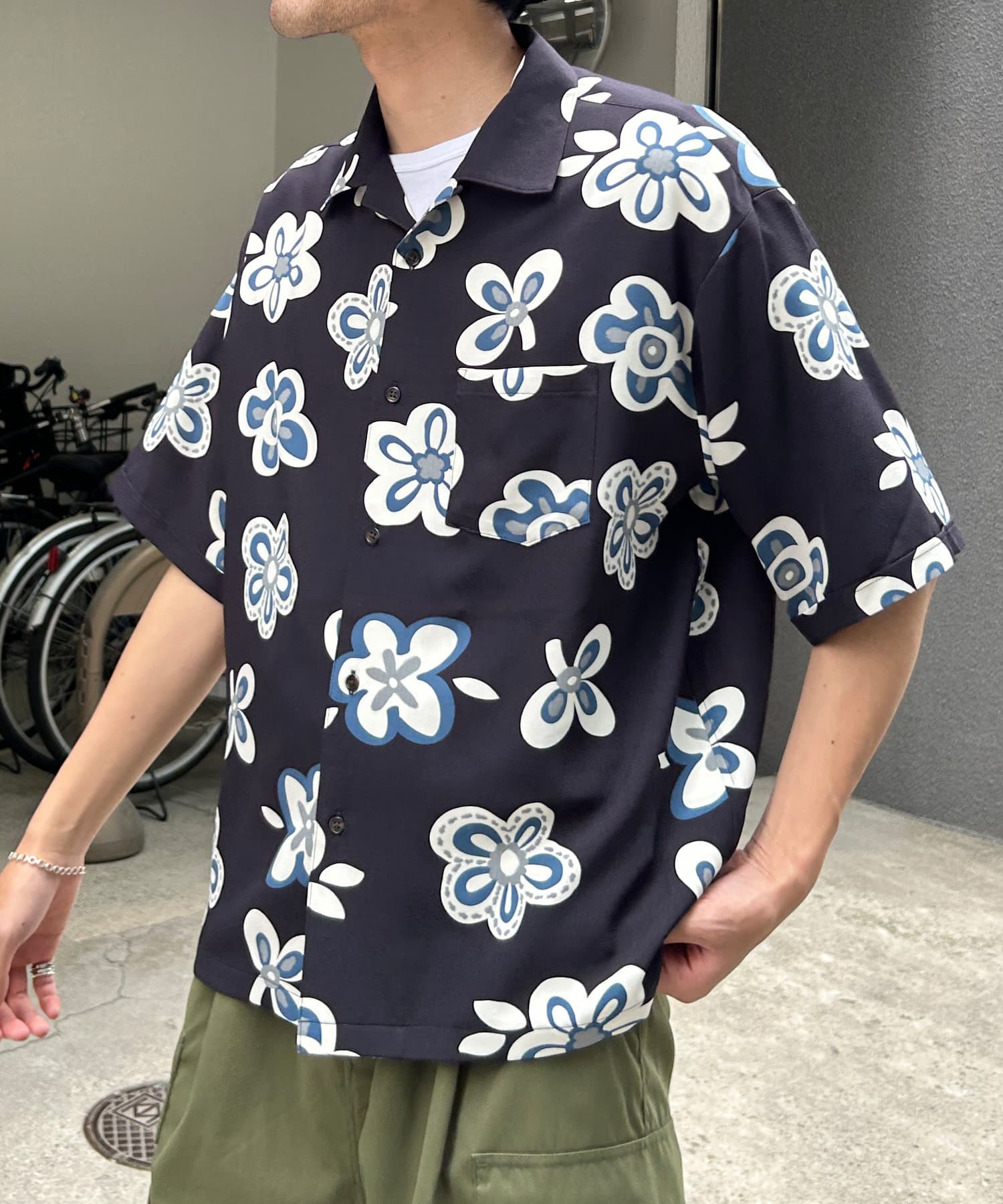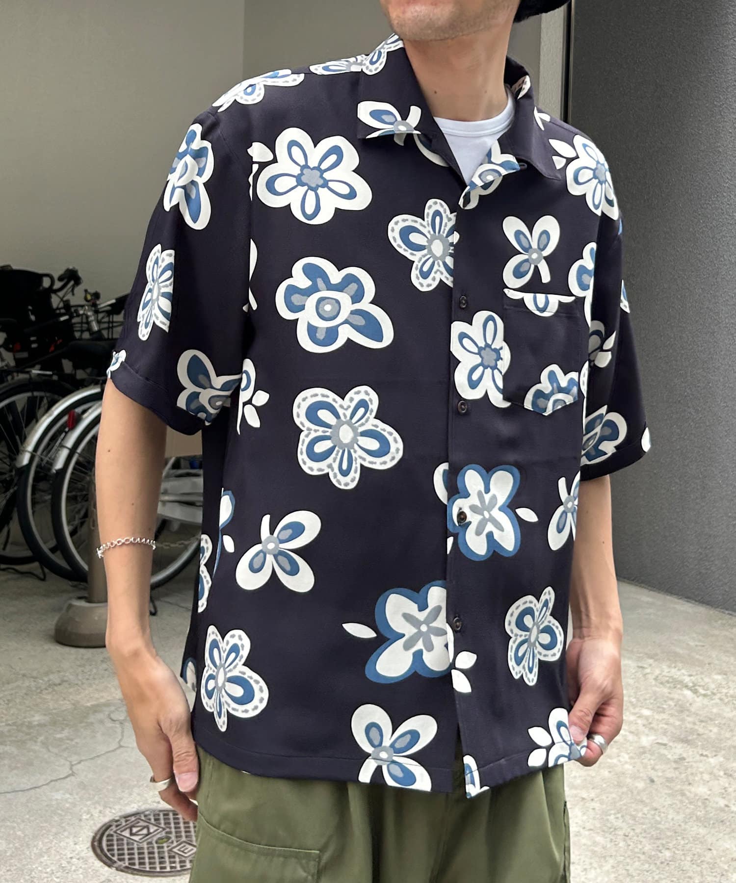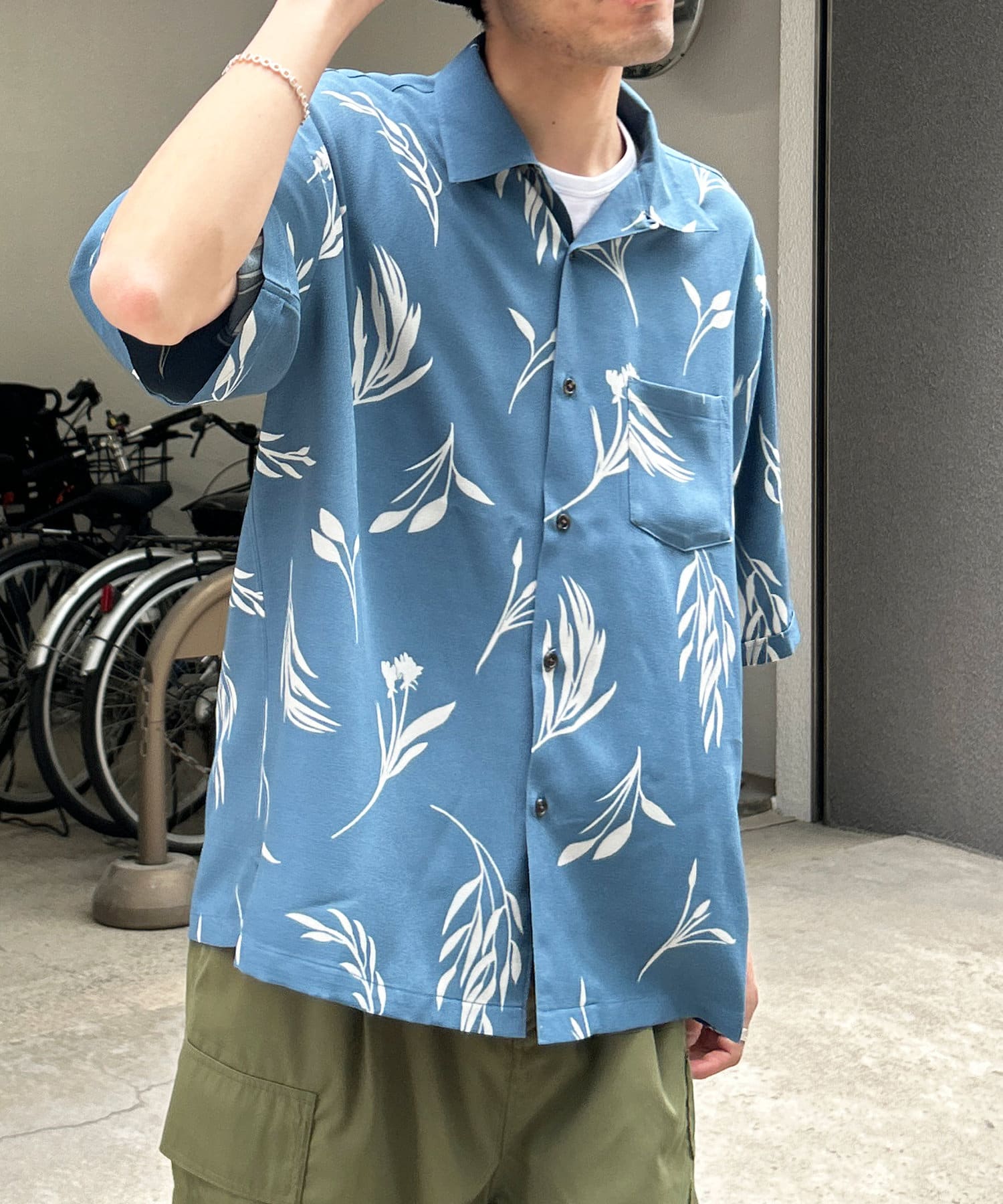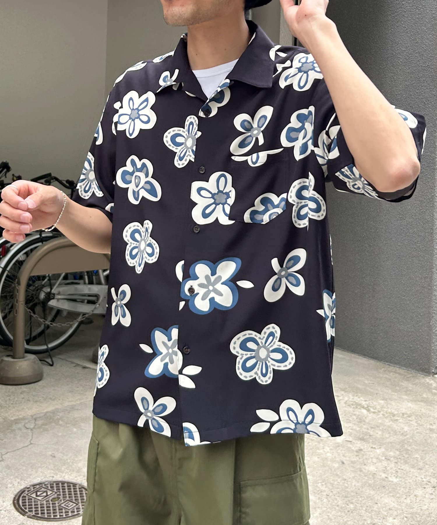 高級感のあるサラッとした素材のシャツです、トップスの主役としてコーデのアクセントにぴったりな総柄開襟シャツです。