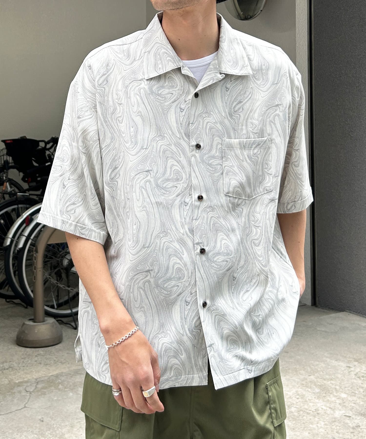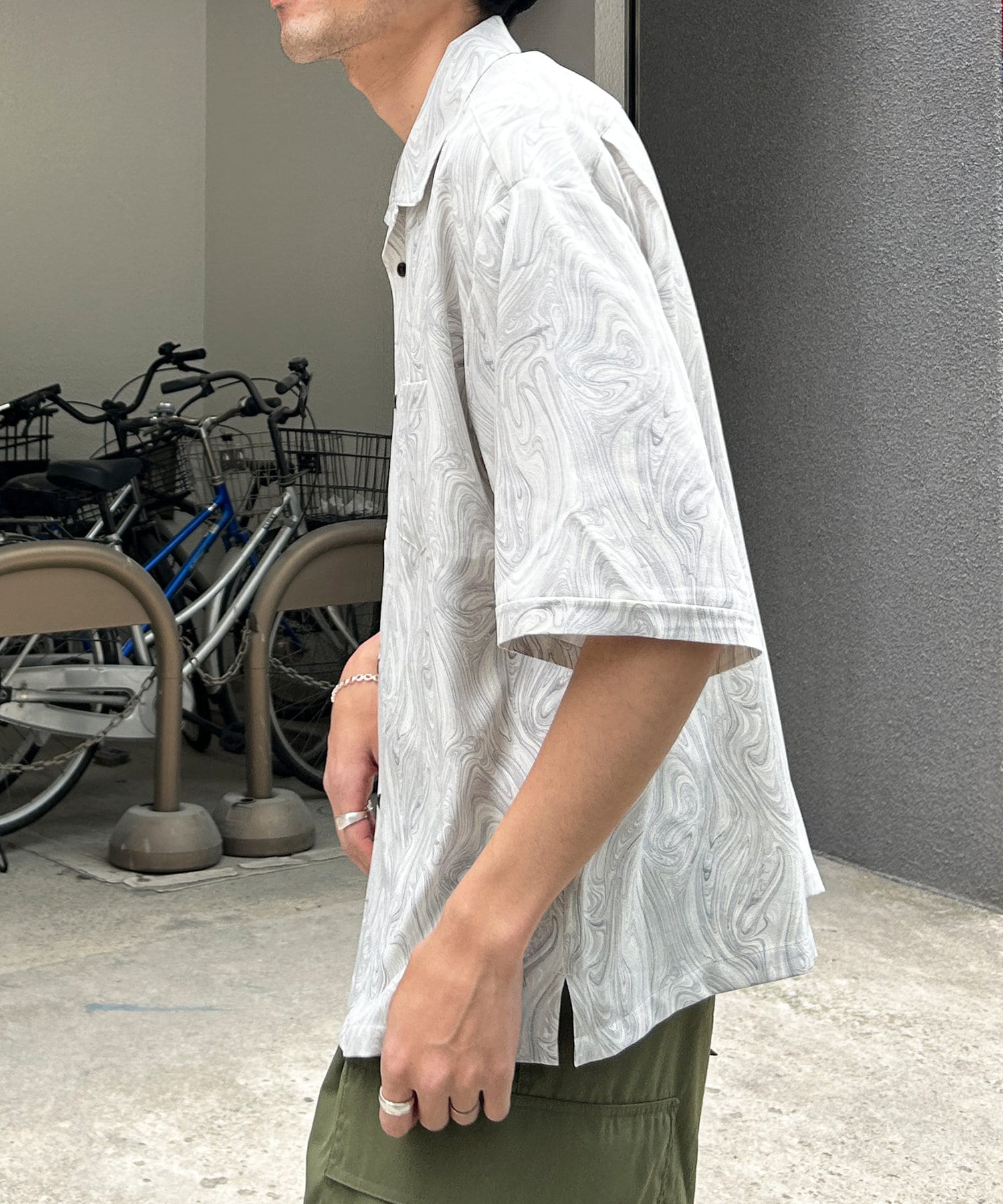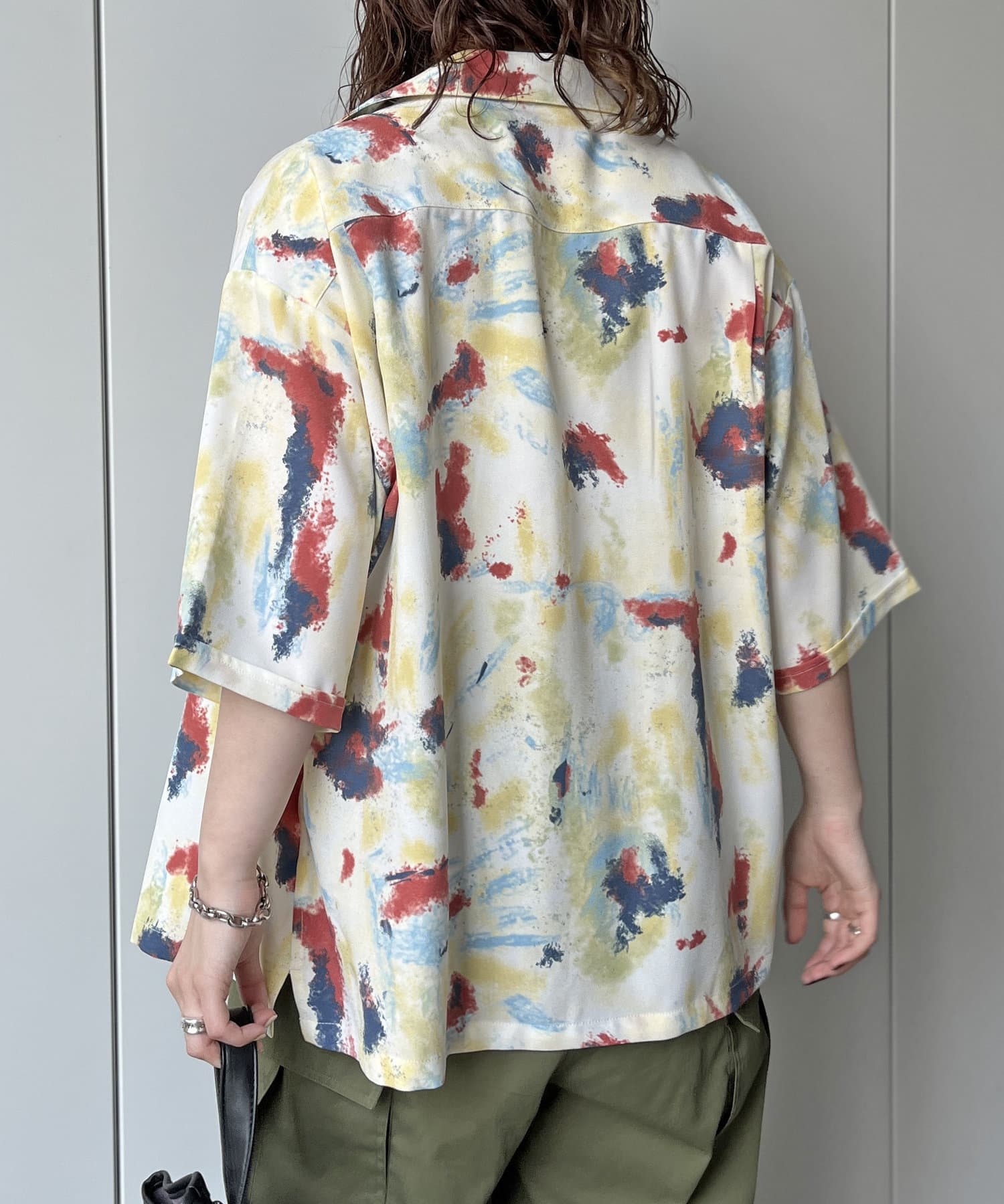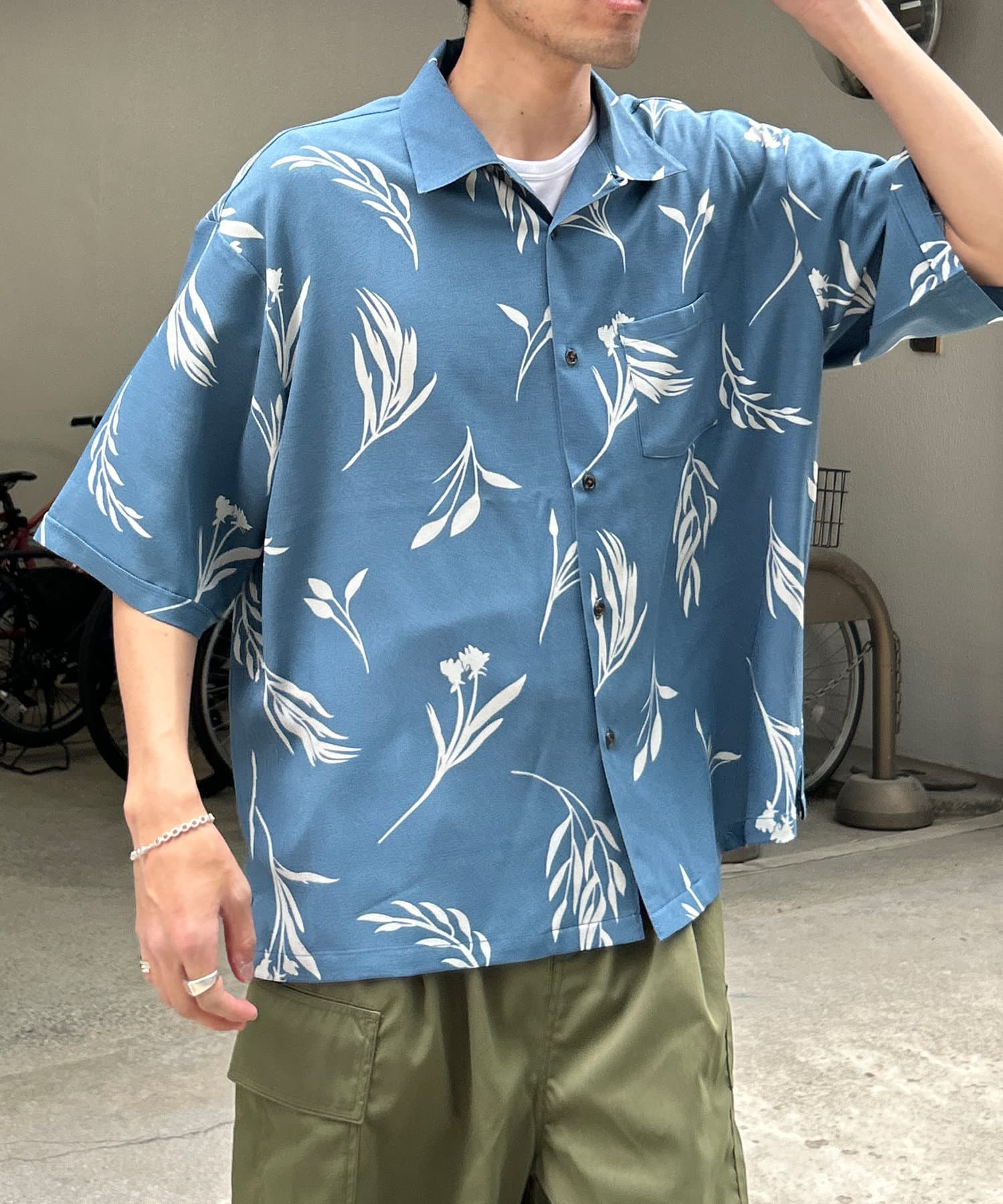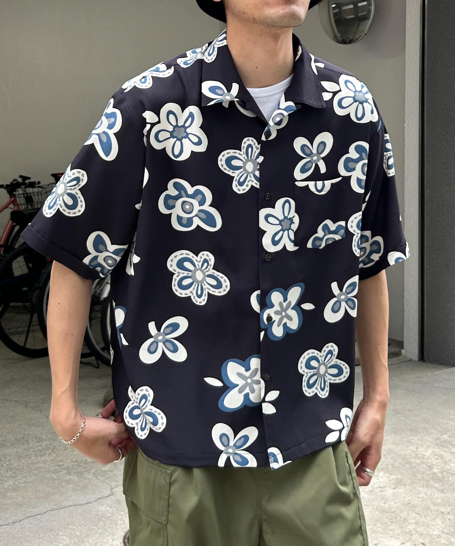 高級感のあるサラッとした素材のシャツです、トップスの主役としてコーデのアクセントにぴったりな総柄開襟シャツです。