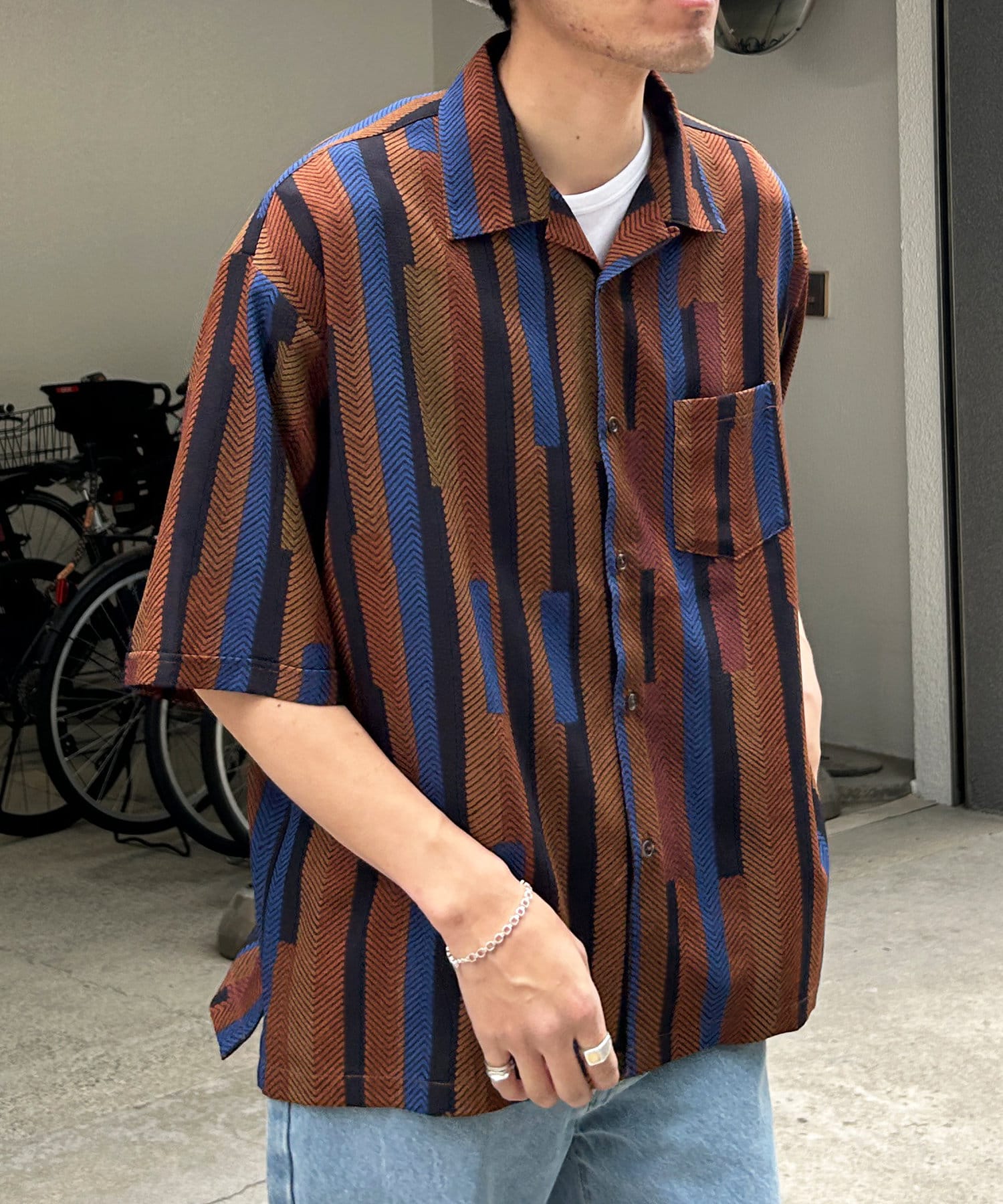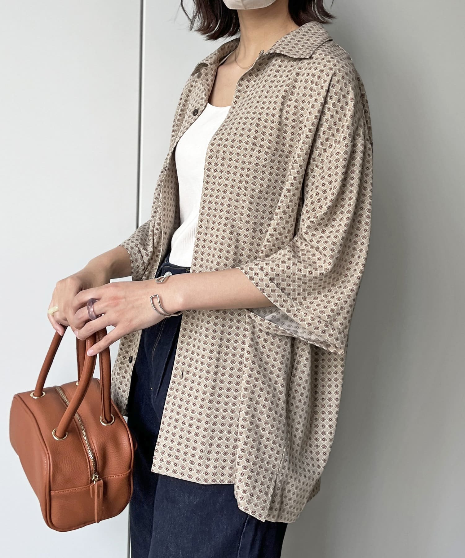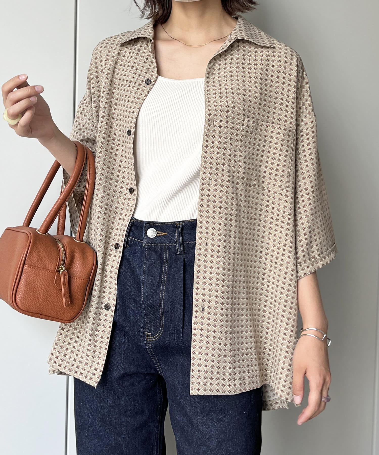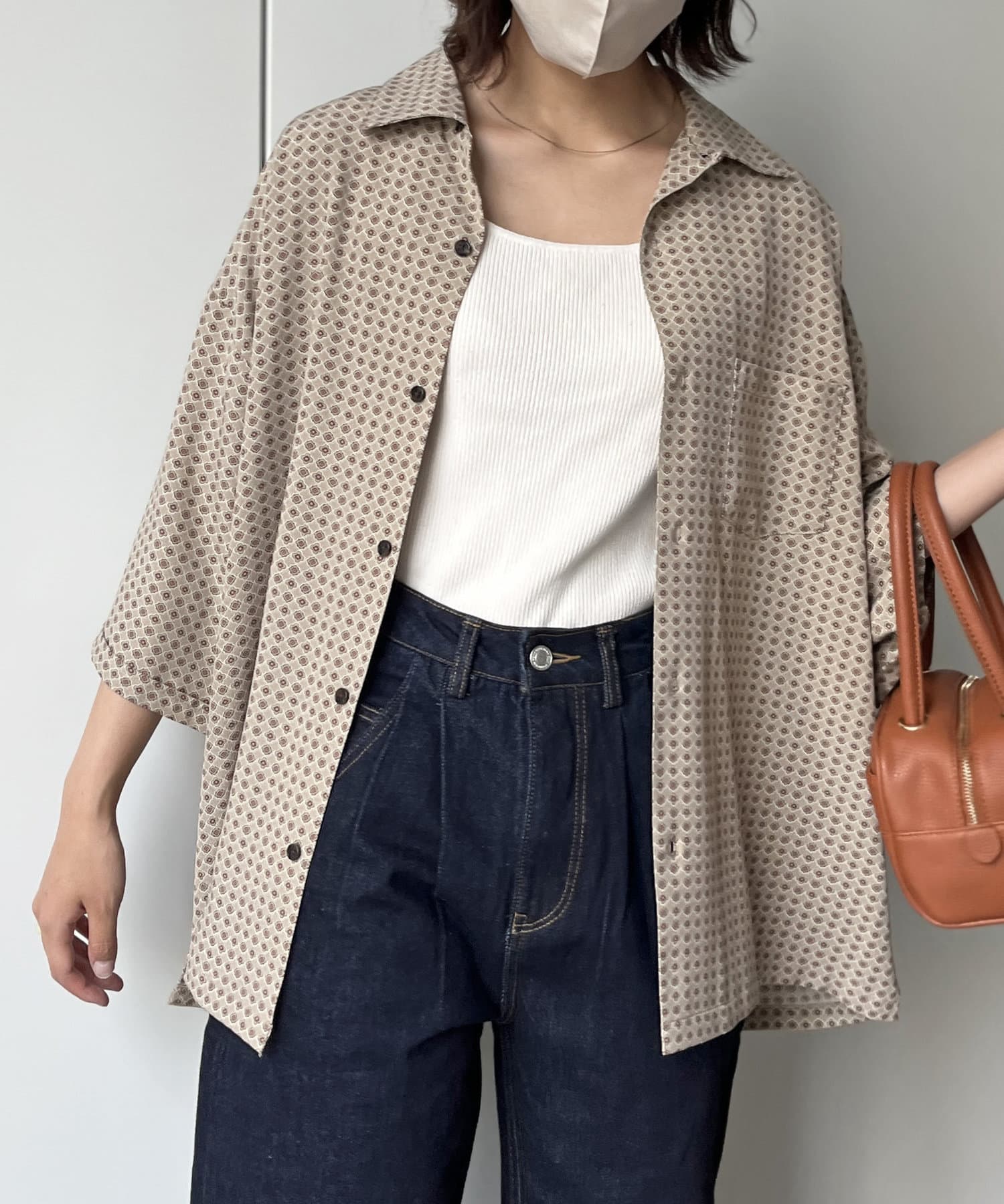 総柄デザインがコーディネートをより一層引き立たせてくれます。スラックスできれいめなコーディネートはもちろん、デニムでカジュアルなスタイリングにも◎やわらかい素材なので、タックインしやすく、羽織としても、1枚でも着用できるアイテムです。