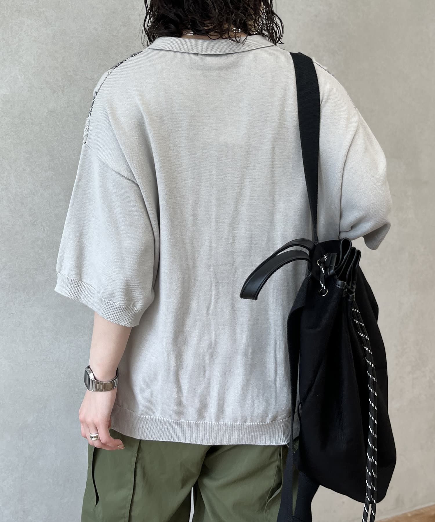 襟付きのデザインが、ポロシャツにも、カーディガンにもなるニットアイテム。