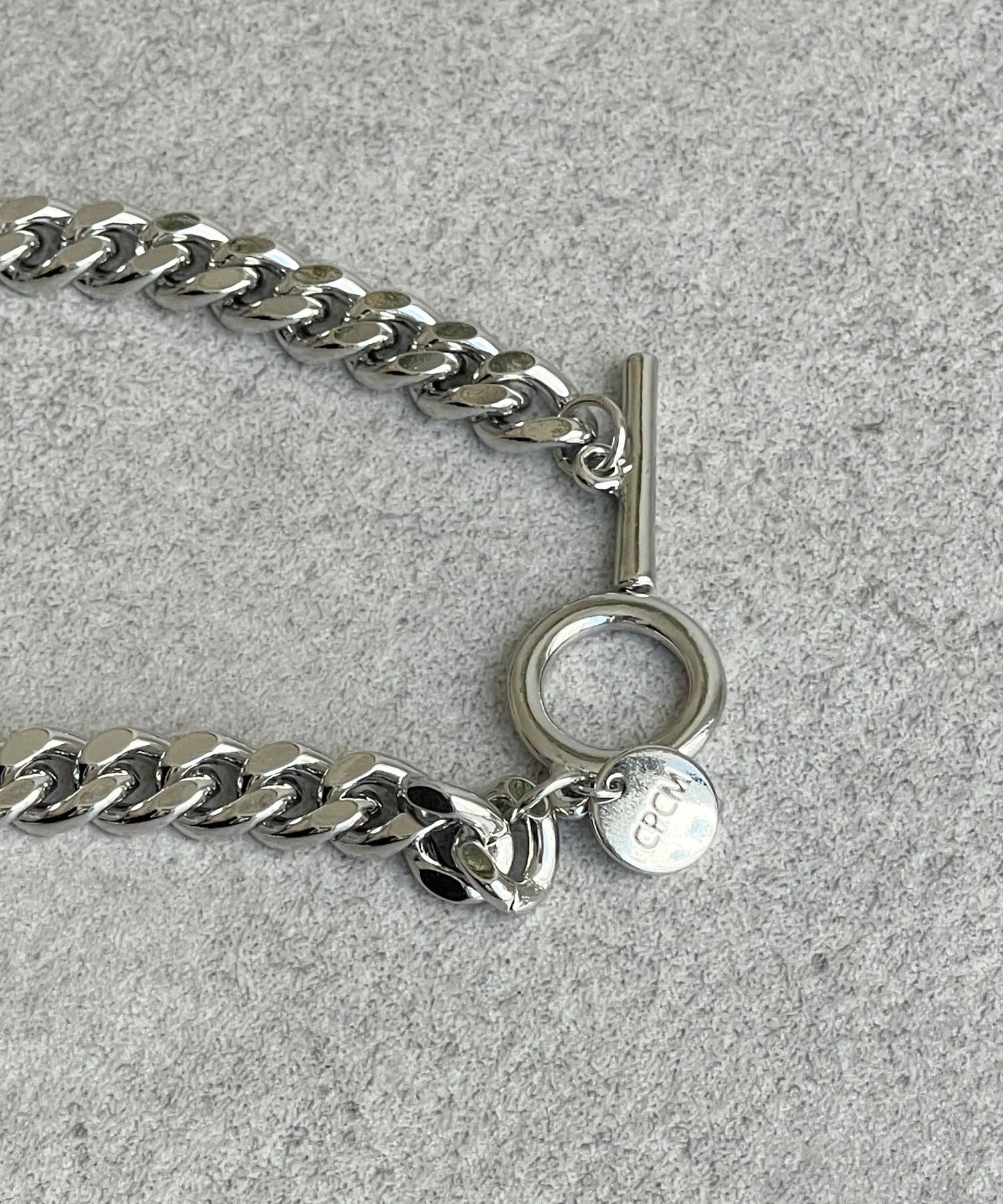 存在感のあるメタリックカラーと華奢なチェーンの組み合わせが、