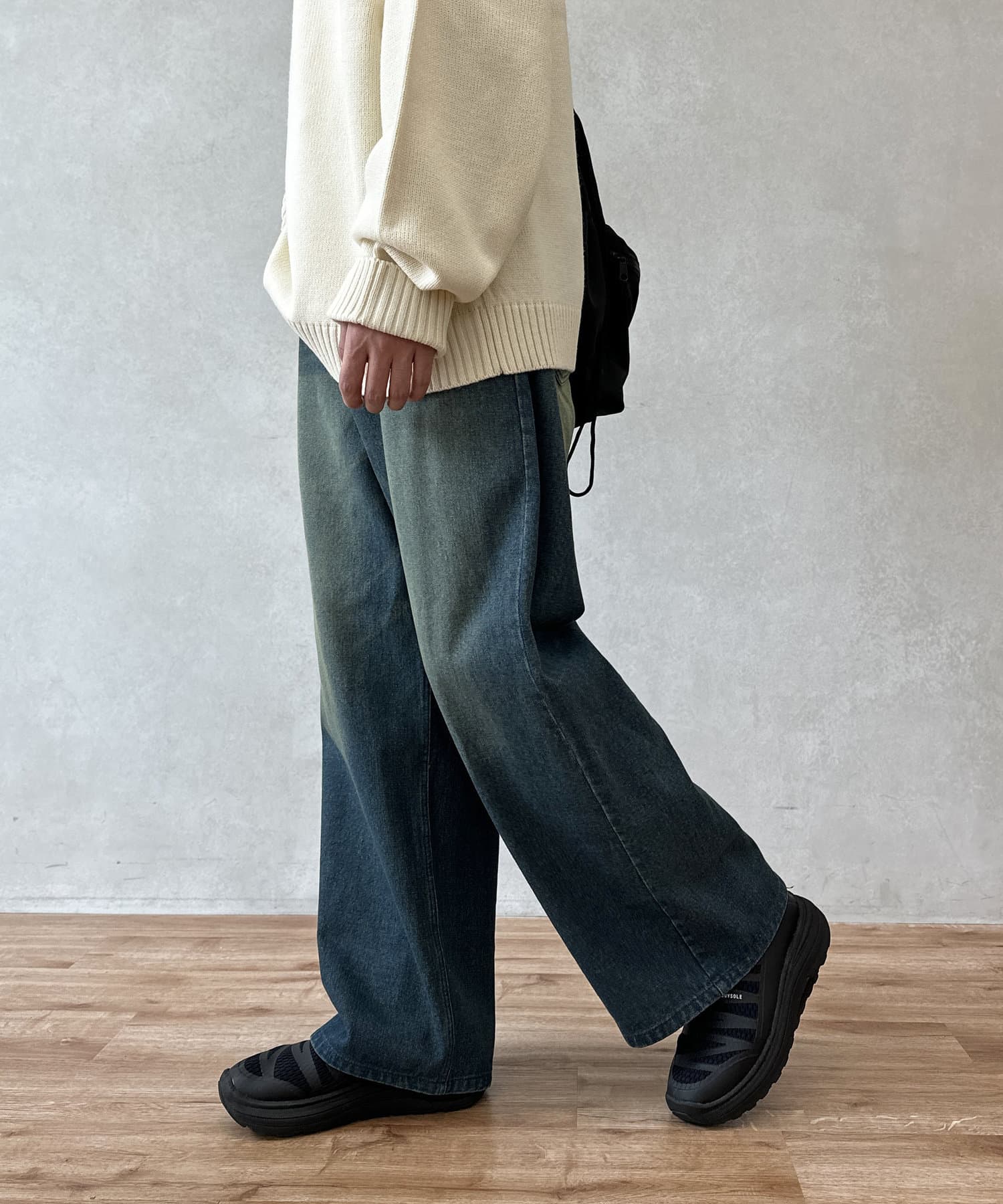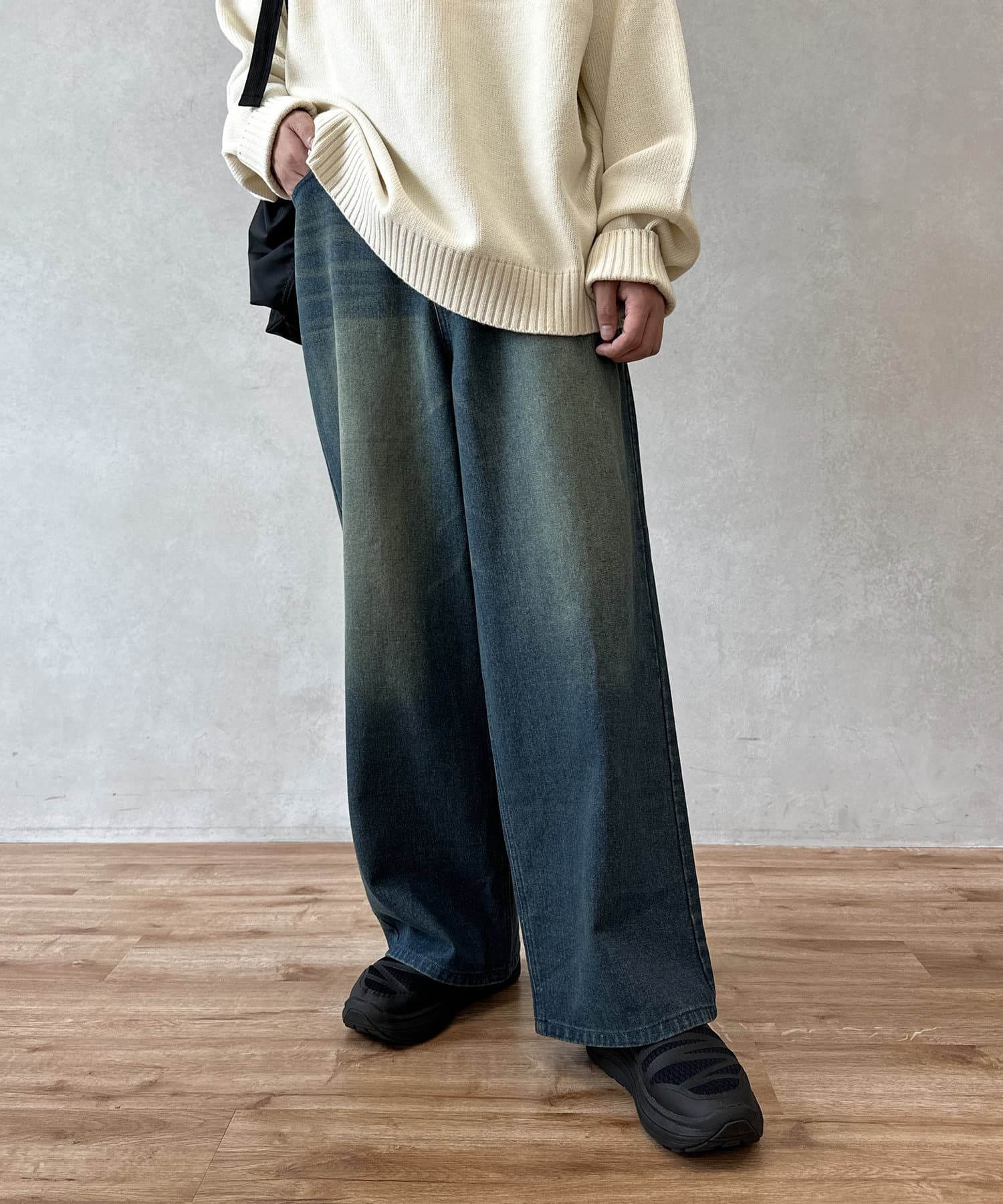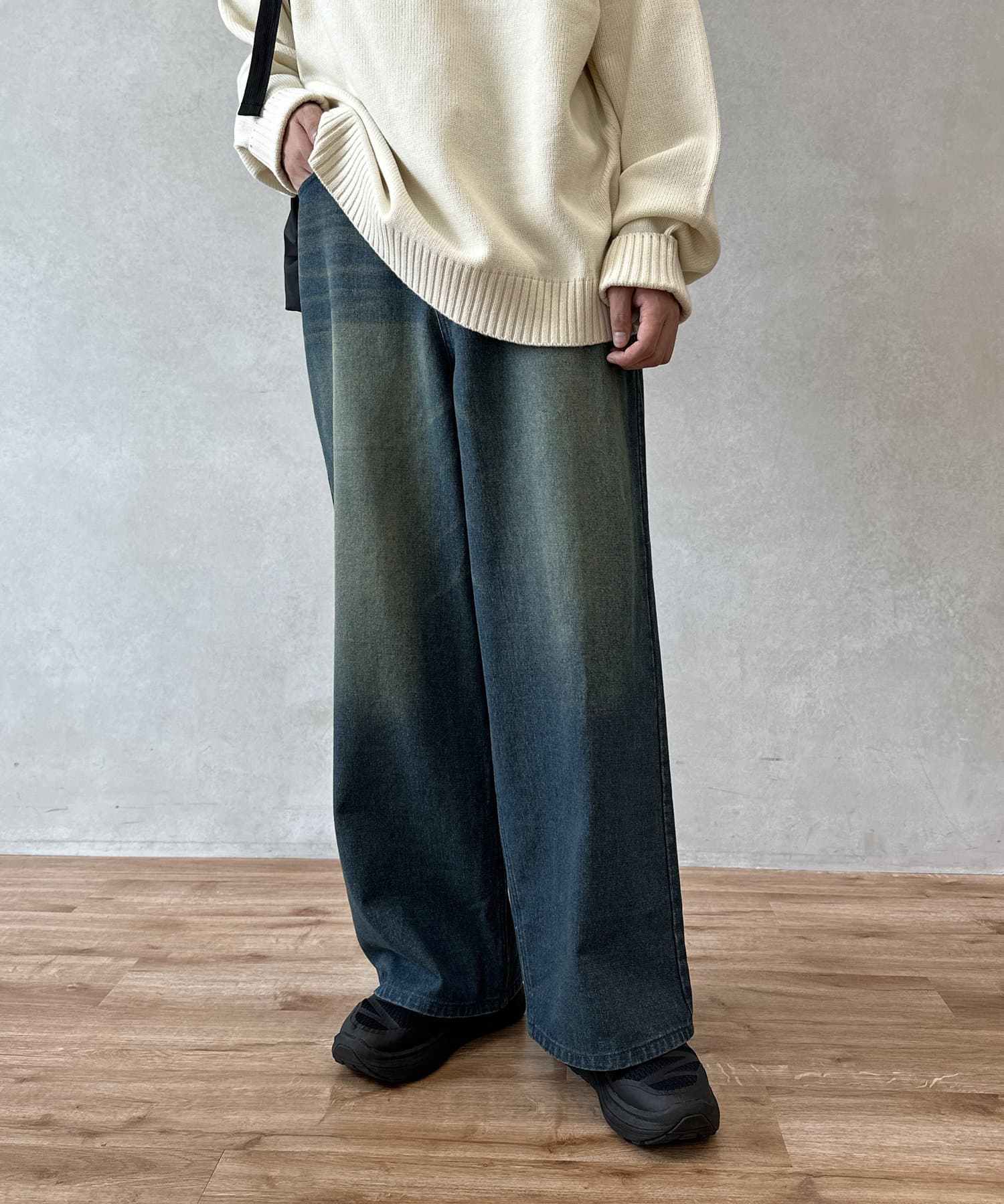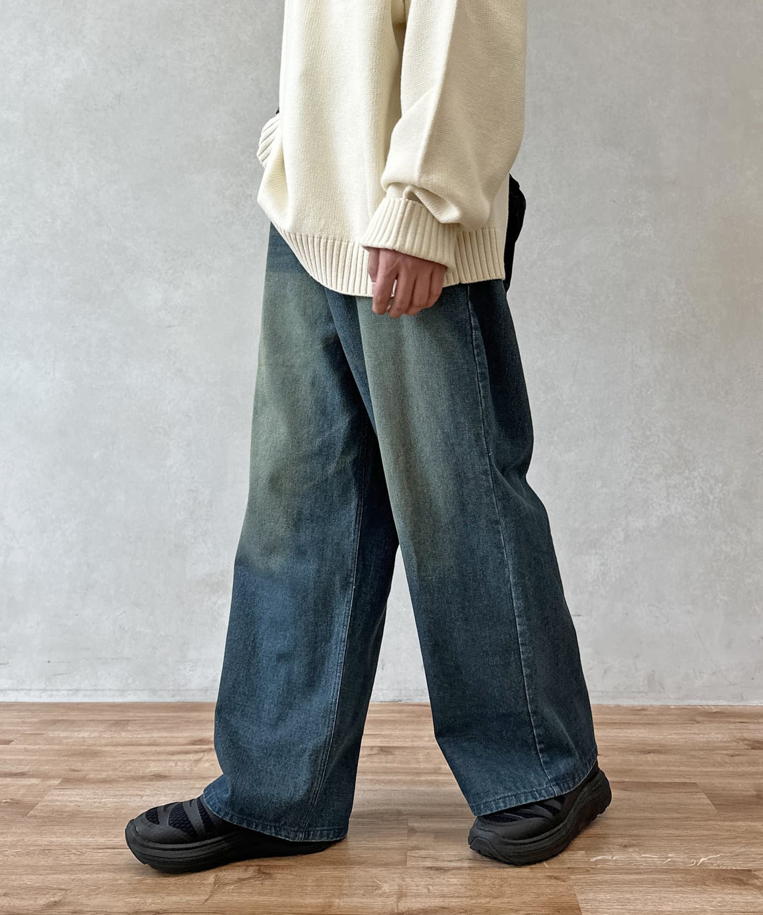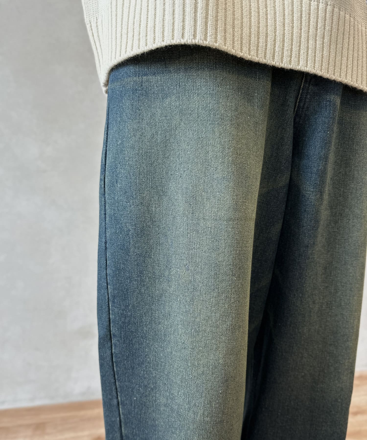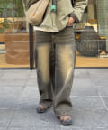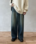 今季注目のオーバーダイ加工が施されたデニムパンツ