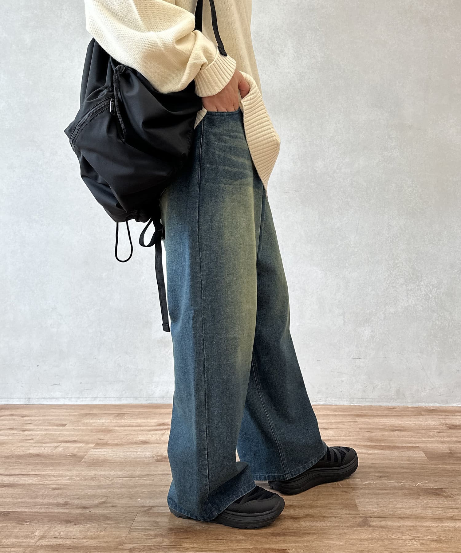 ・ハリのあるデニム生地がきれいに見えるワイドシルエット