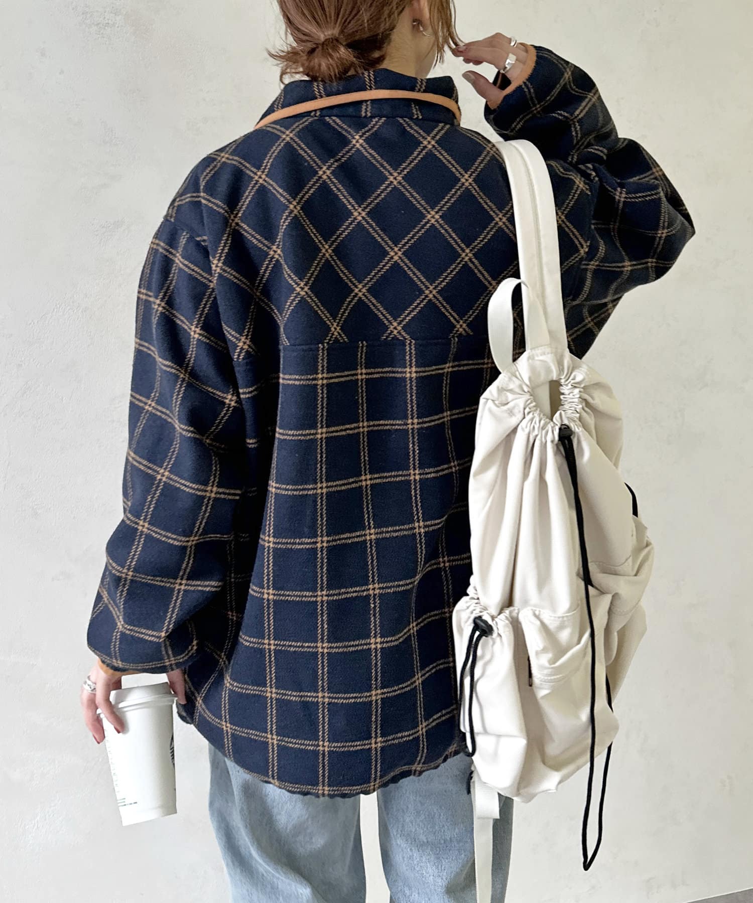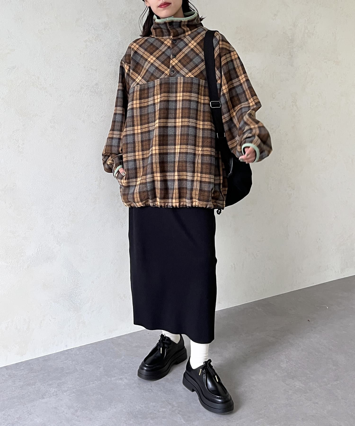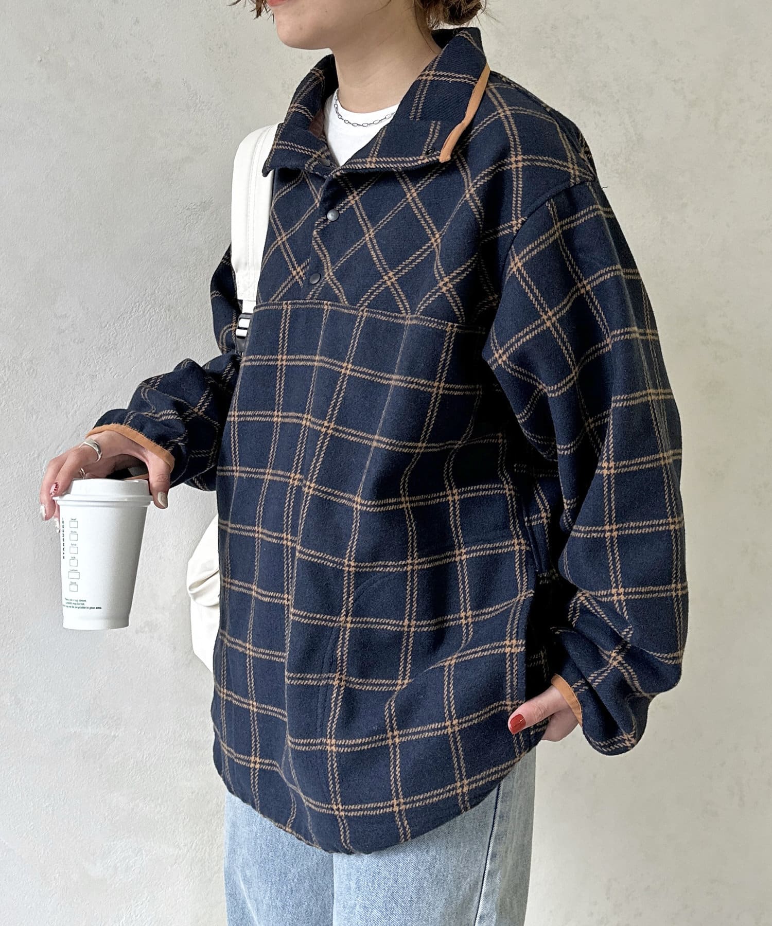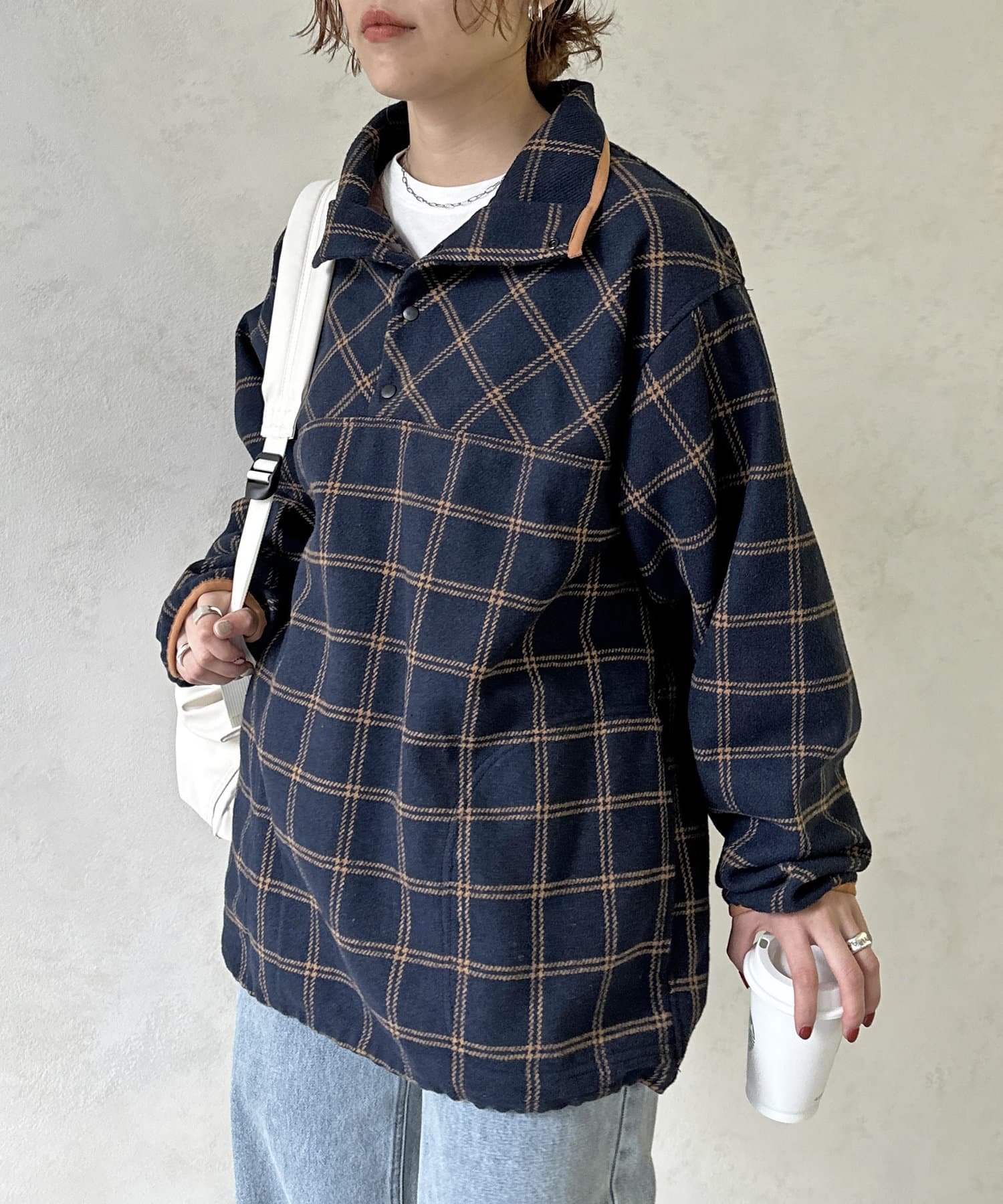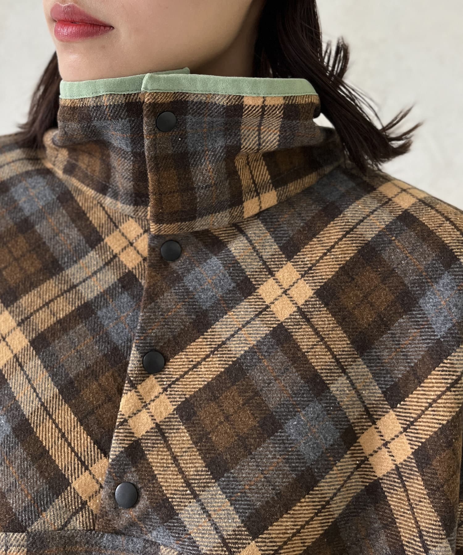 起毛×チェックが秋らしい、スタンドネックのプルオーバー
