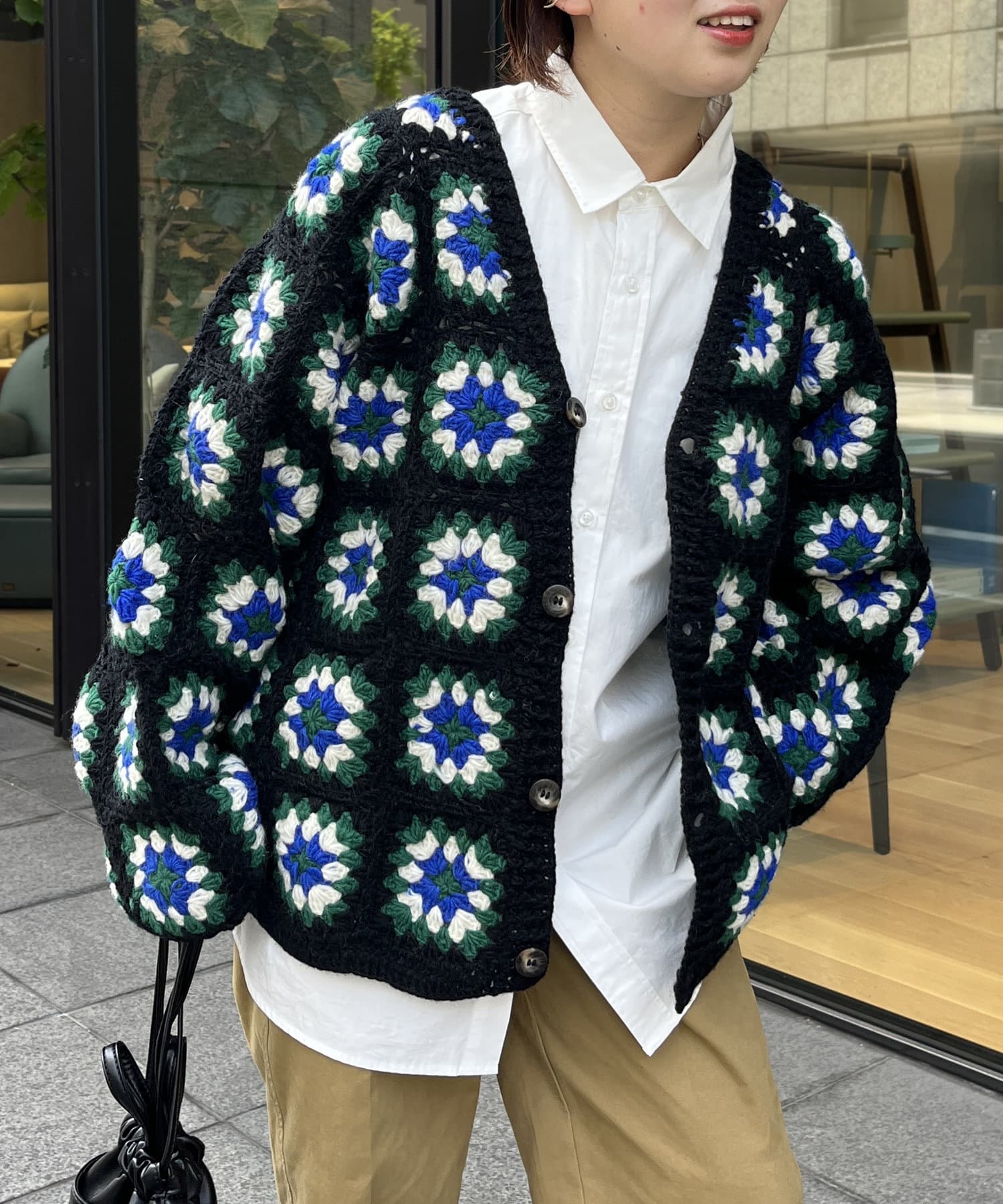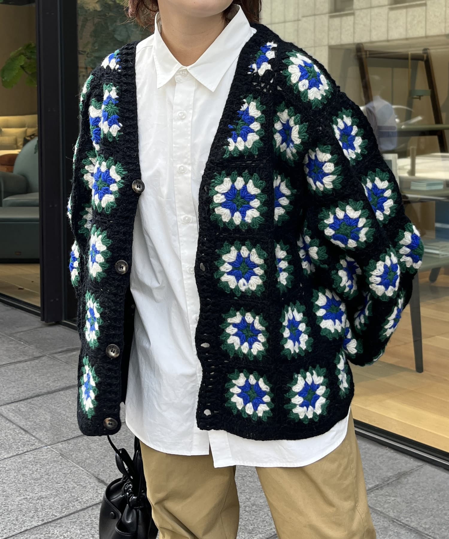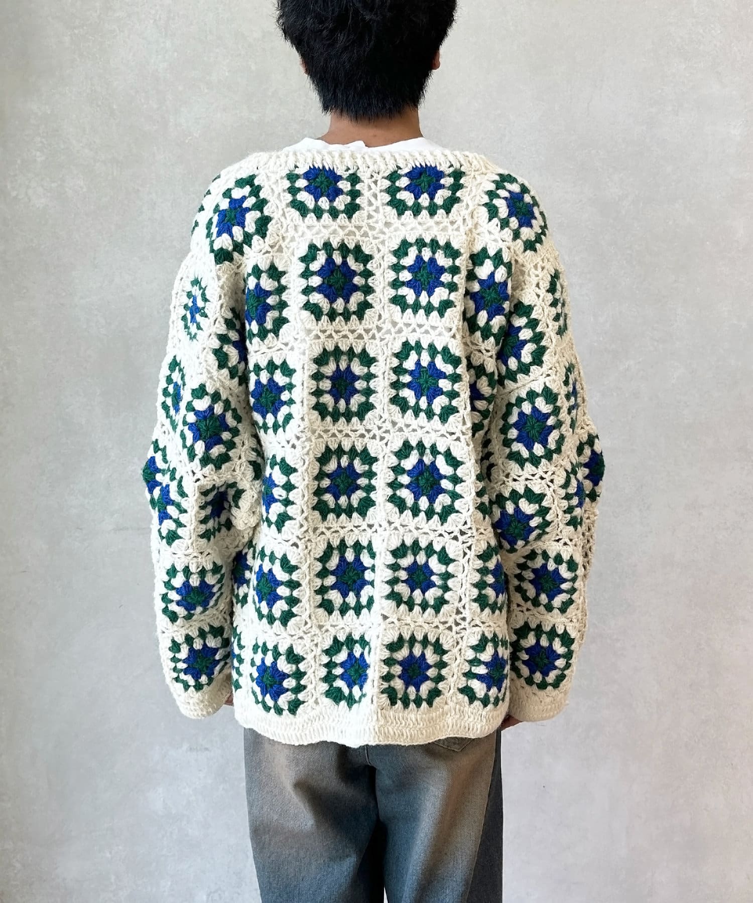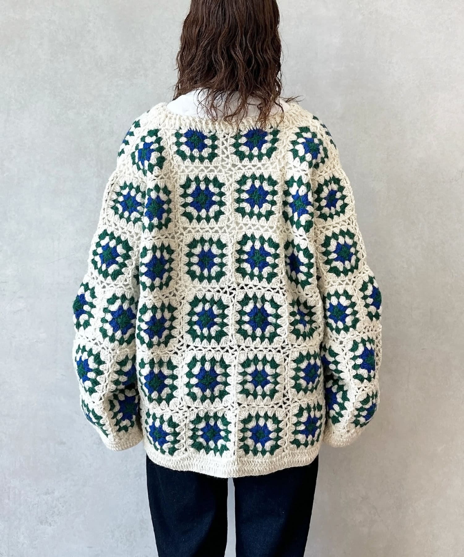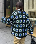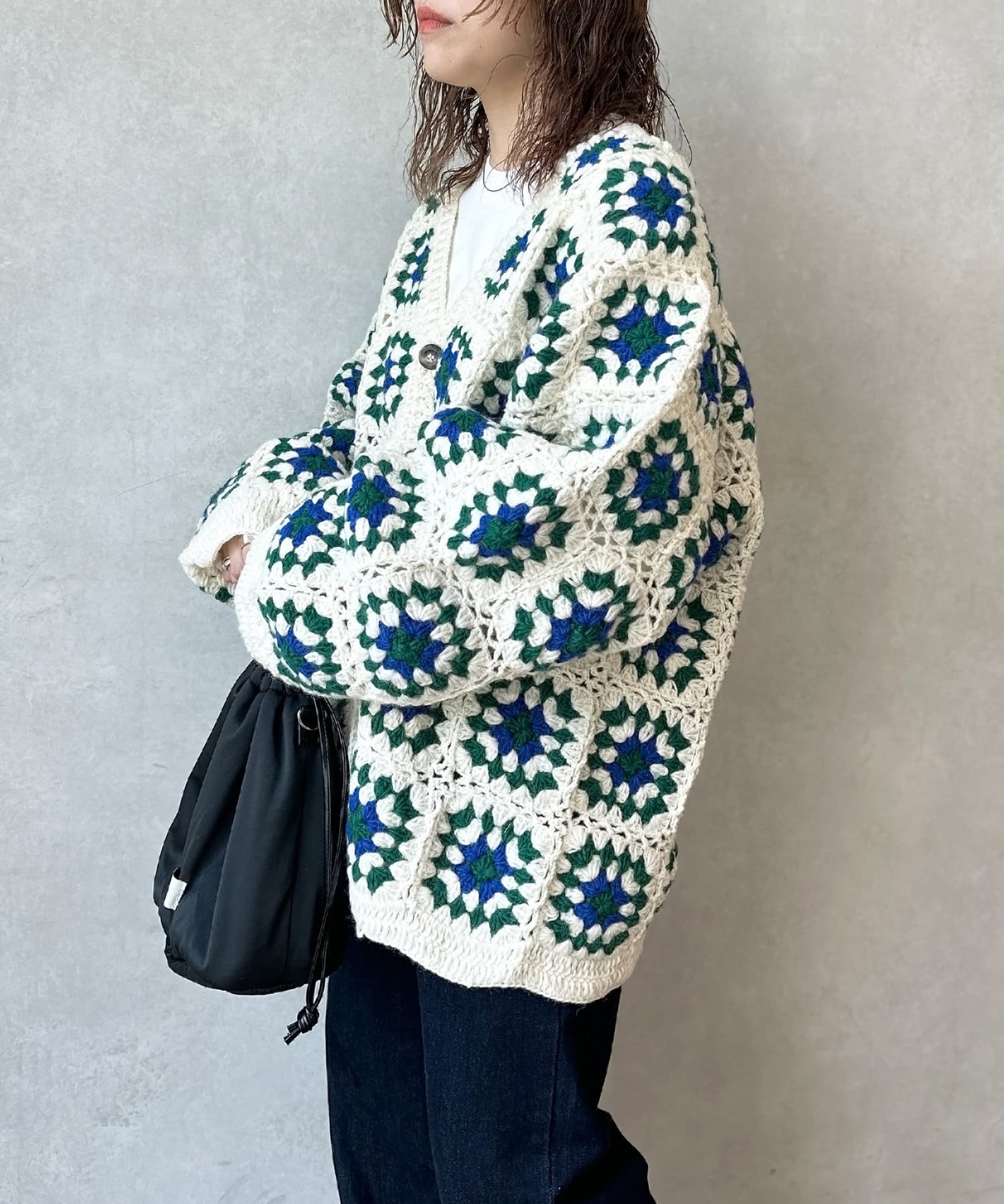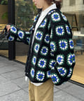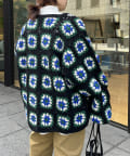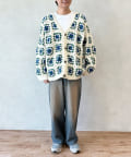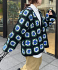 ざっくりとした編み目が魅力的な、ハンドメイドならではの優しい風合いと花柄が目を惹くデザイン。
