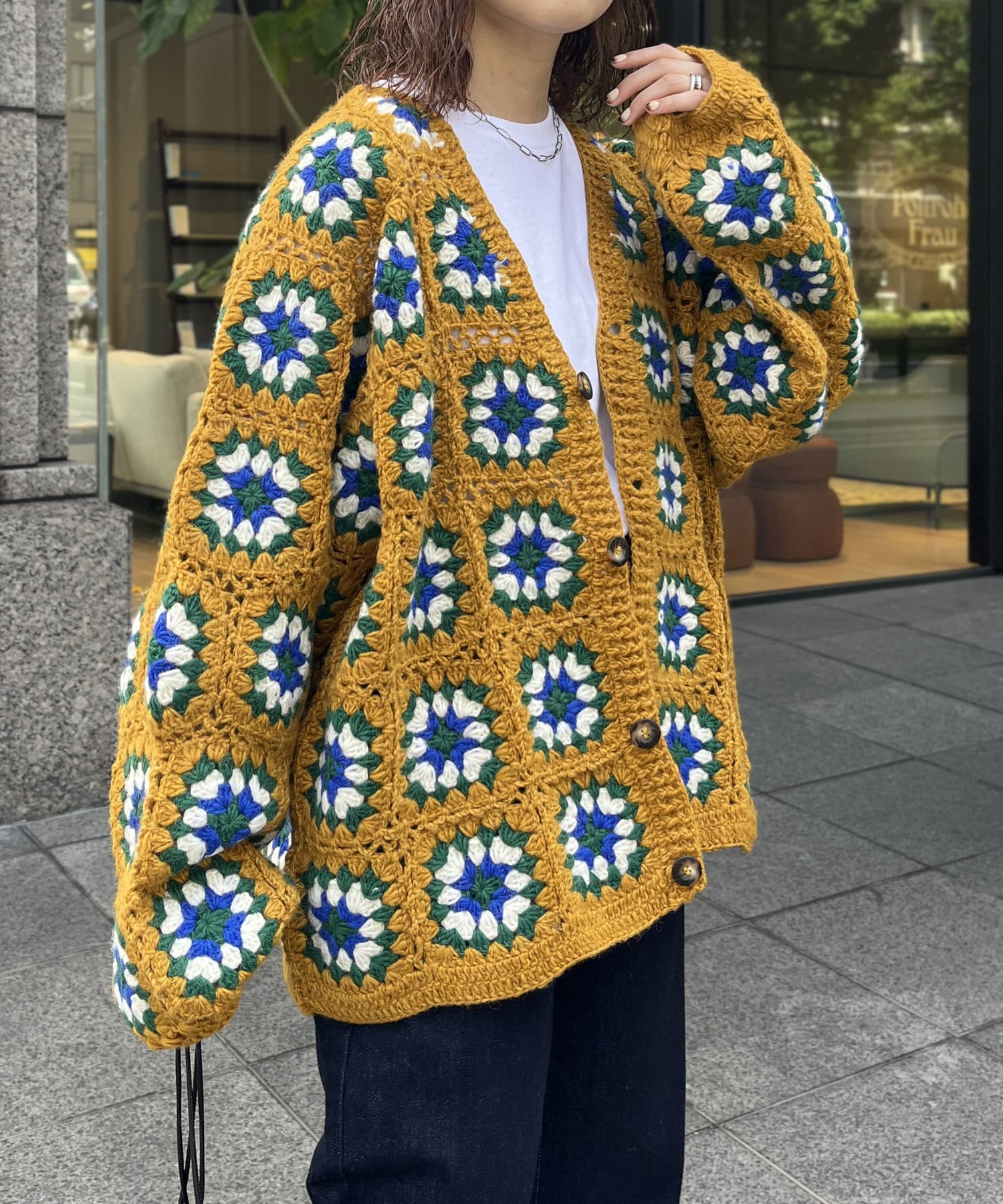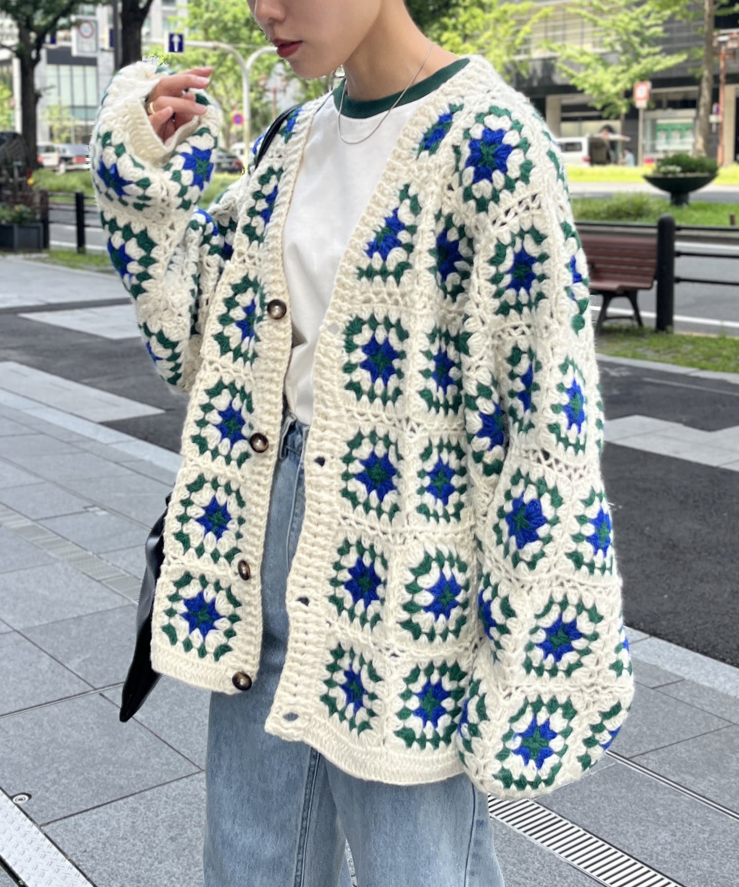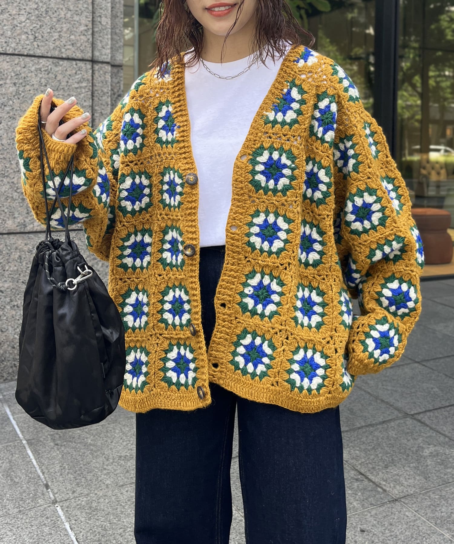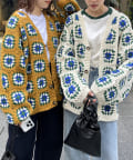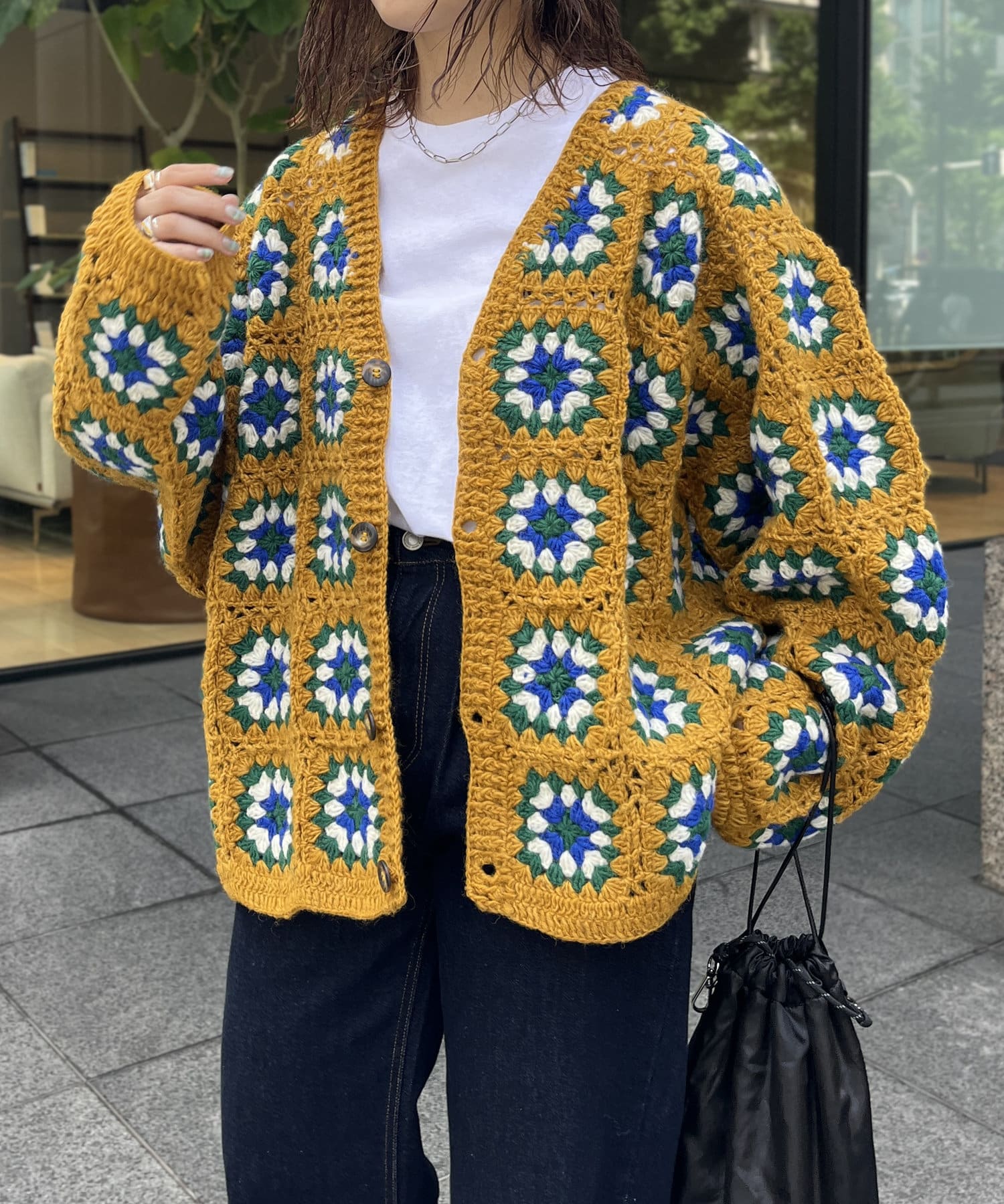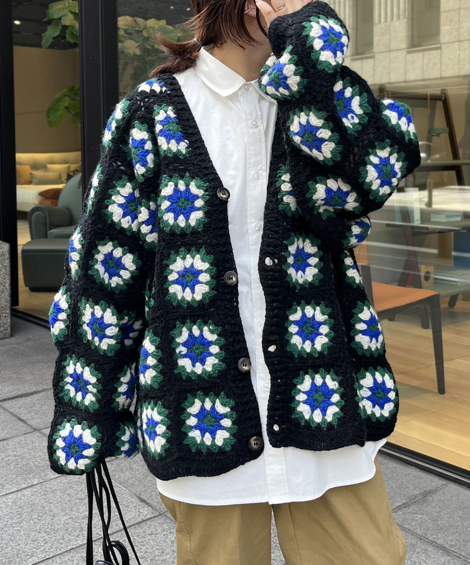 ざっくりとした編み目が魅力的な、ハンドメイドならではの優しい風合いと花柄が目を惹くデザイン。