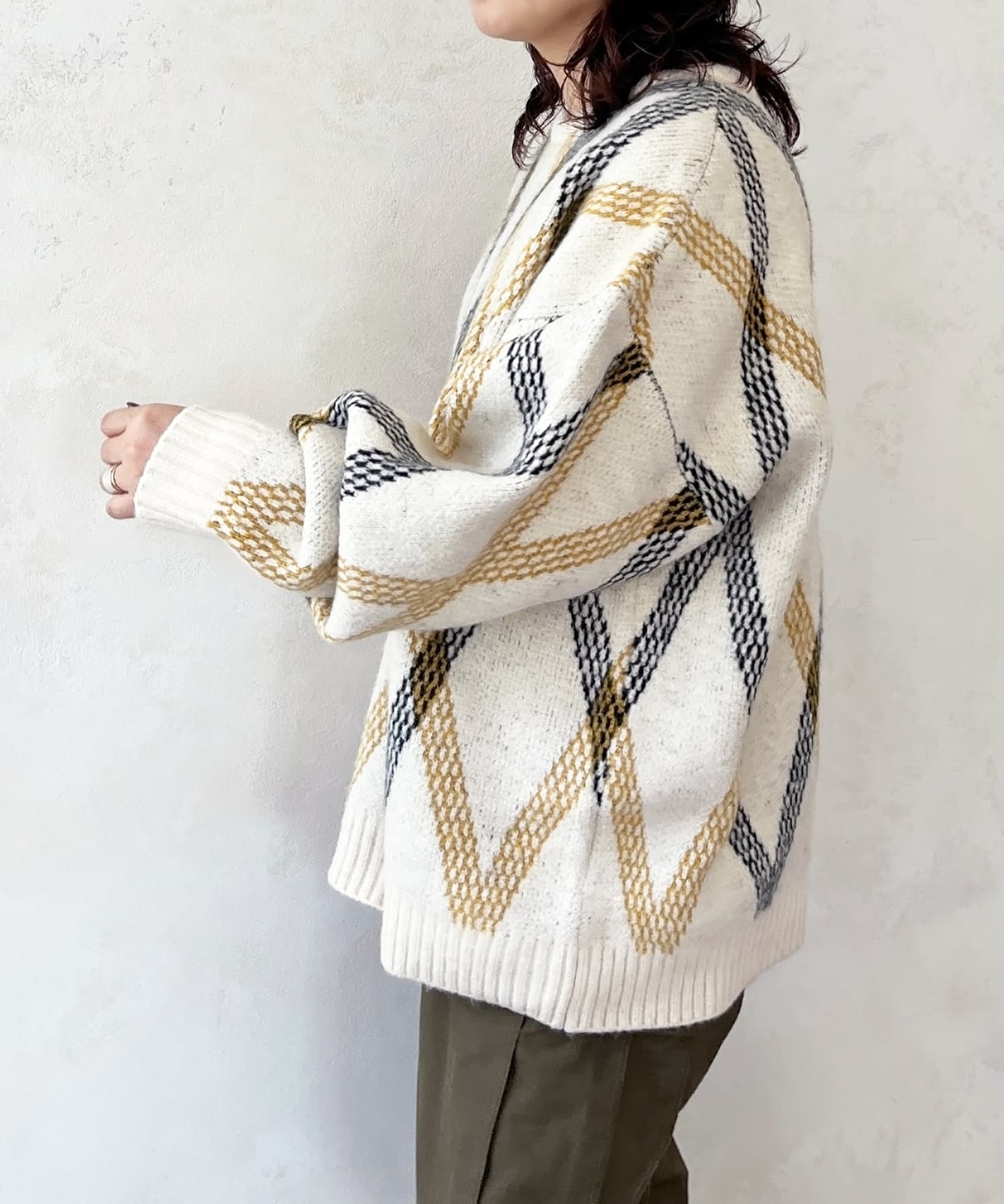 柔らかな手触りで起毛感のあるモヘアタッチの糸を使用した総柄のニットです。