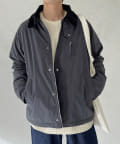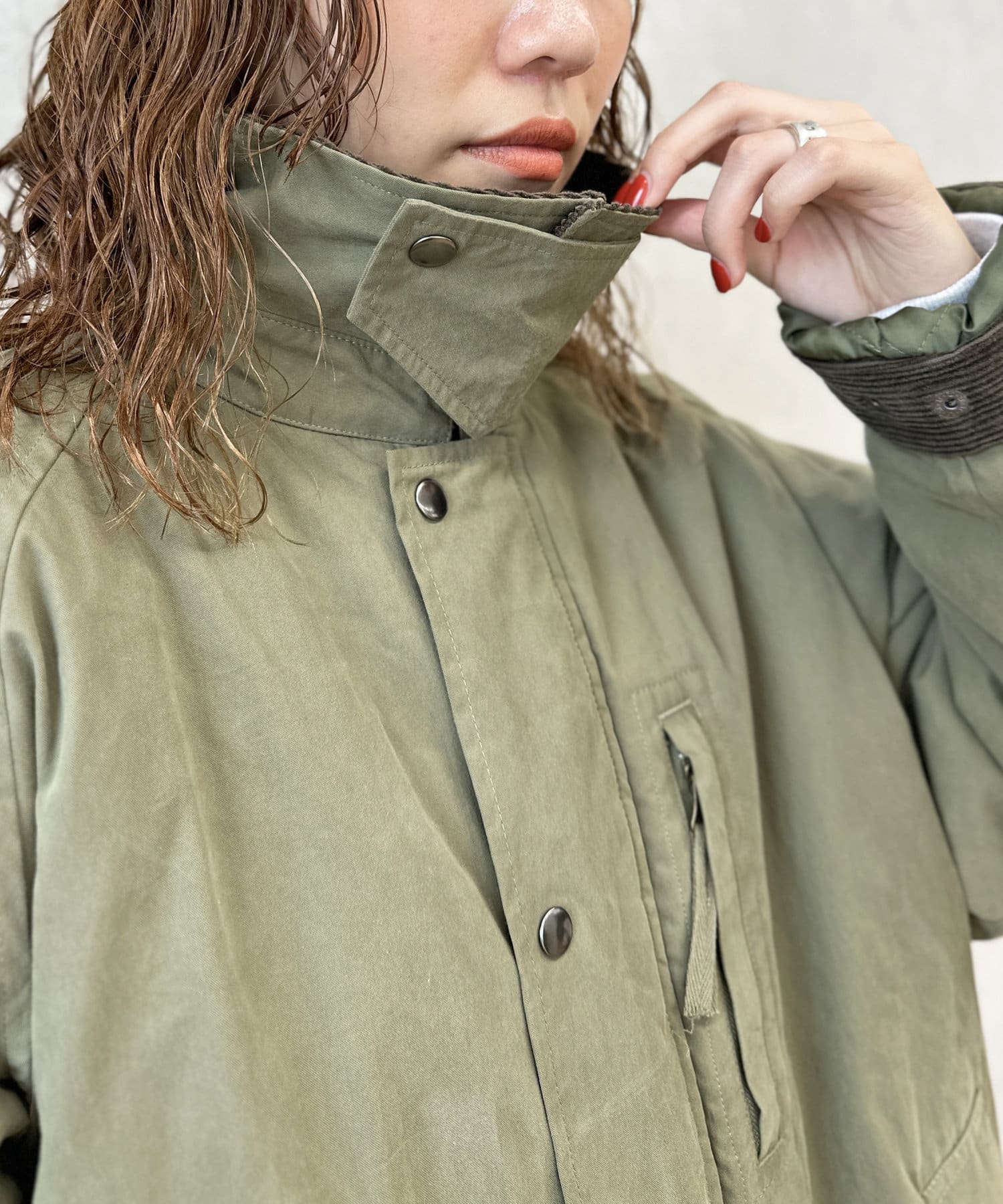 なじみの良いコーデュロイカラーはスタンドネックにもできるスナップボタン付きです。