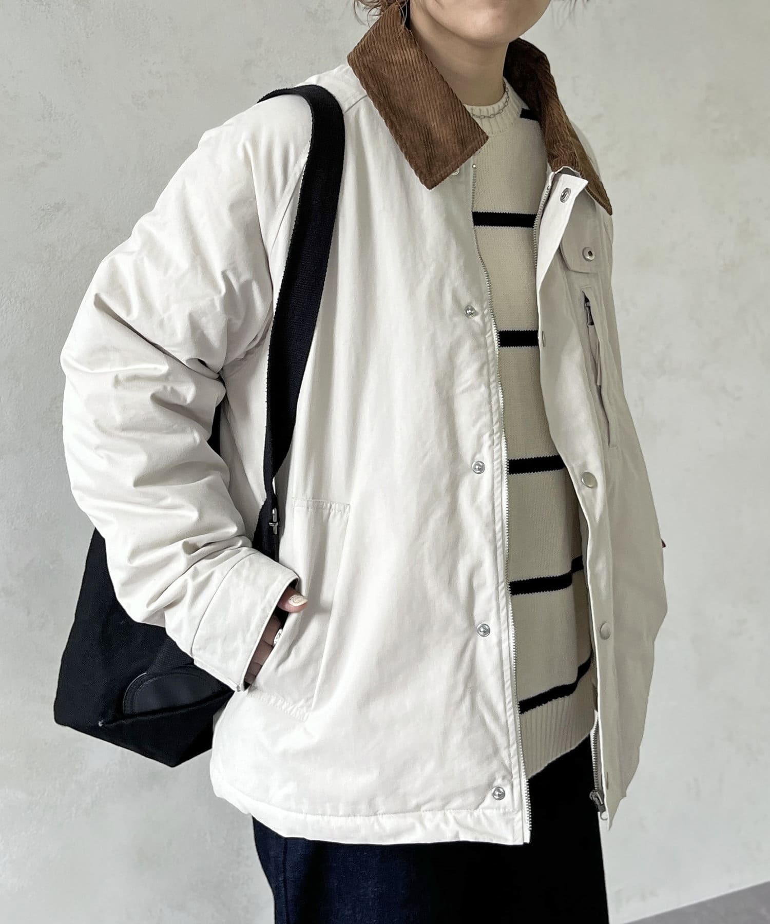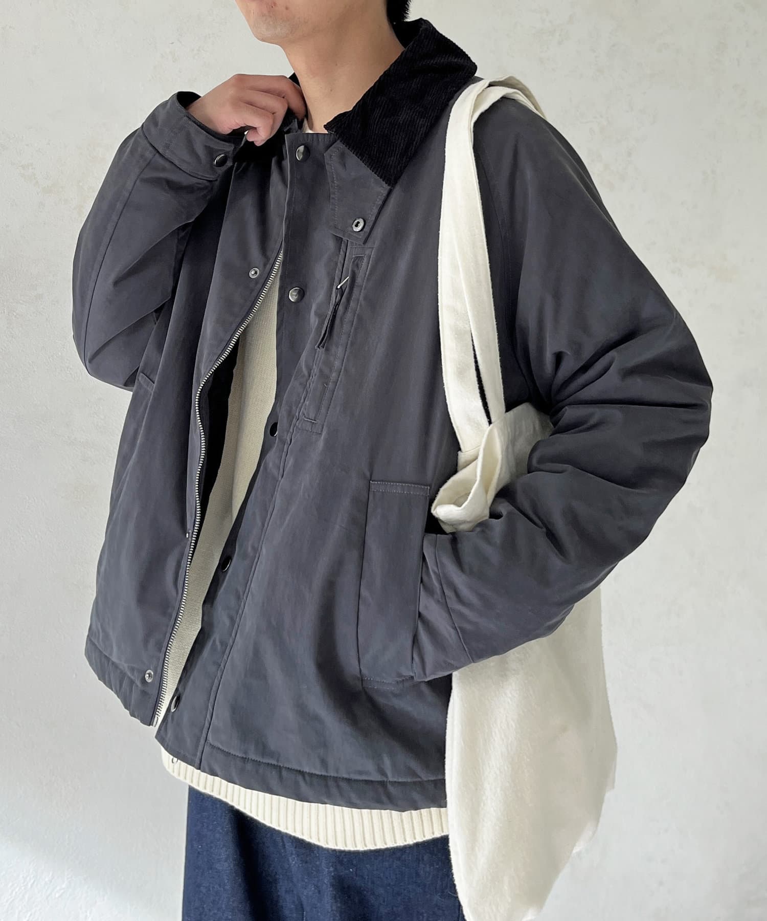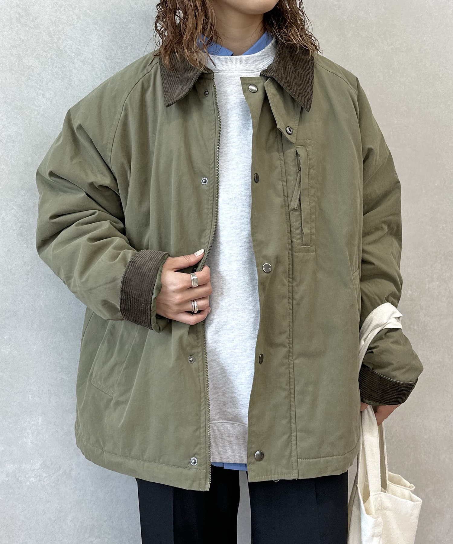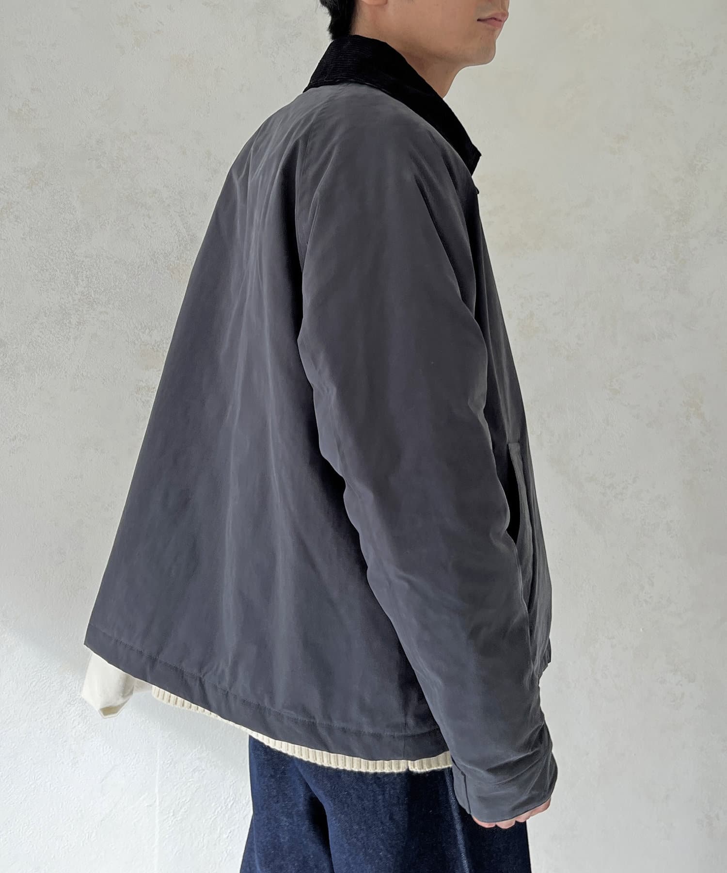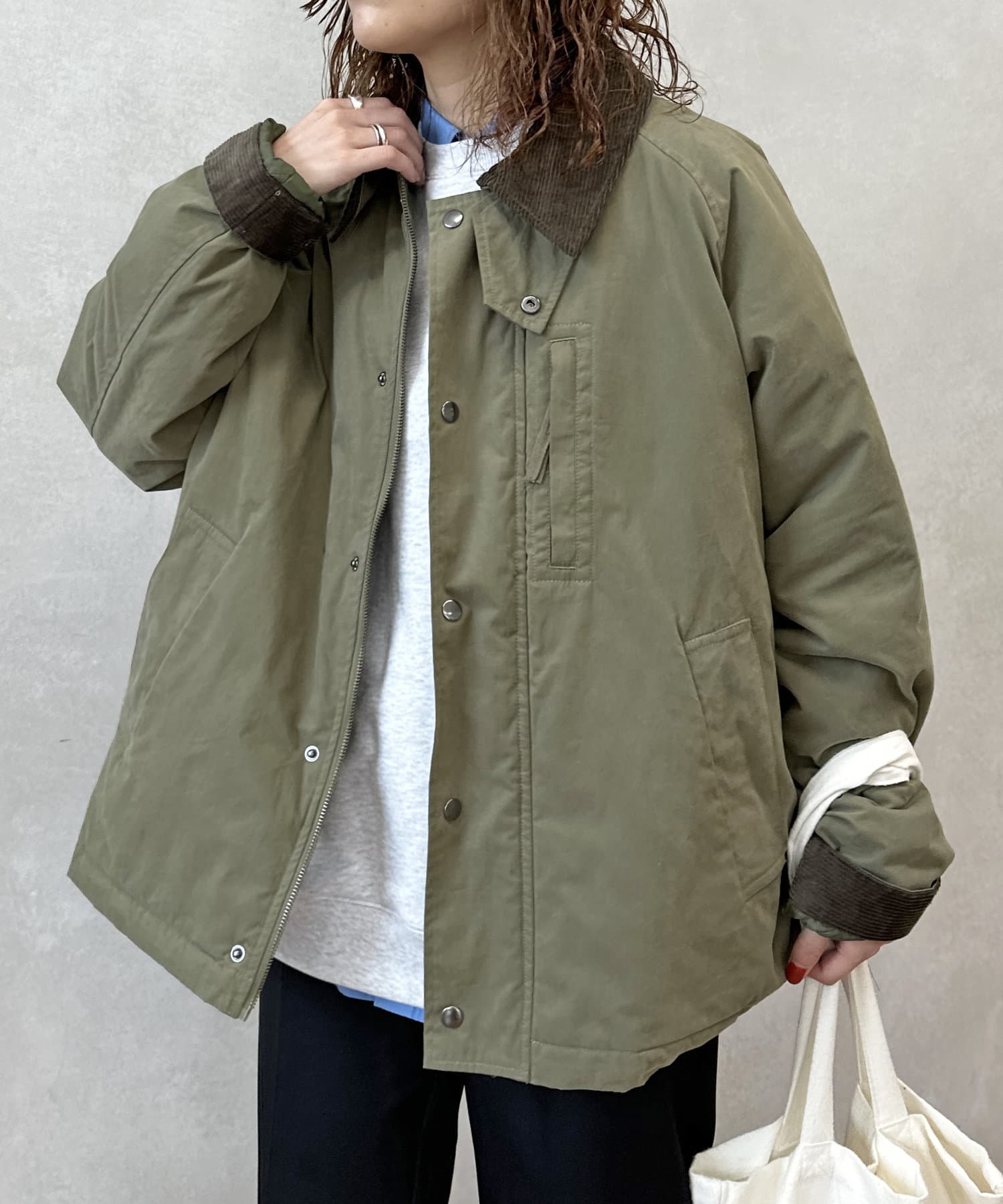 襟がコーデュロイ素材でスタイリッシュに着まわせるアイテム。