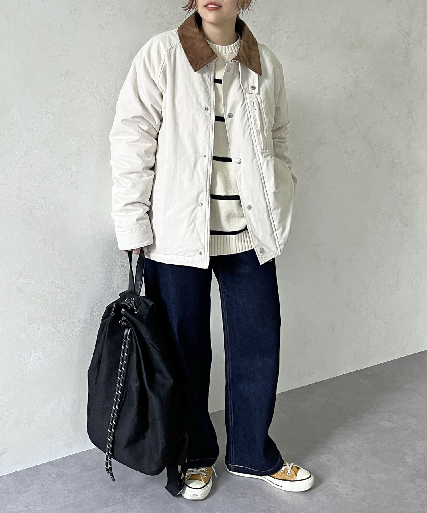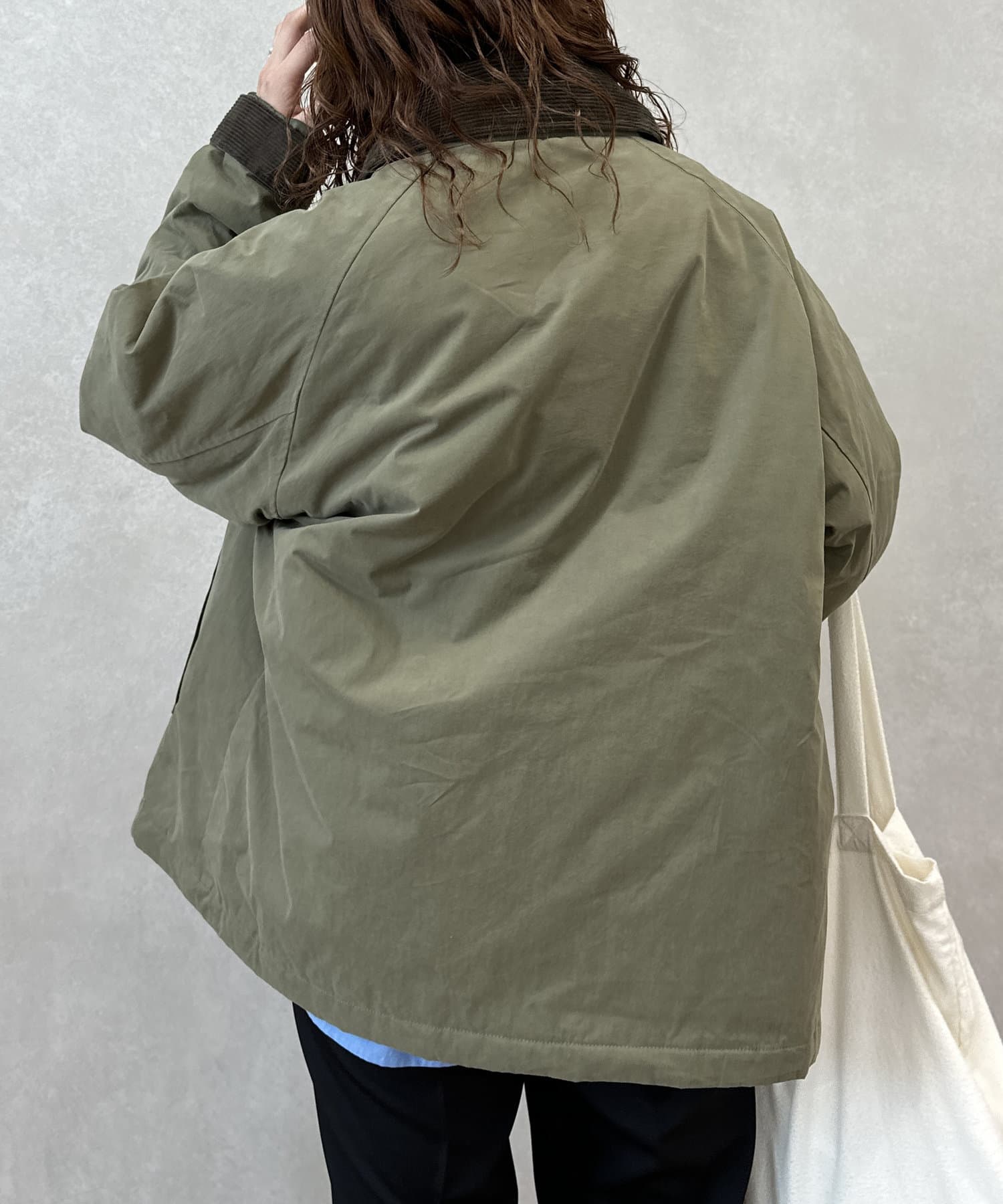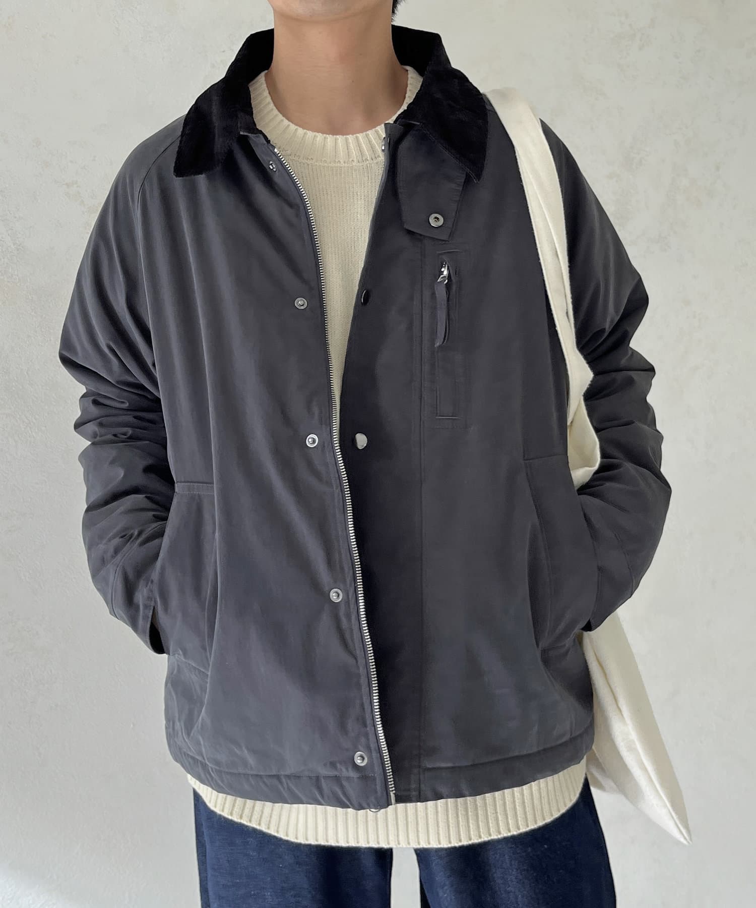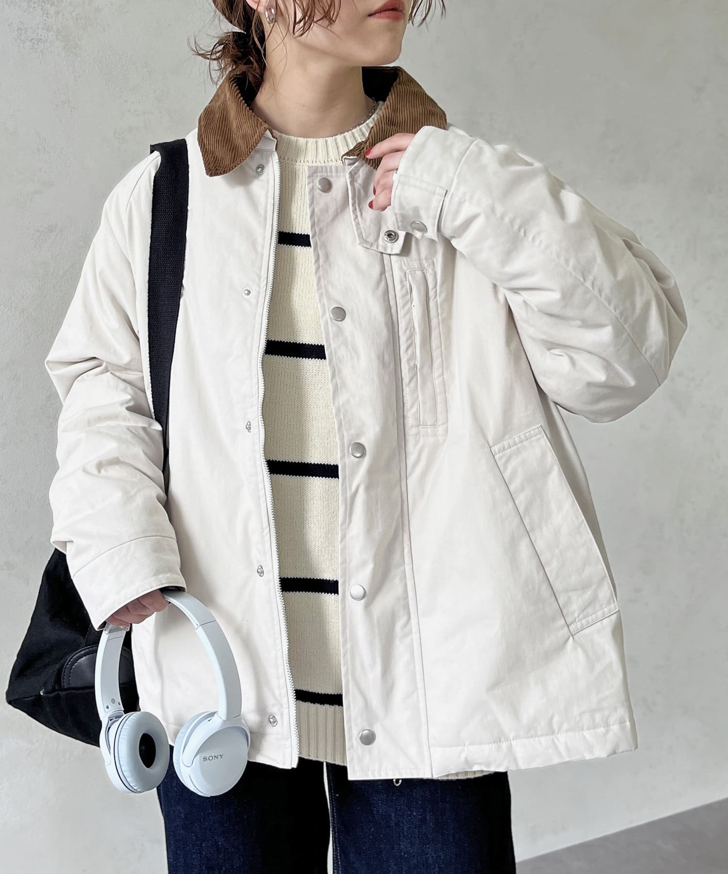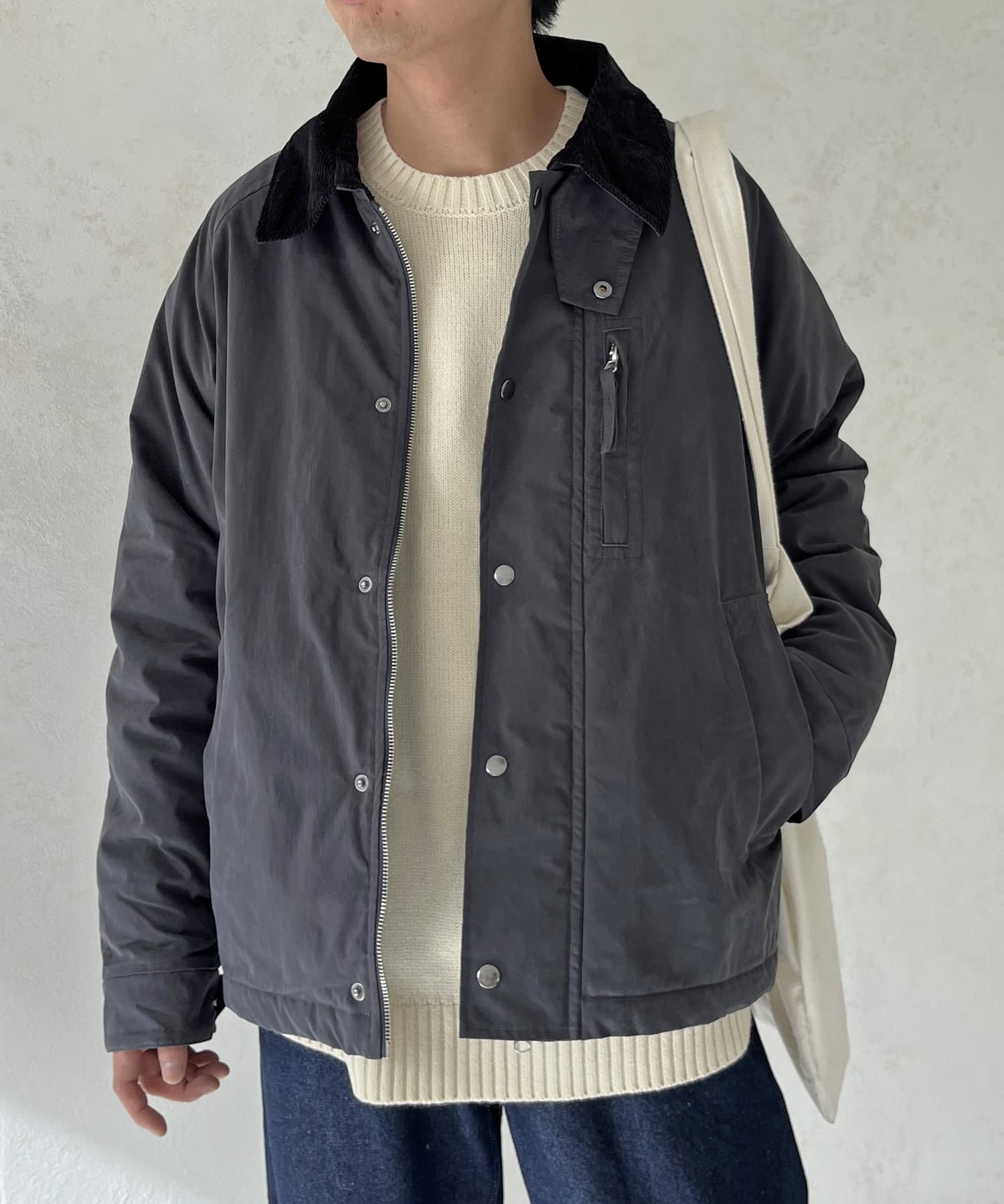 襟がコーデュロイ素材でスタイリッシュに着まわせるアイテム。