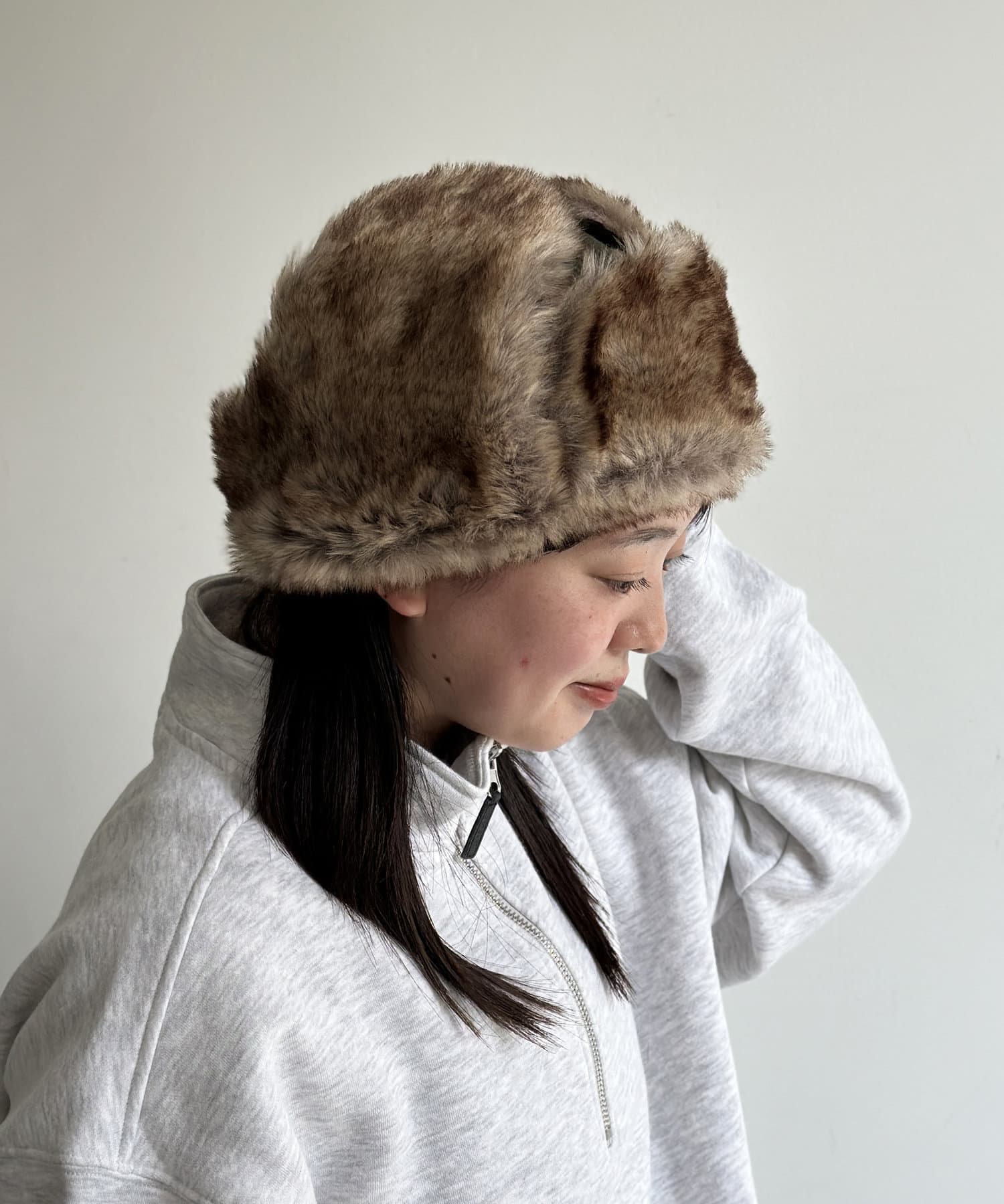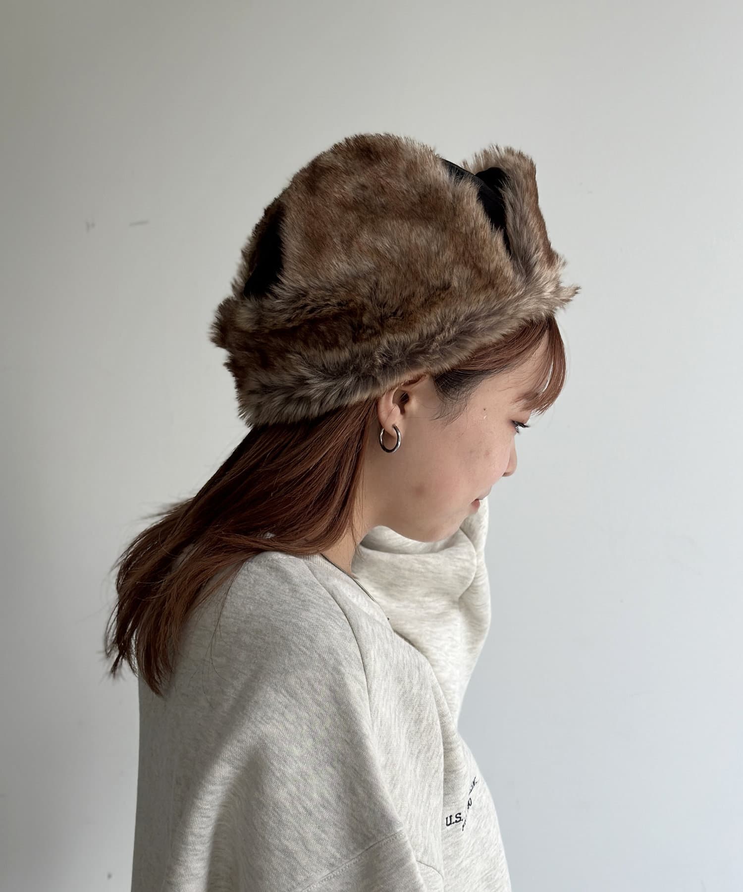 ボリュームのあるキャップなので、スウェットやニットなどのトップスアイテムと合わせるとかわいらしくかぶれます。