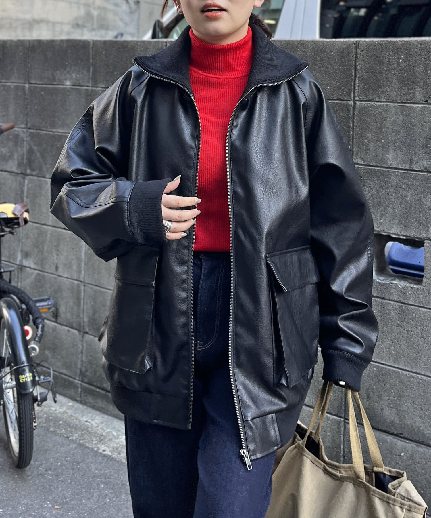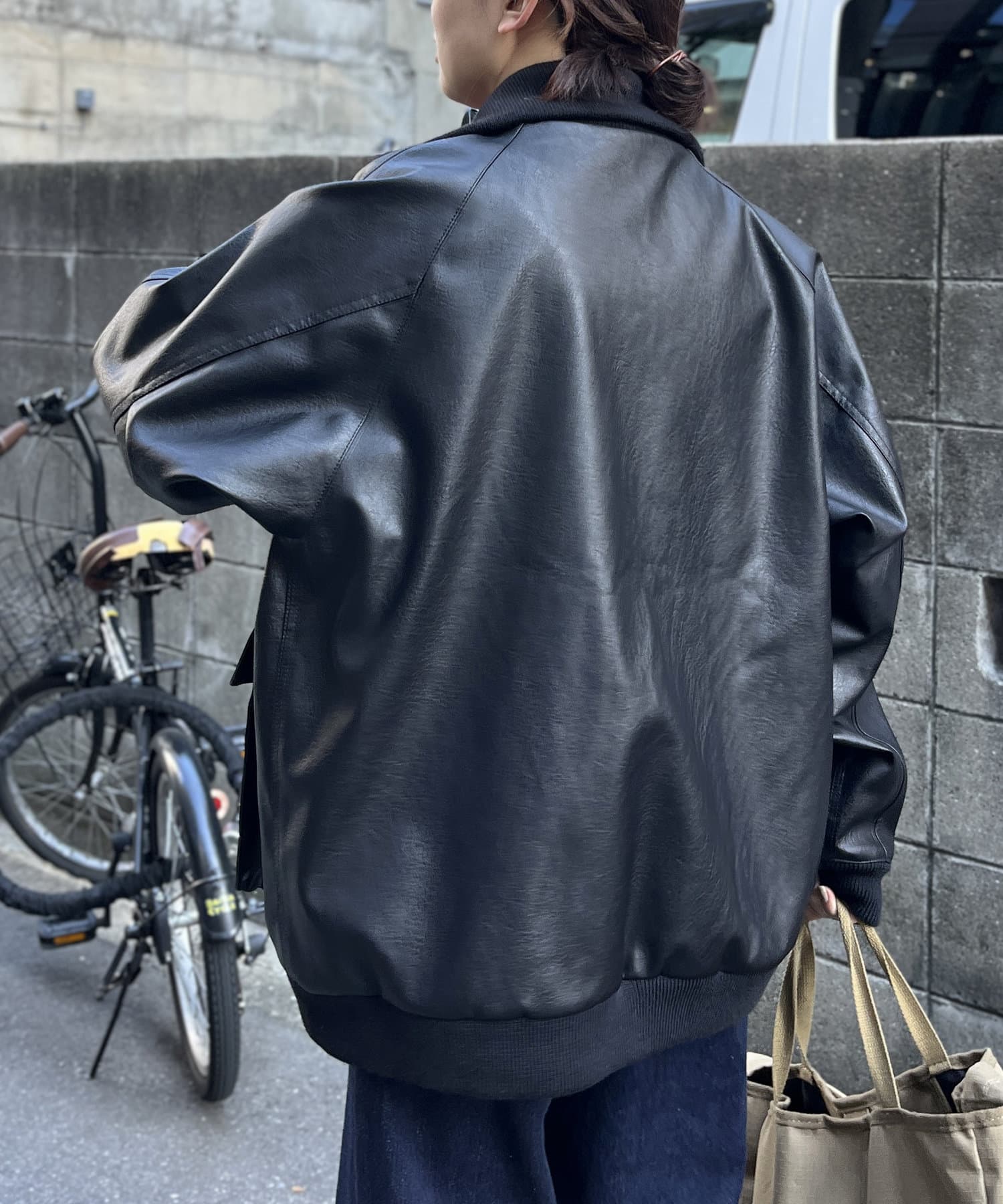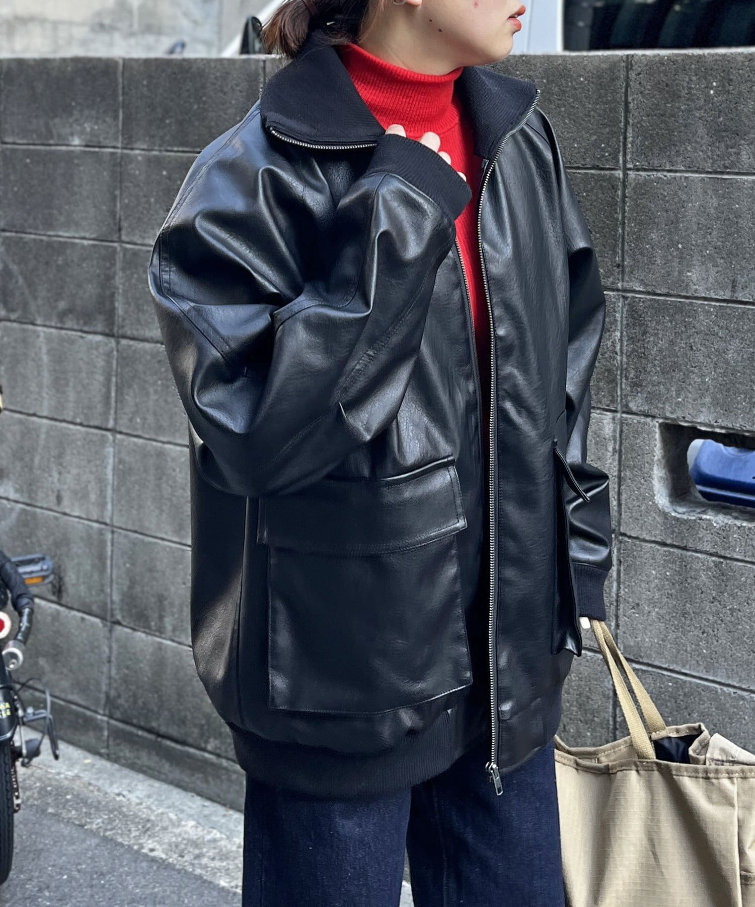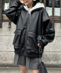 好みのシルエットにできる、フェイクレザーのスタンドリブジャケット