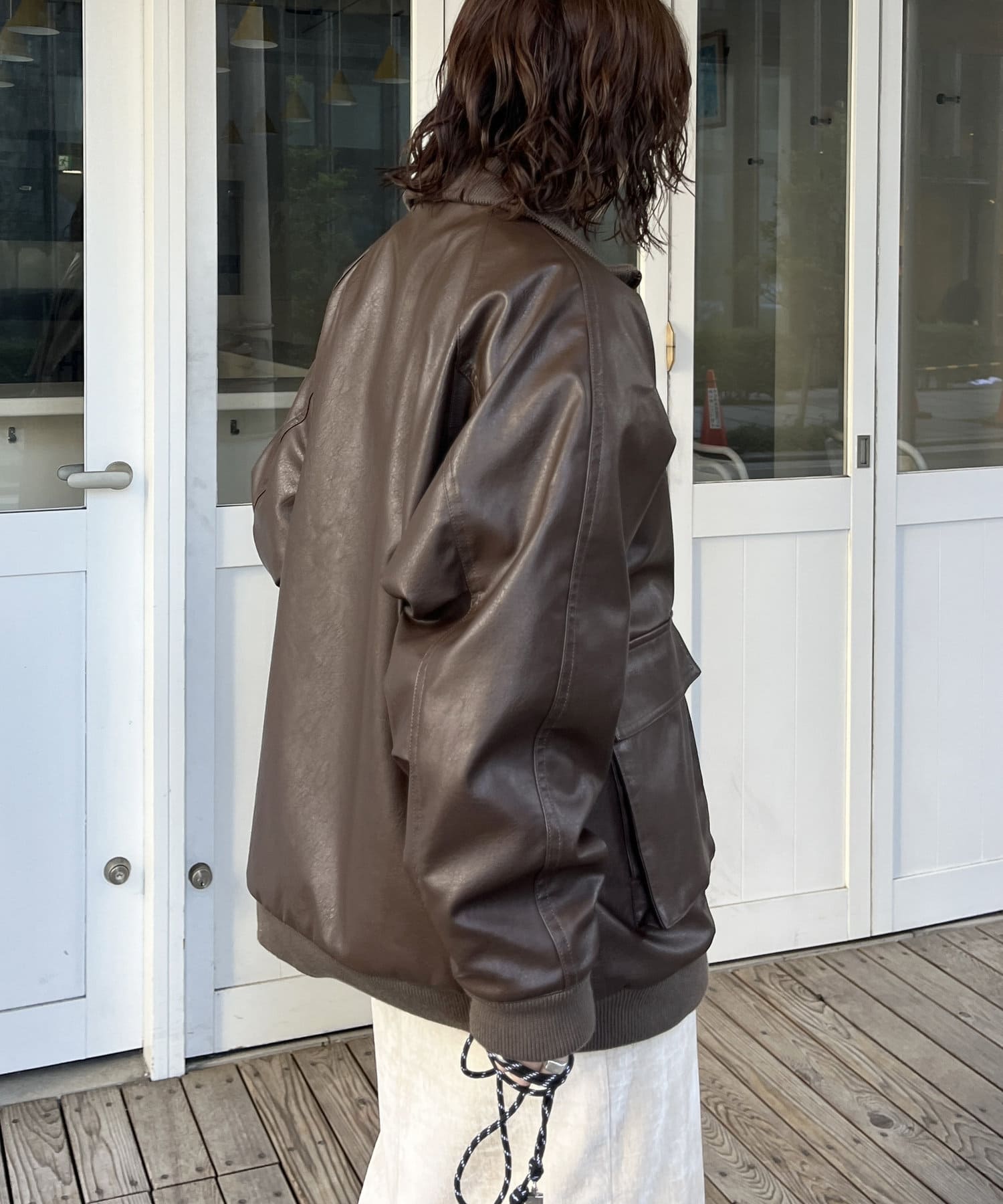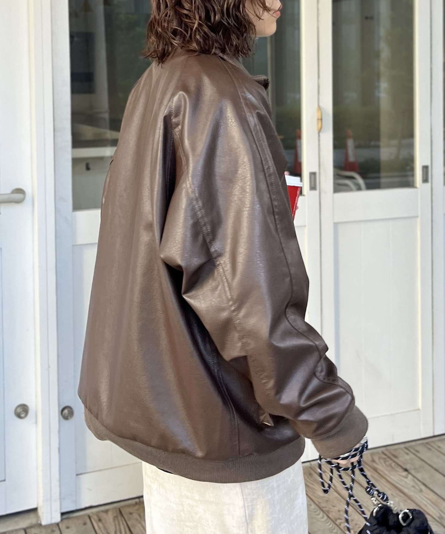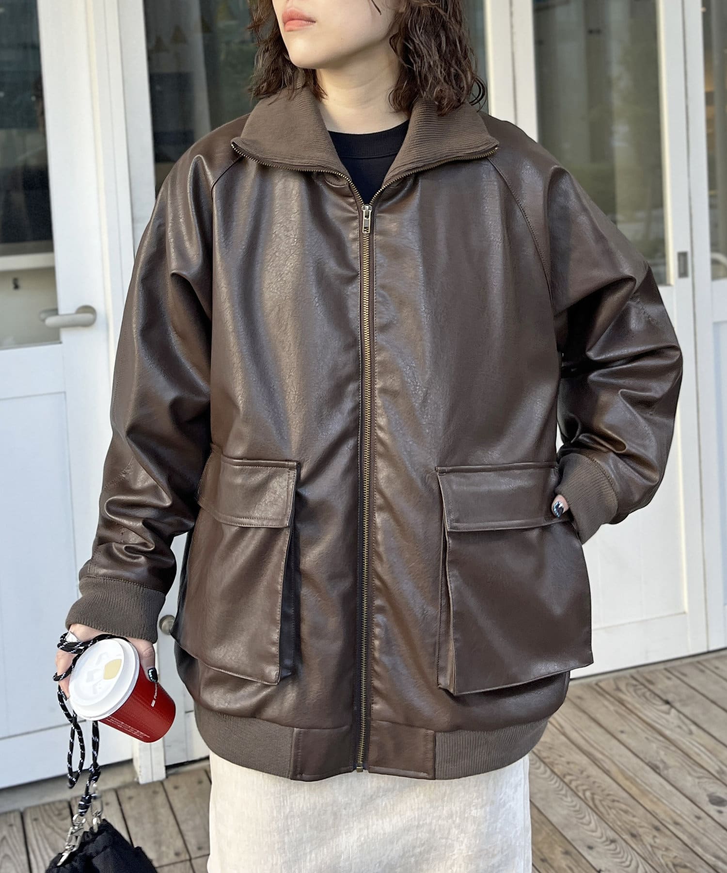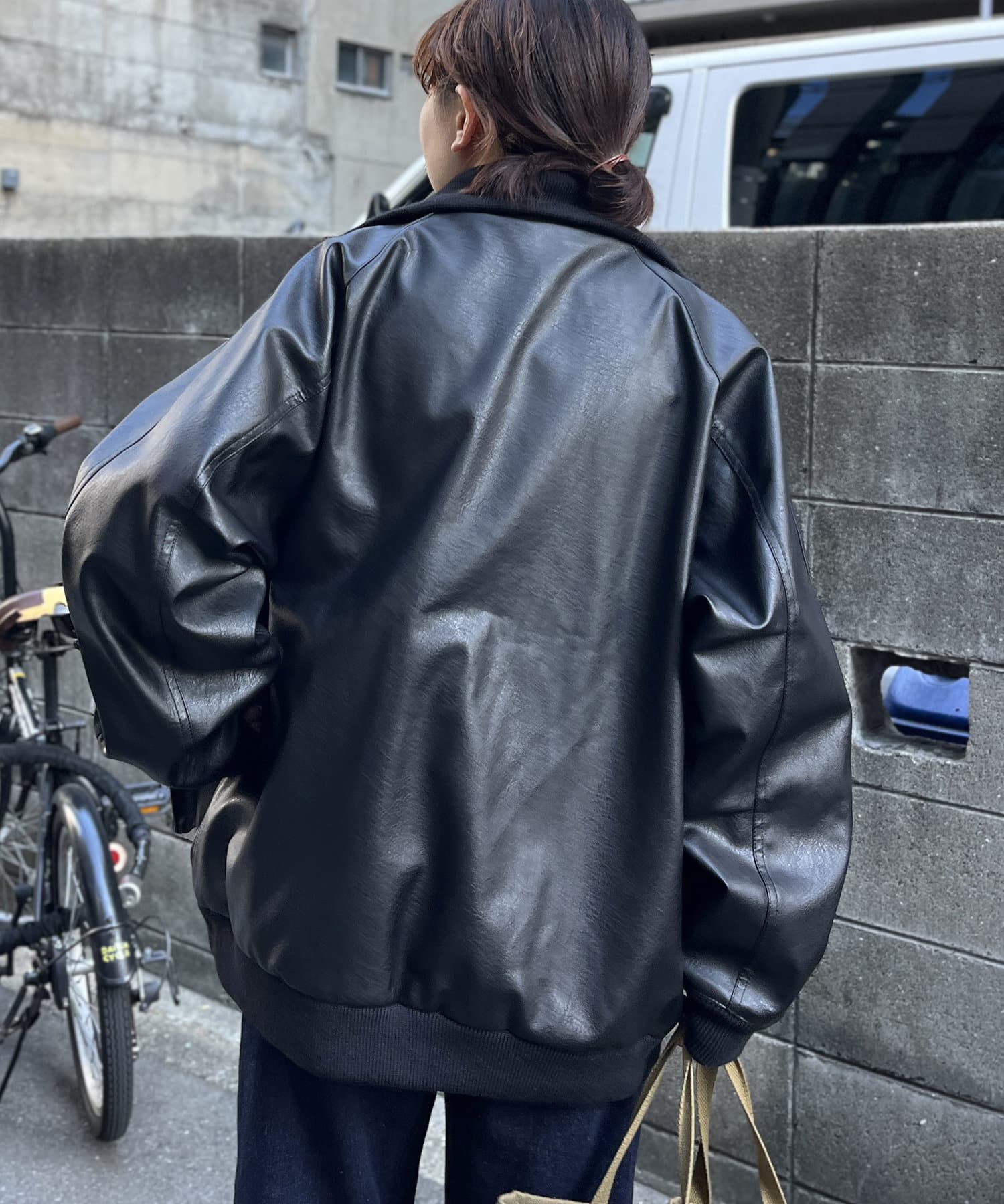 好みのシルエットにできる、フェイクレザーのスタンドリブジャケット