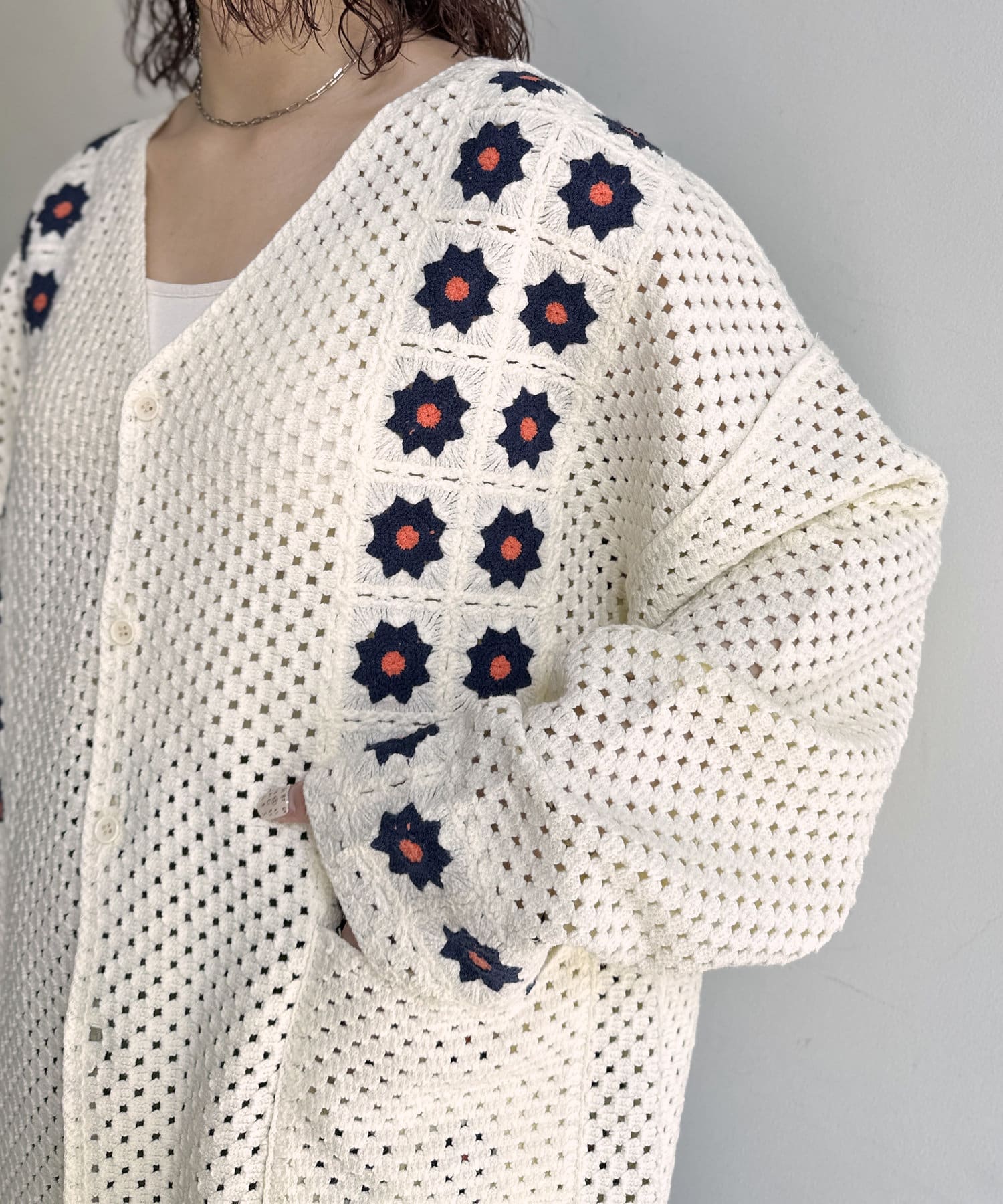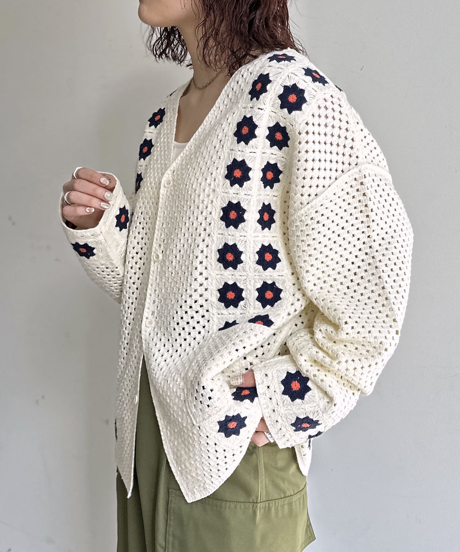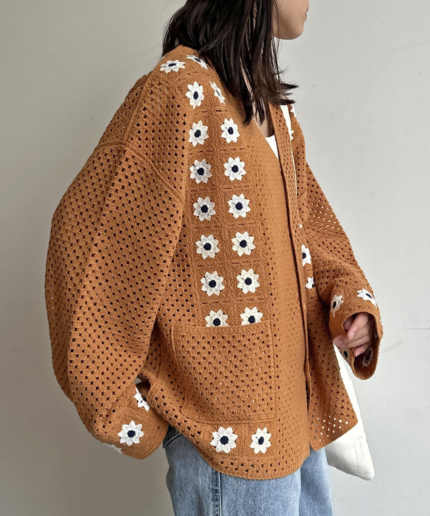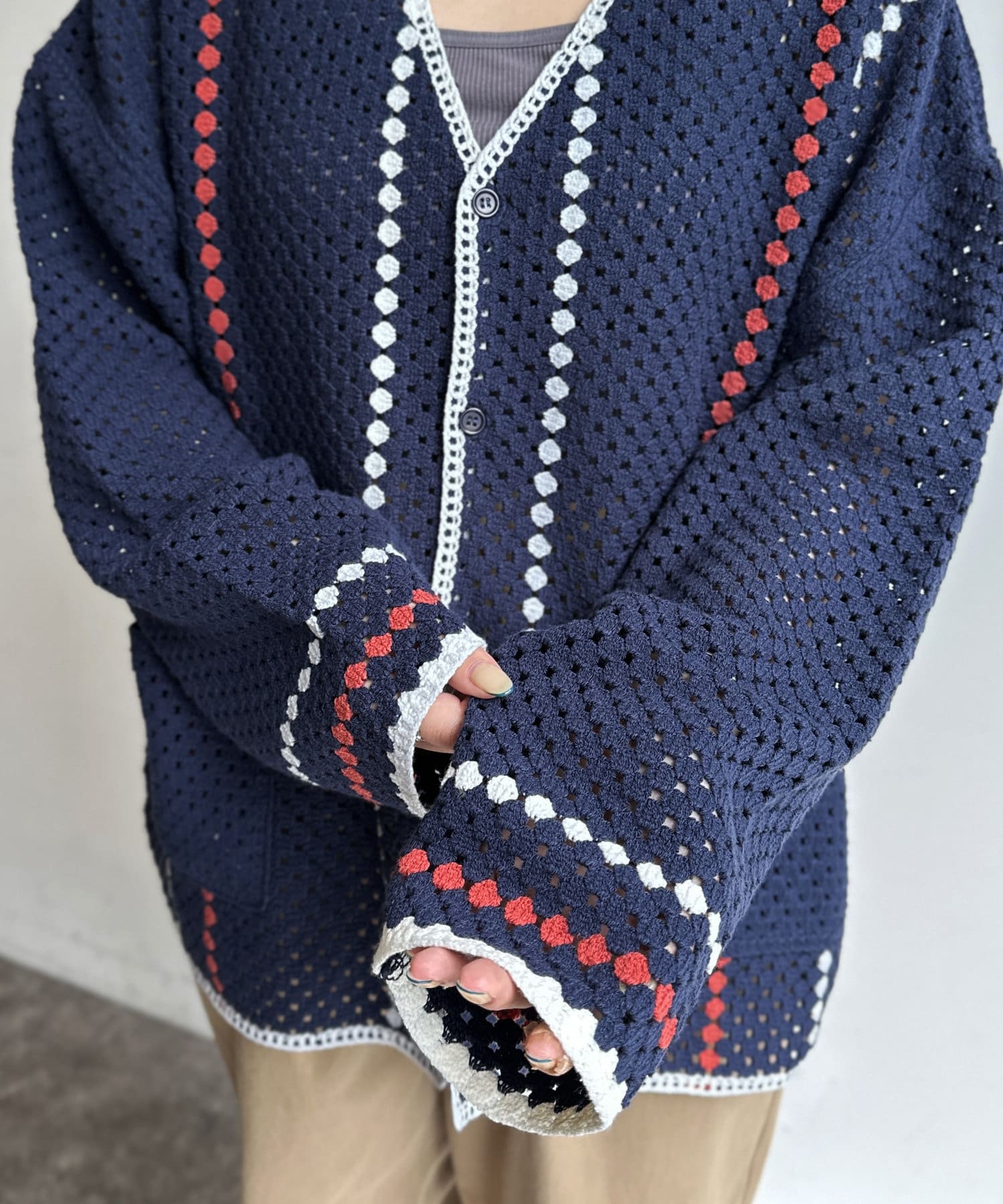 クロシェ編みのニットカーディガン