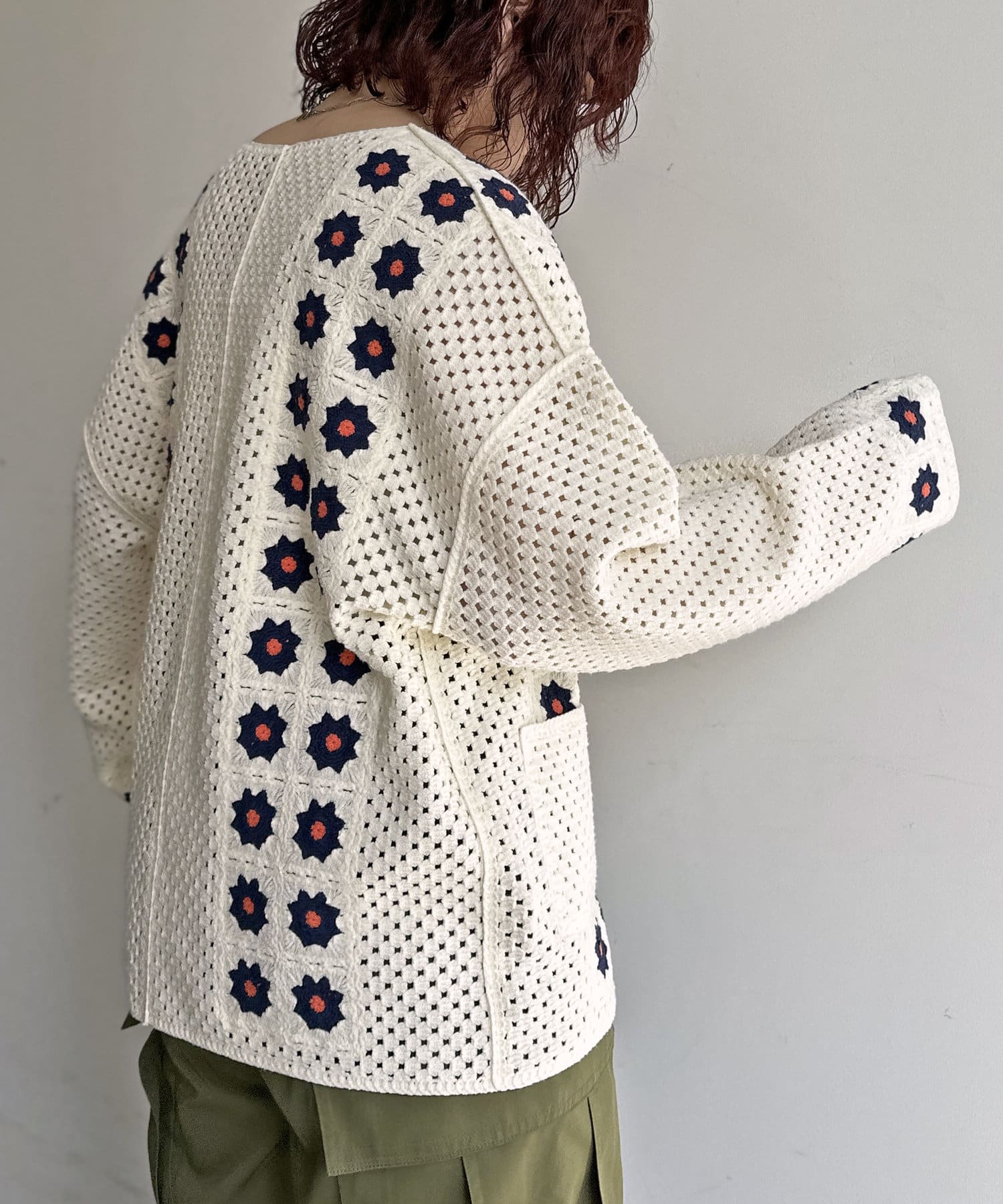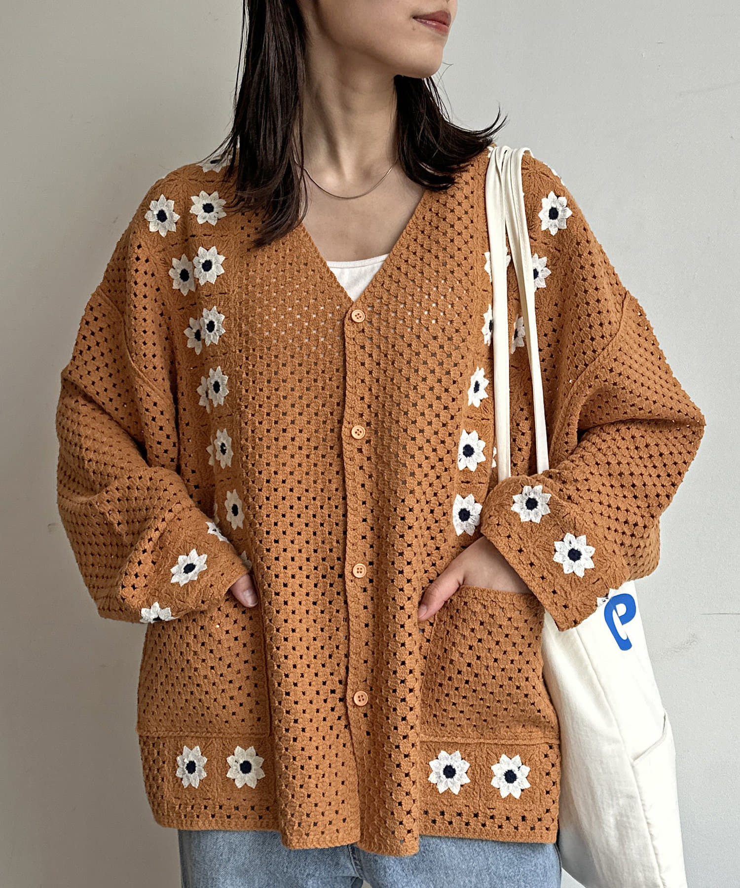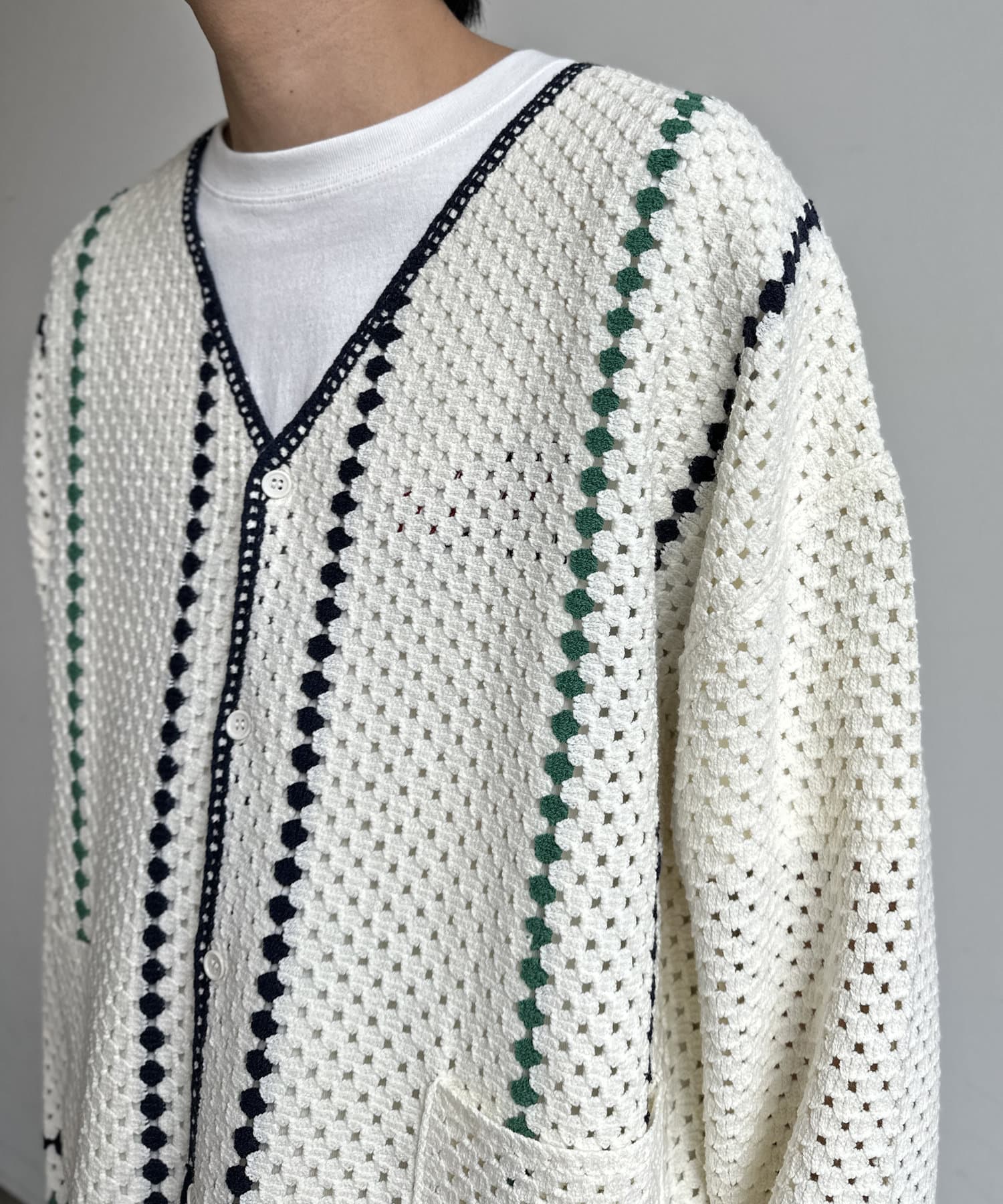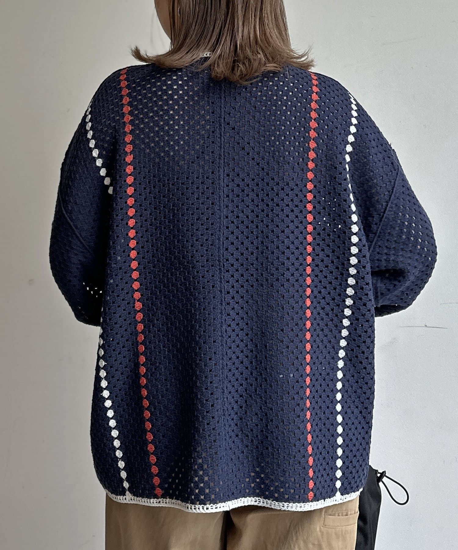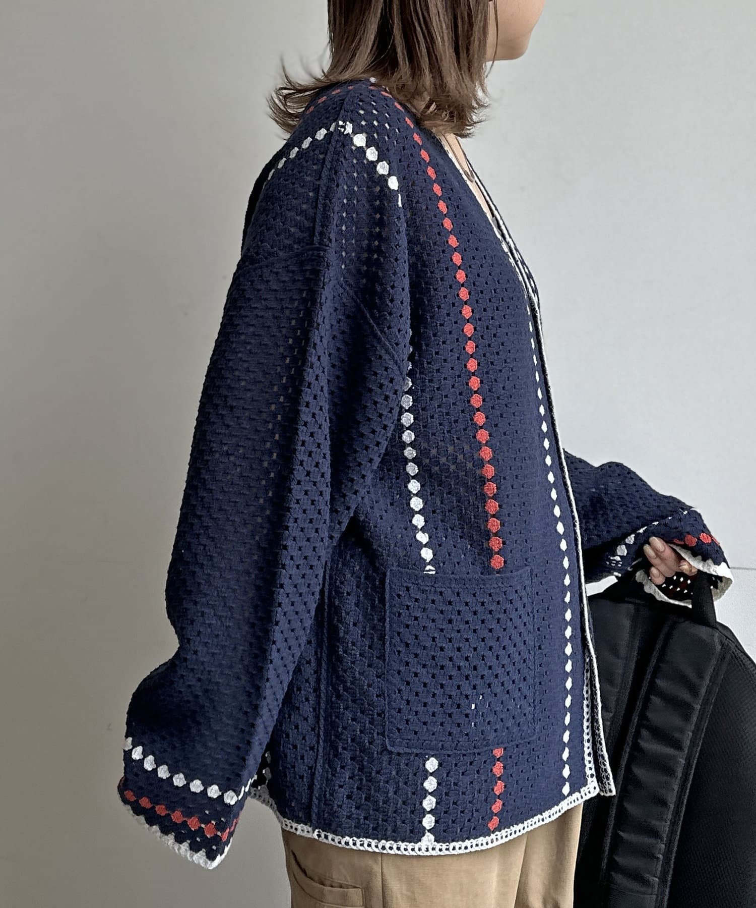 クロシェ編みのニットカーディガン