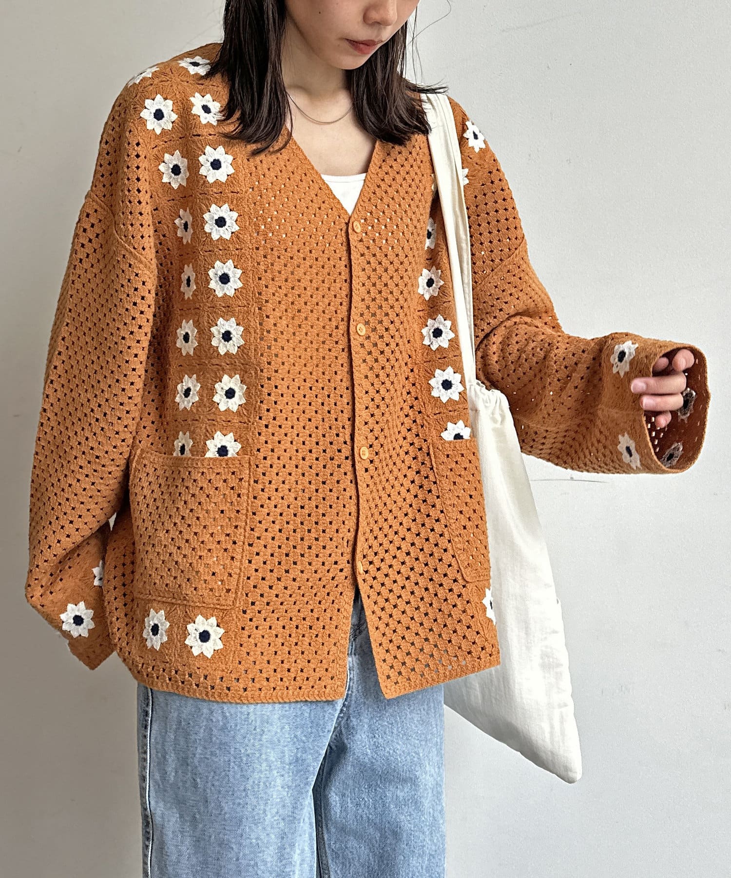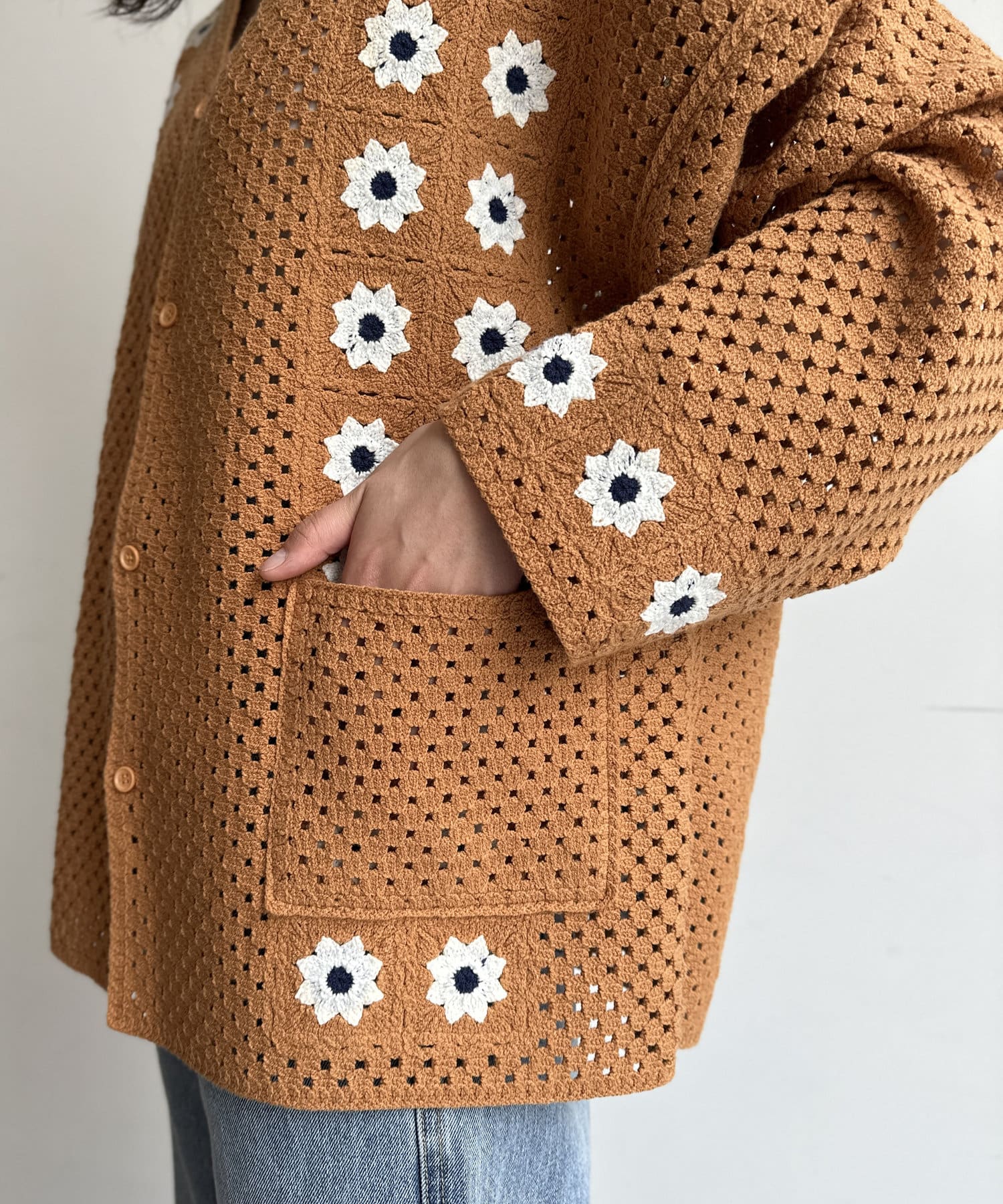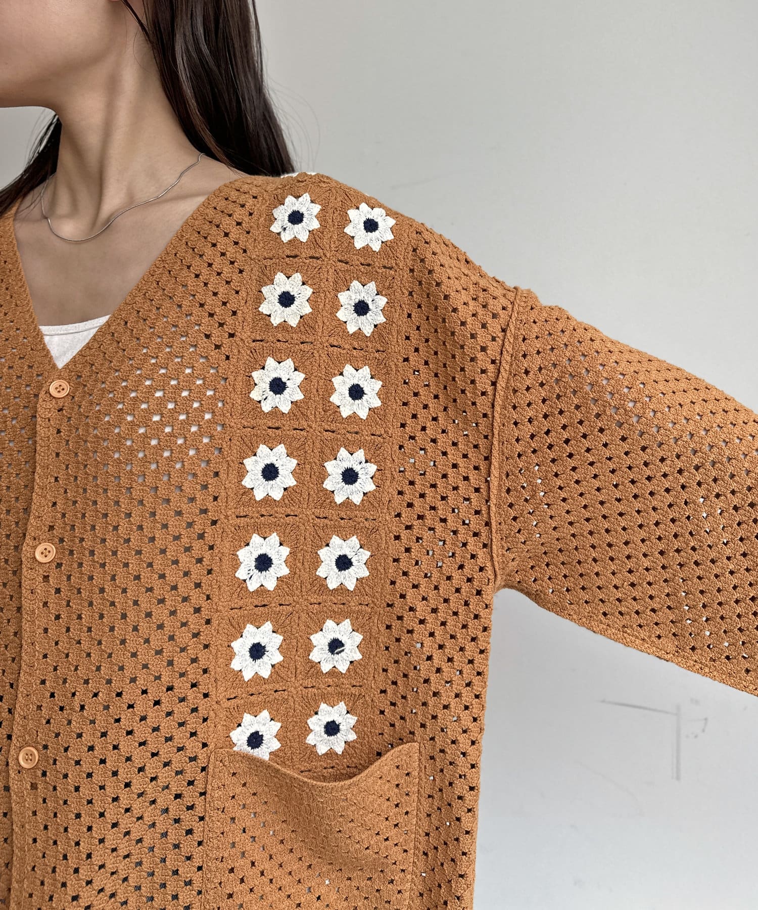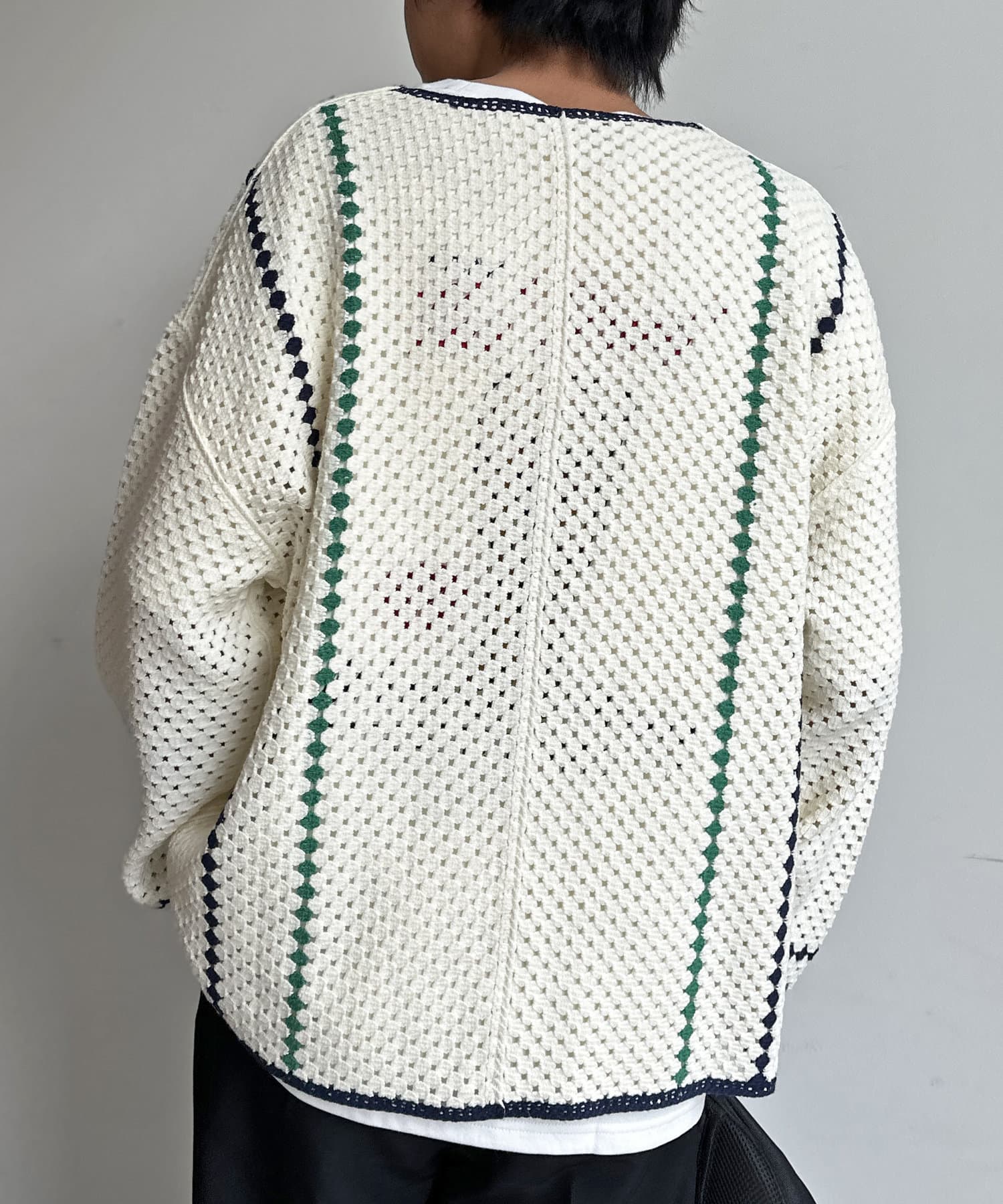 クロシェ編みのニットカーディガン