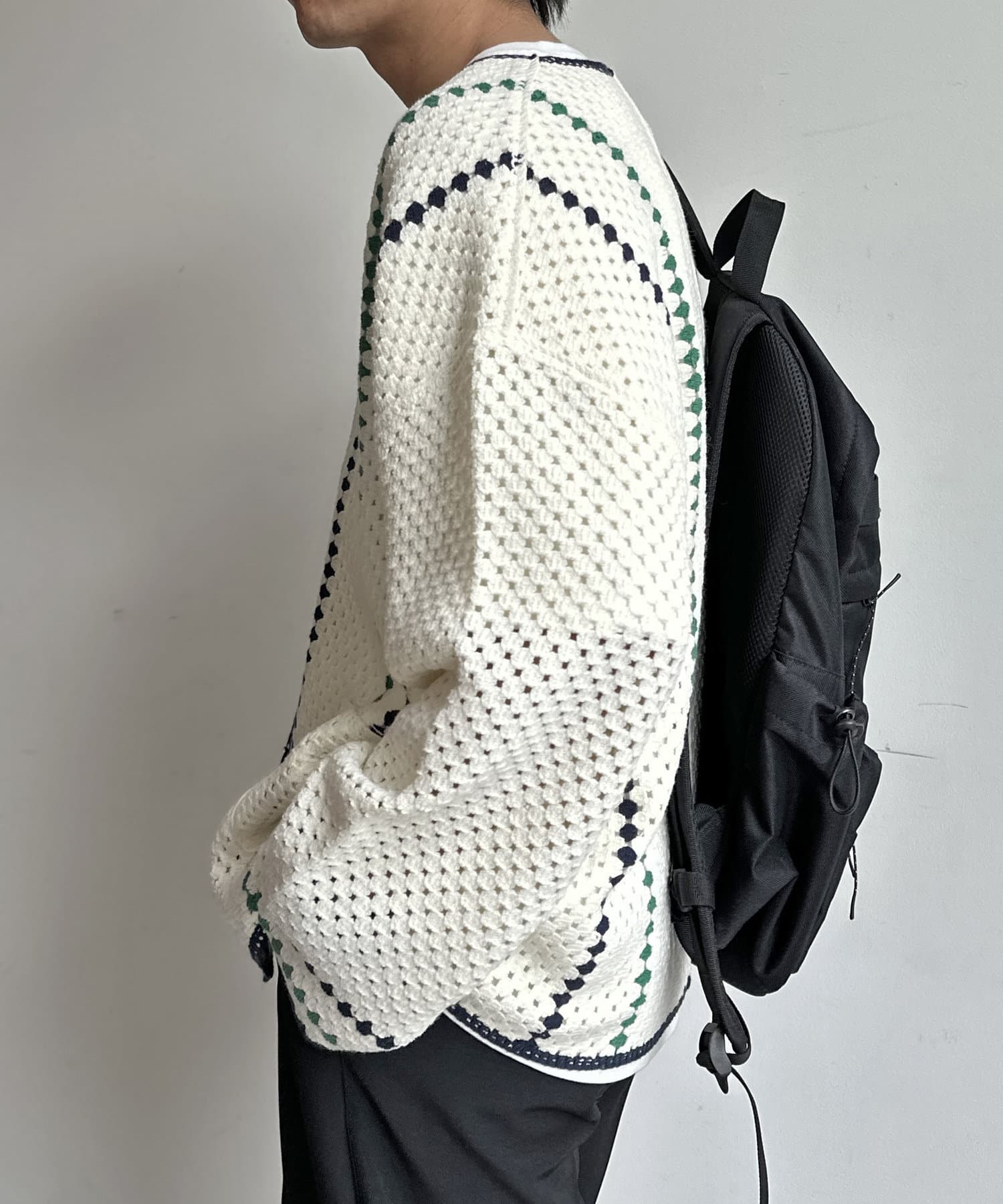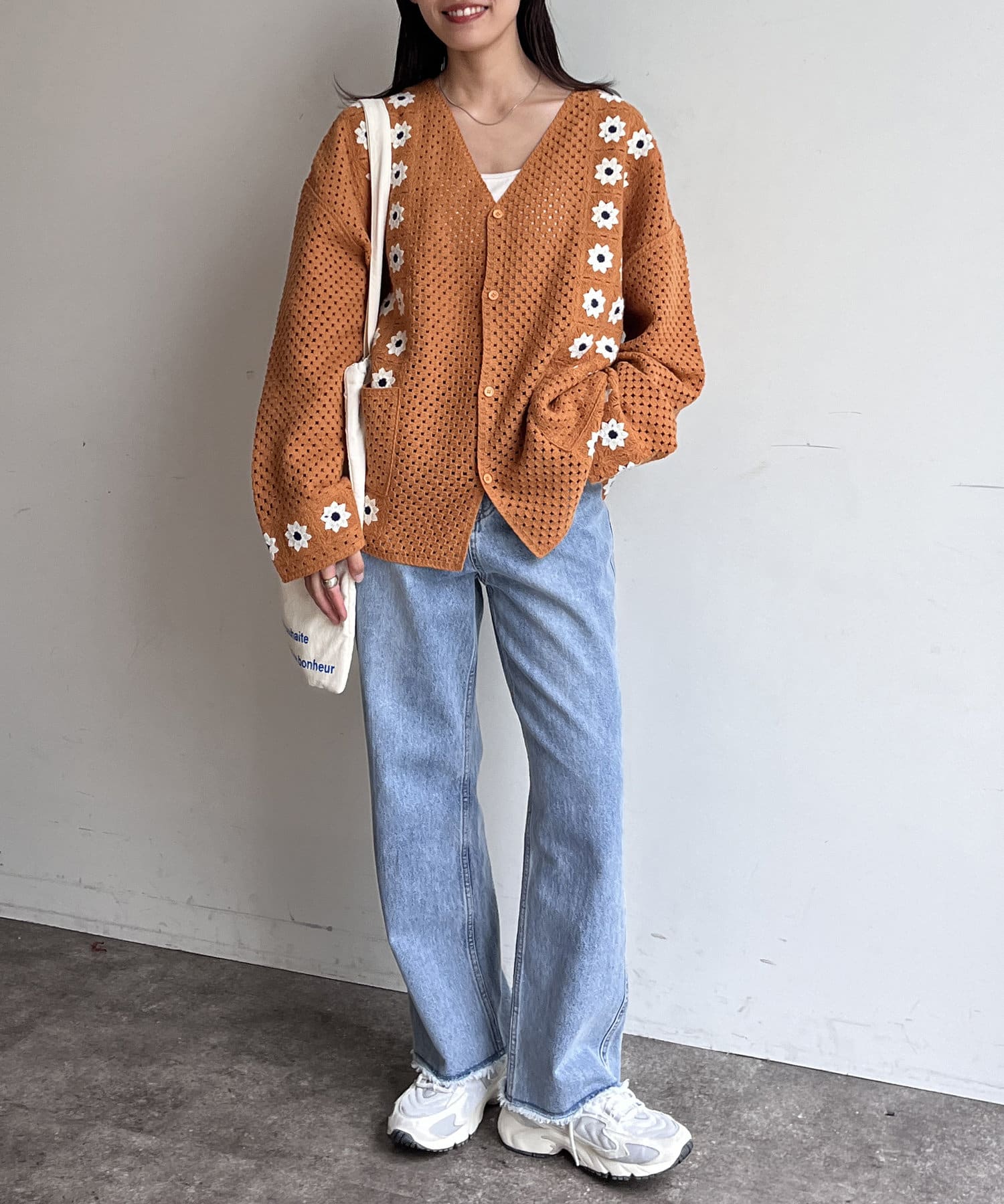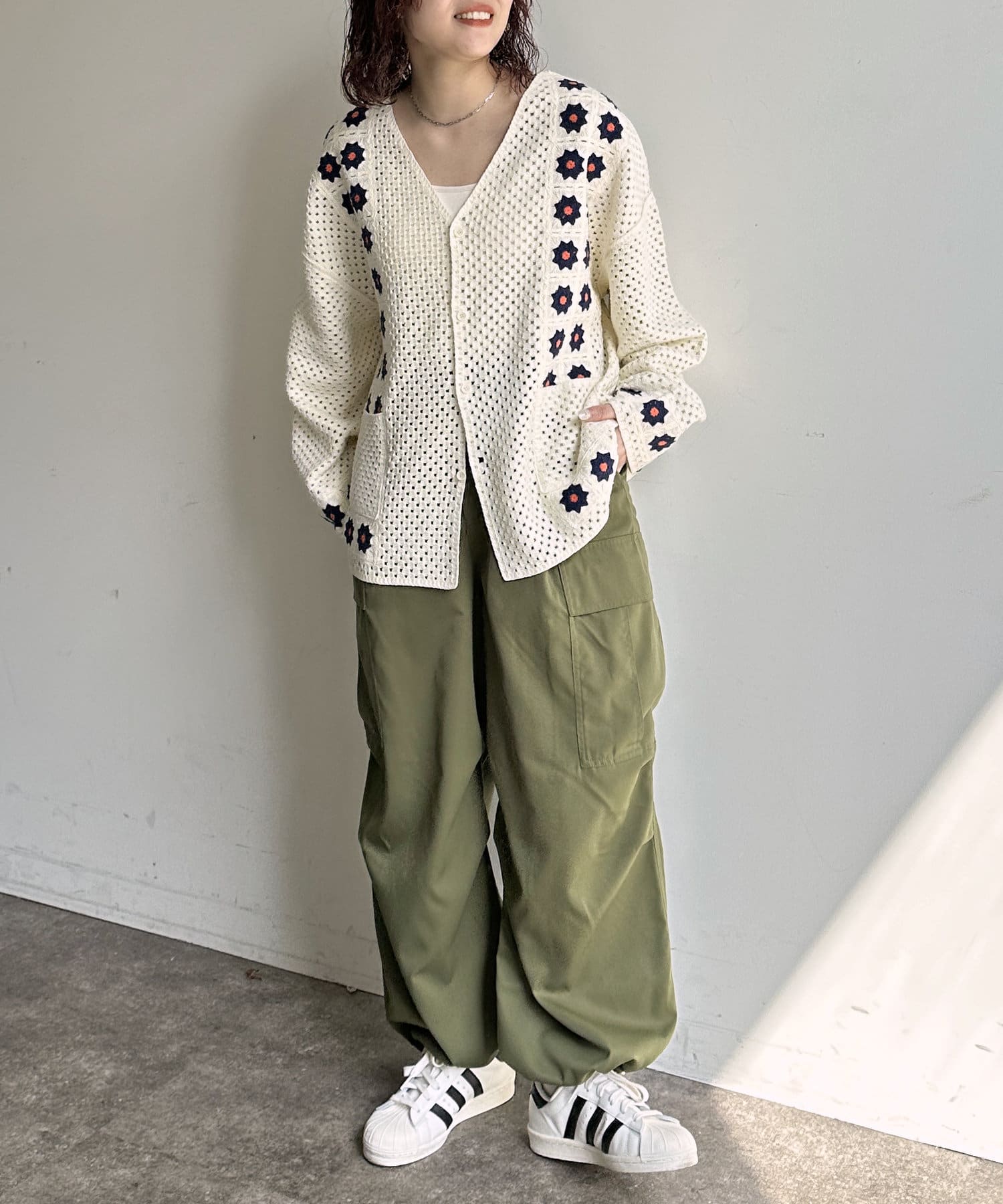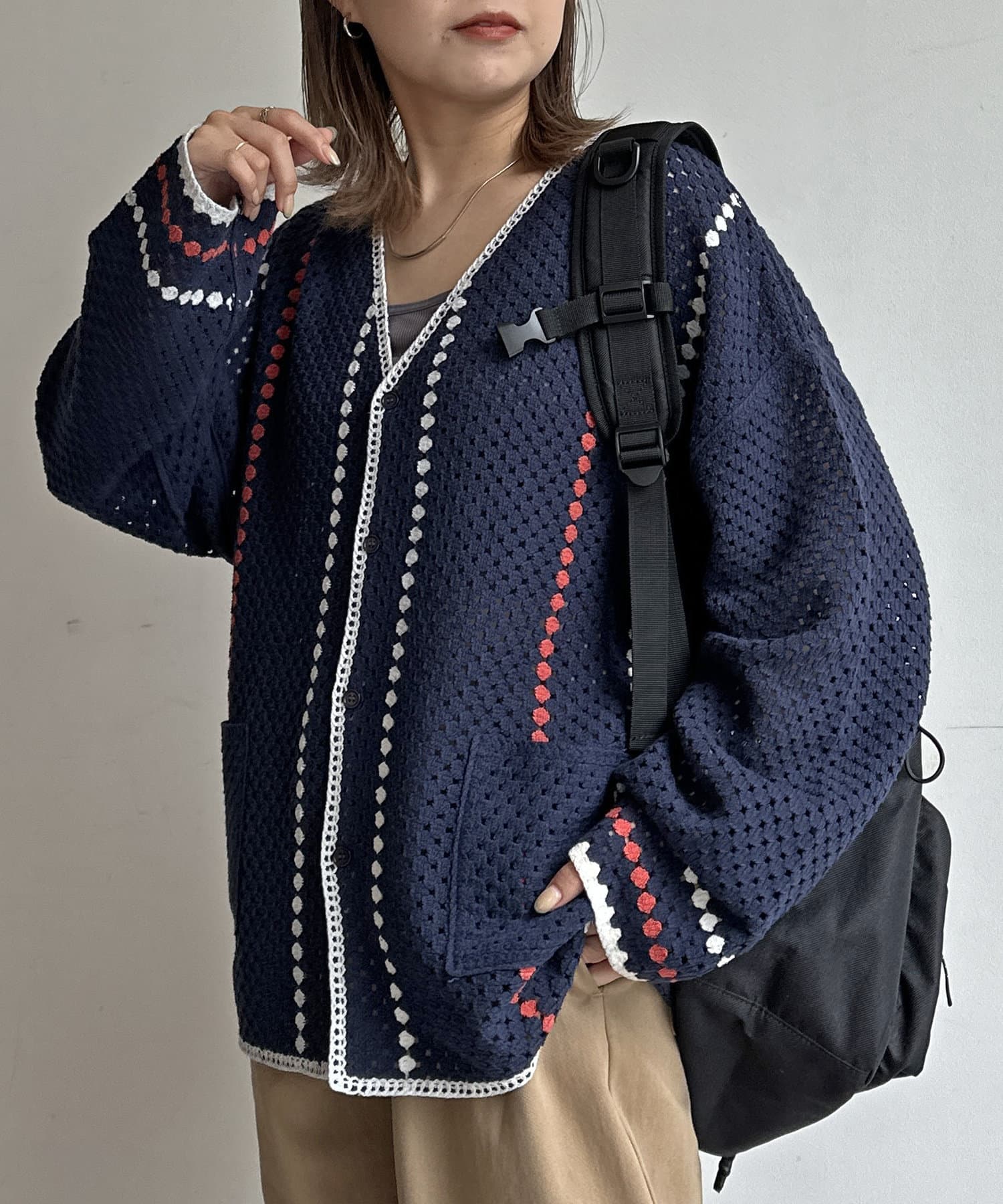 クロシェ編みのニットカーディガン