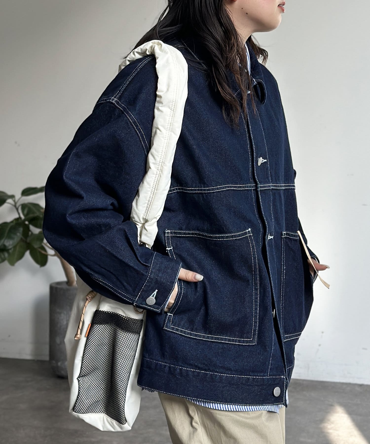合わせ方次第でメンズライクにもレディライクにも着られます!落ち着いたネイビーで合わせやすい印象。生地はしっかりしていますが、重いとは感じません。