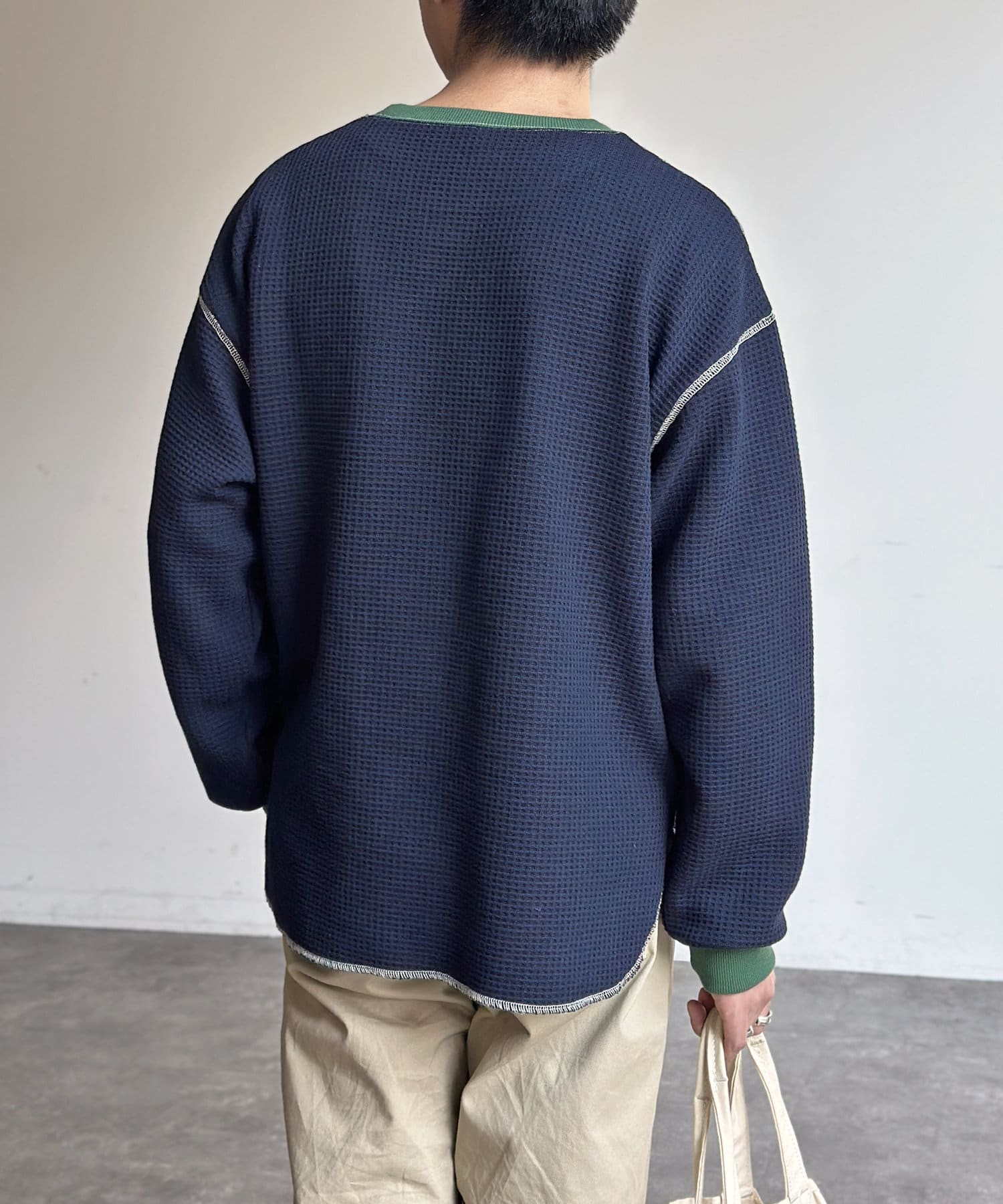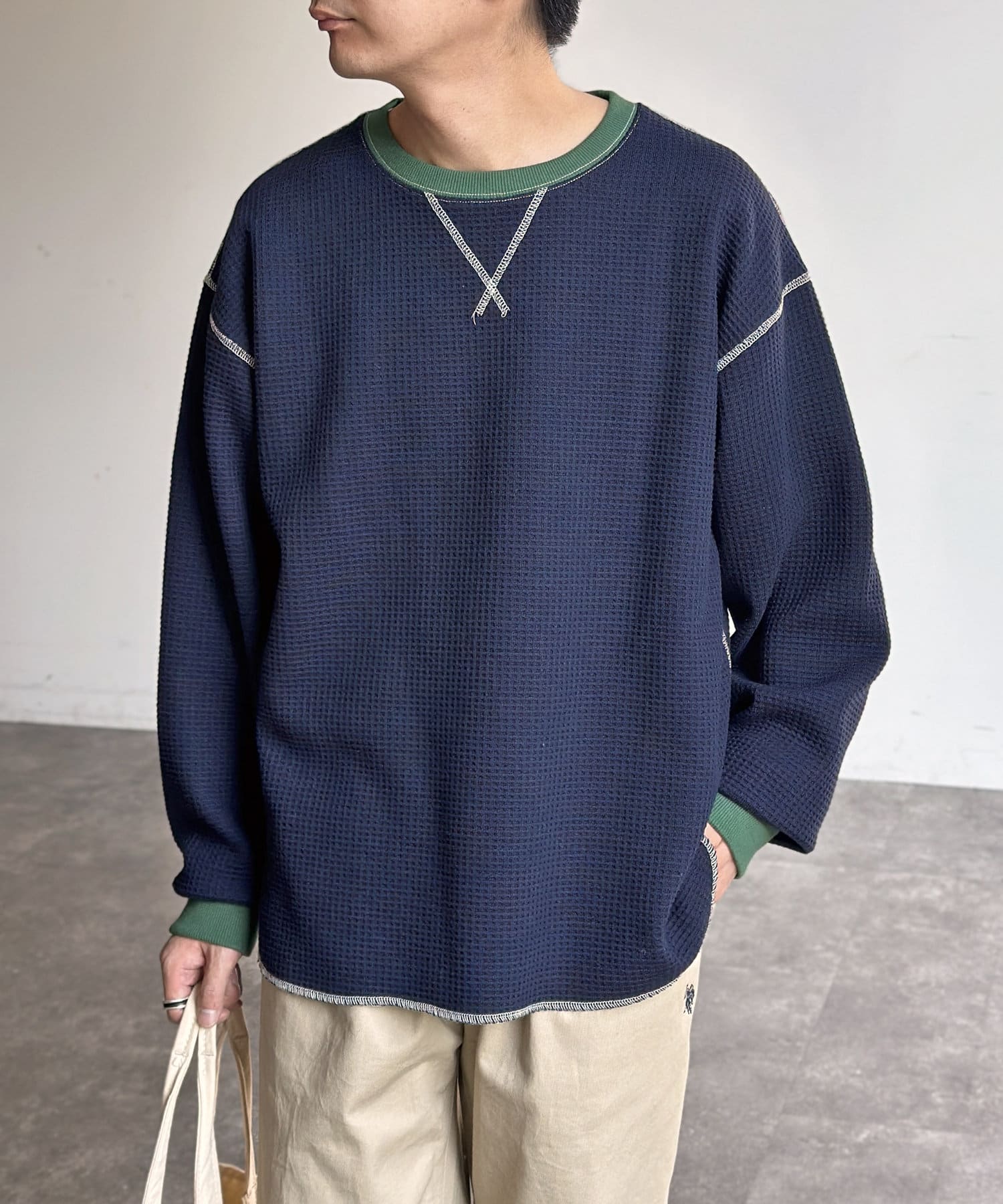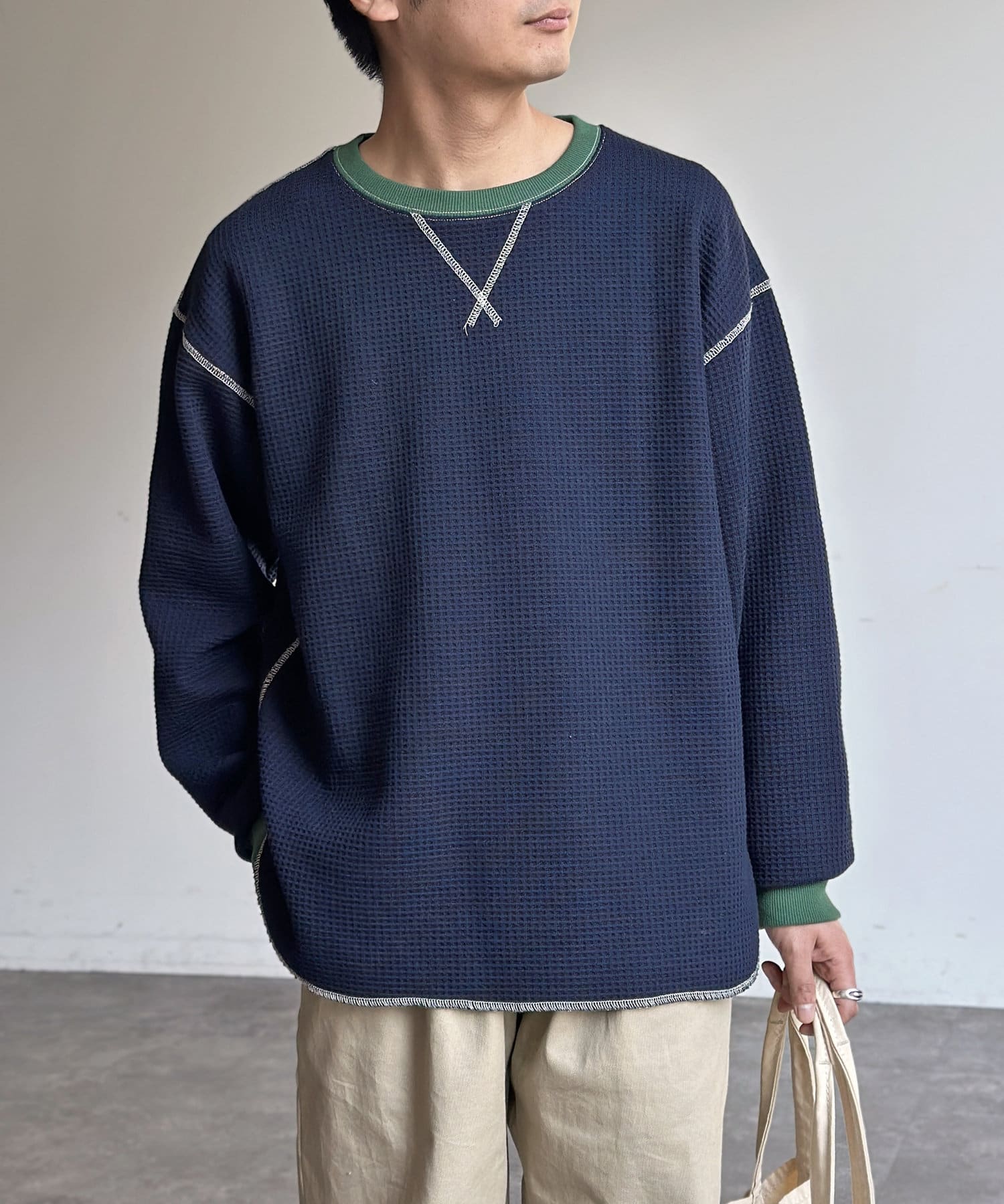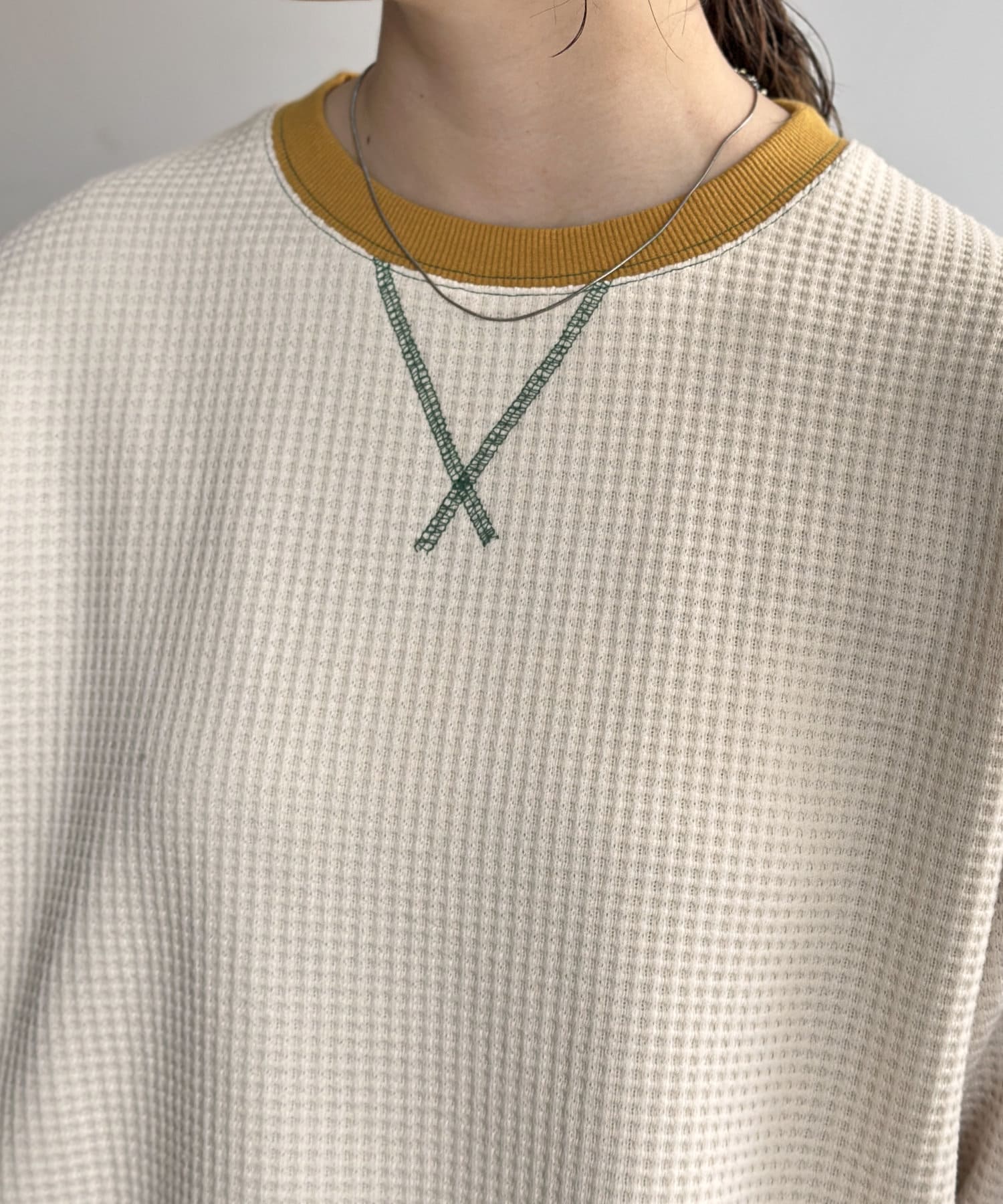 リブ配色ステッチワッフルプルオーバー