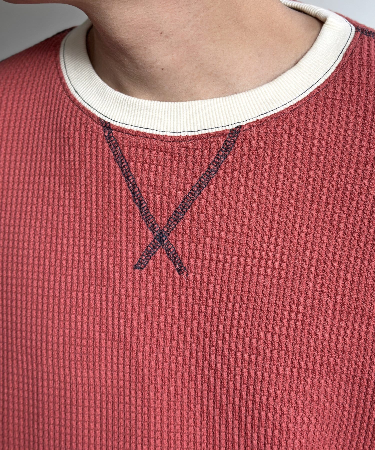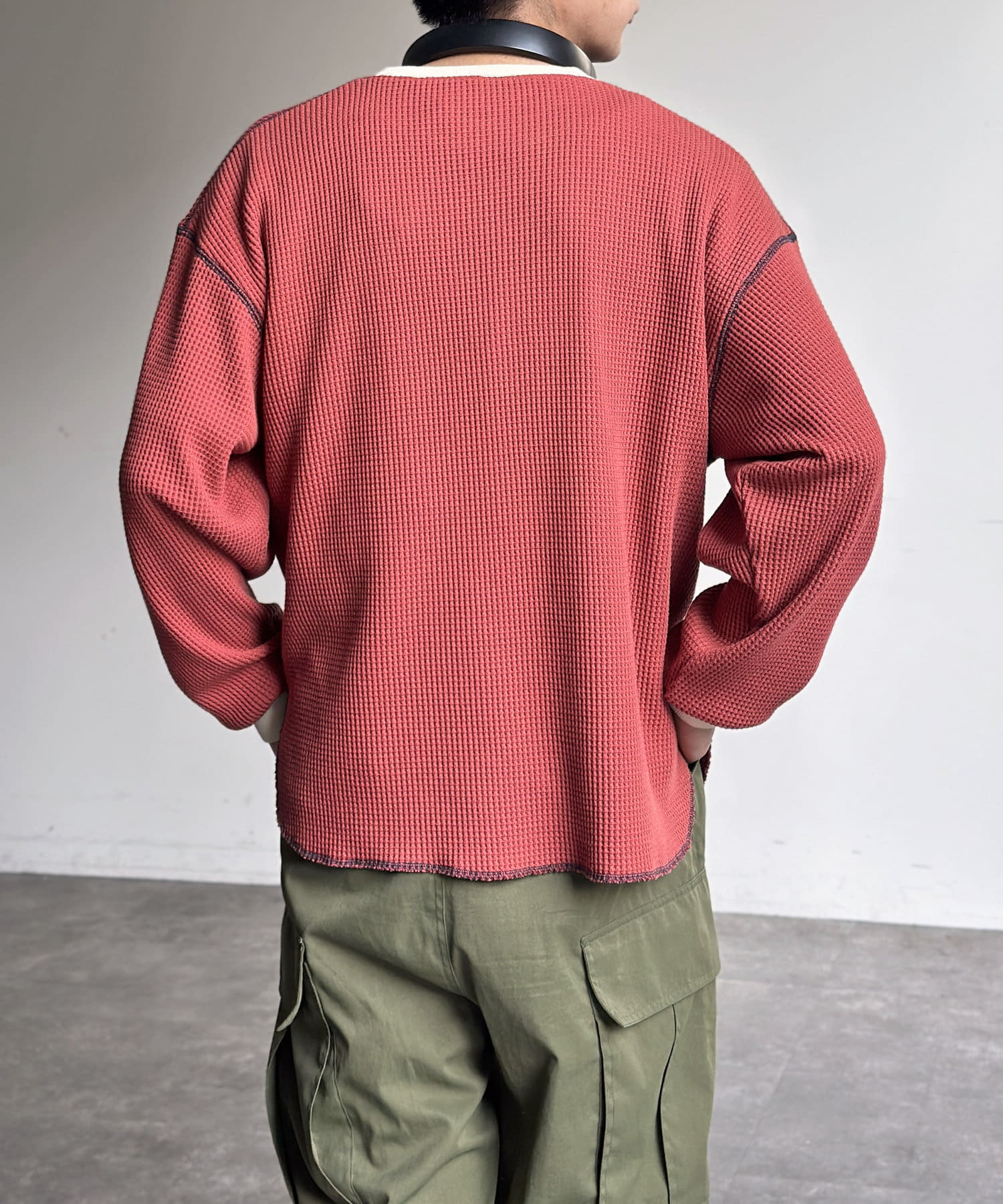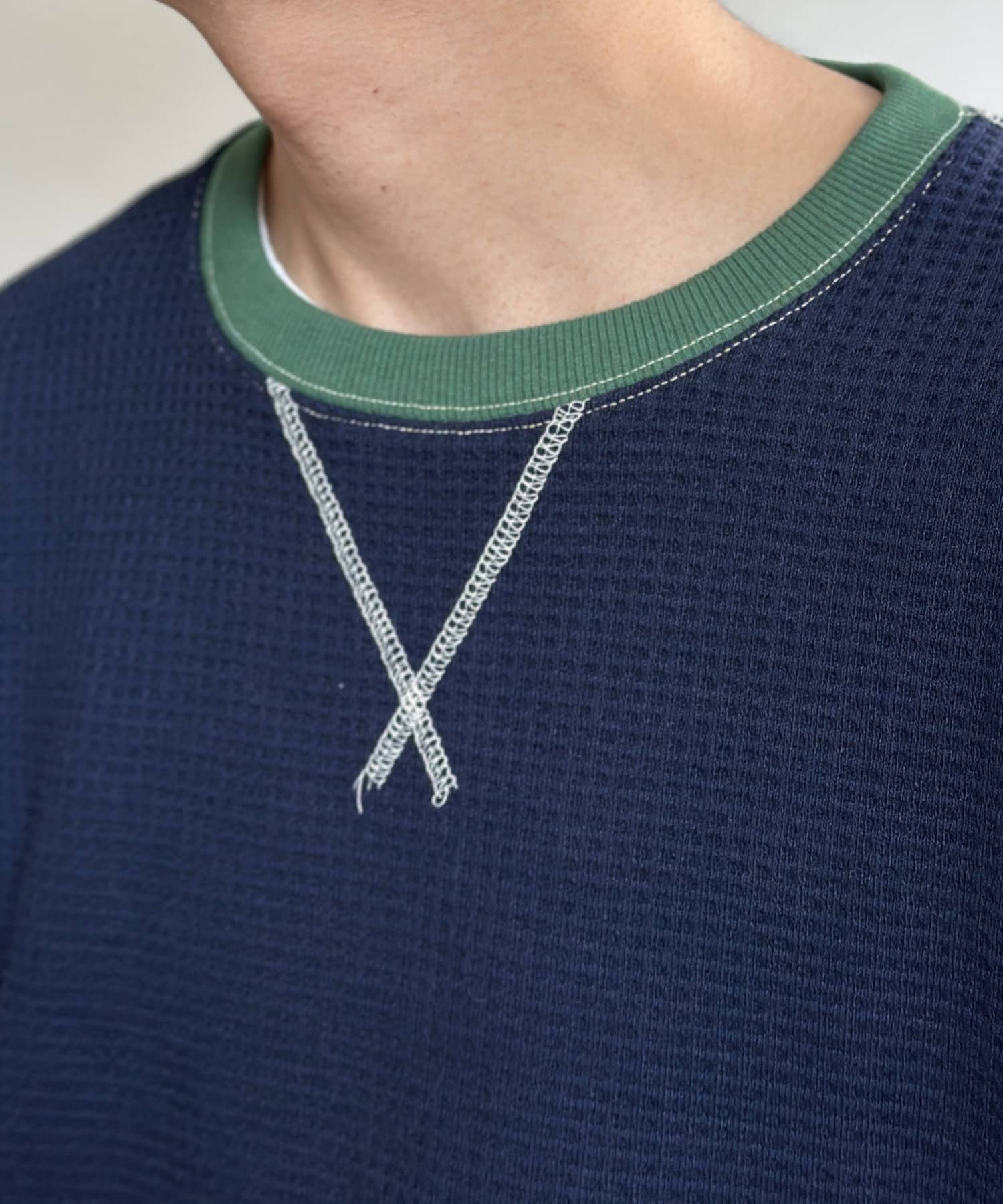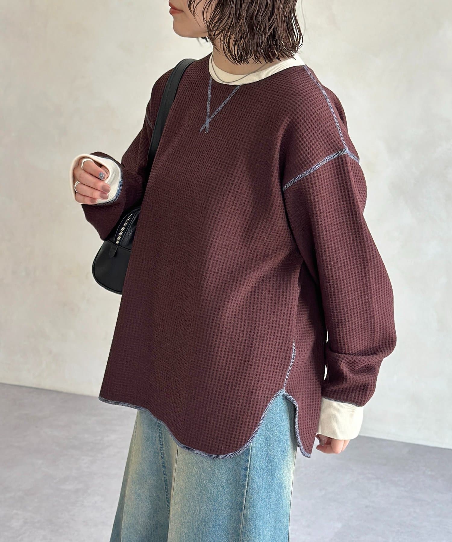 リブ配色ステッチワッフルプルオーバー