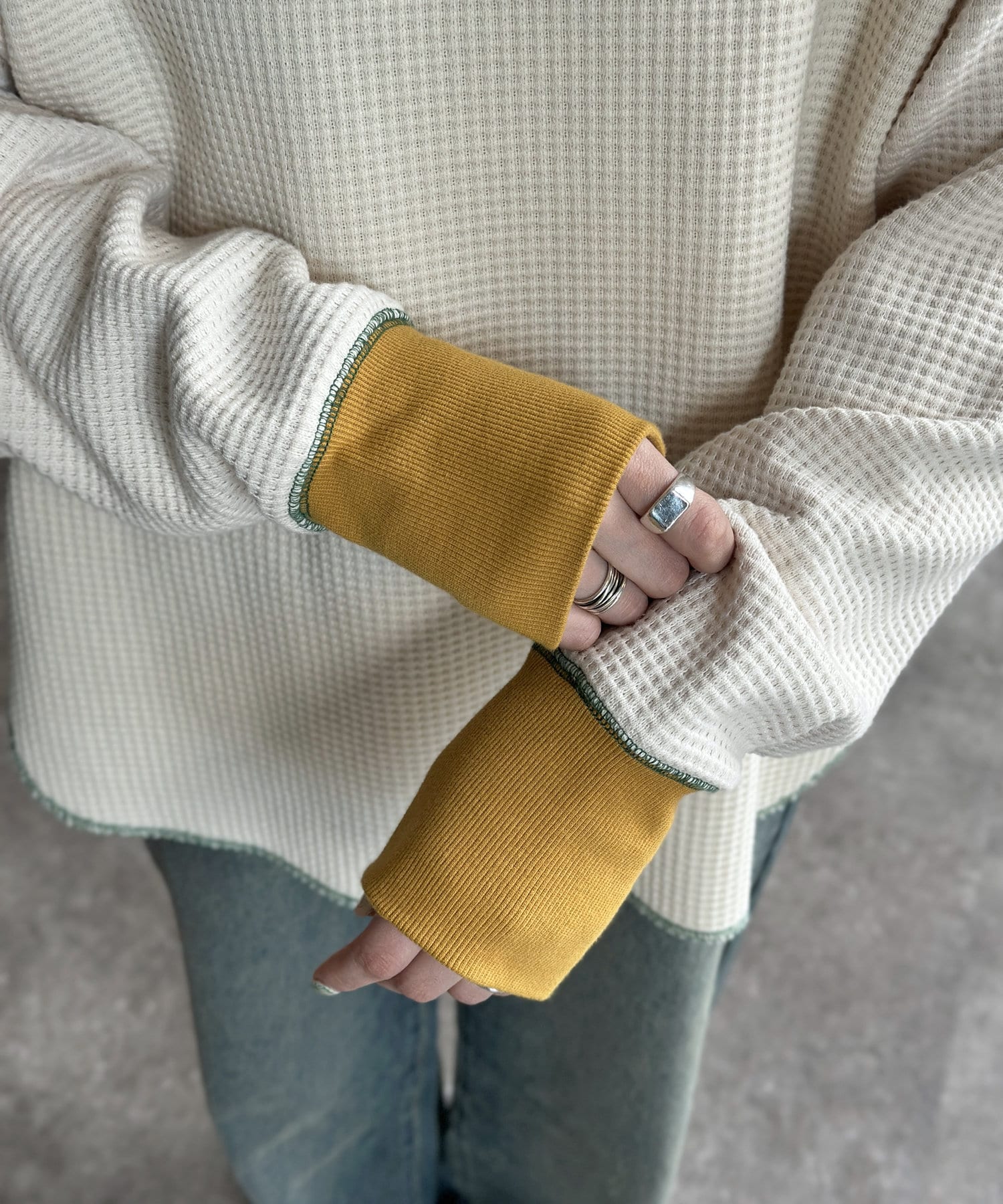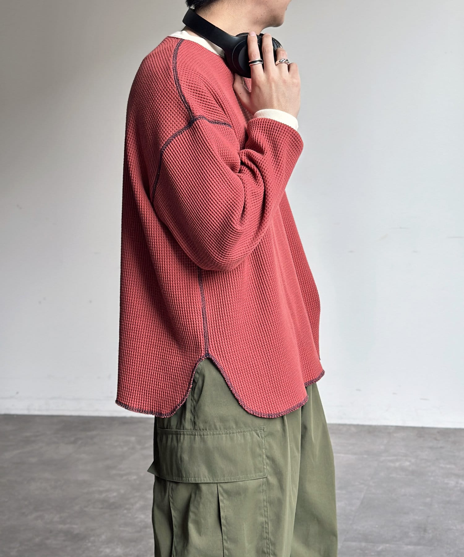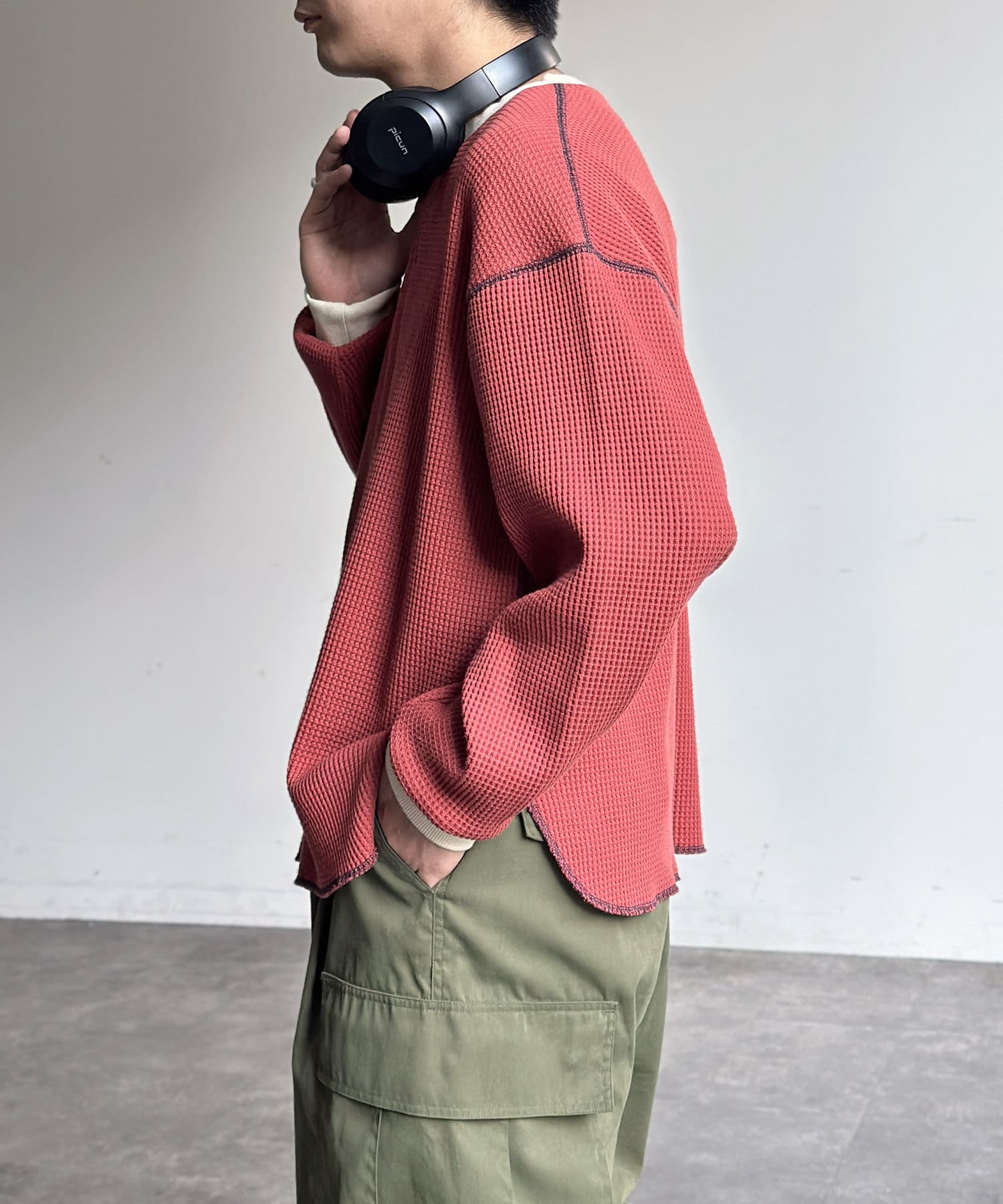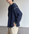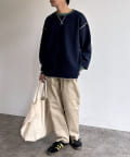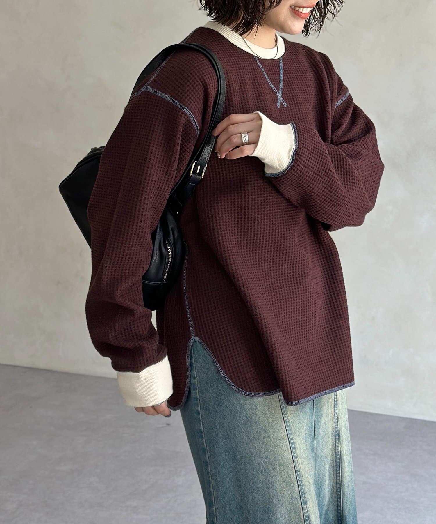 リブ配色ステッチワッフルプルオーバー