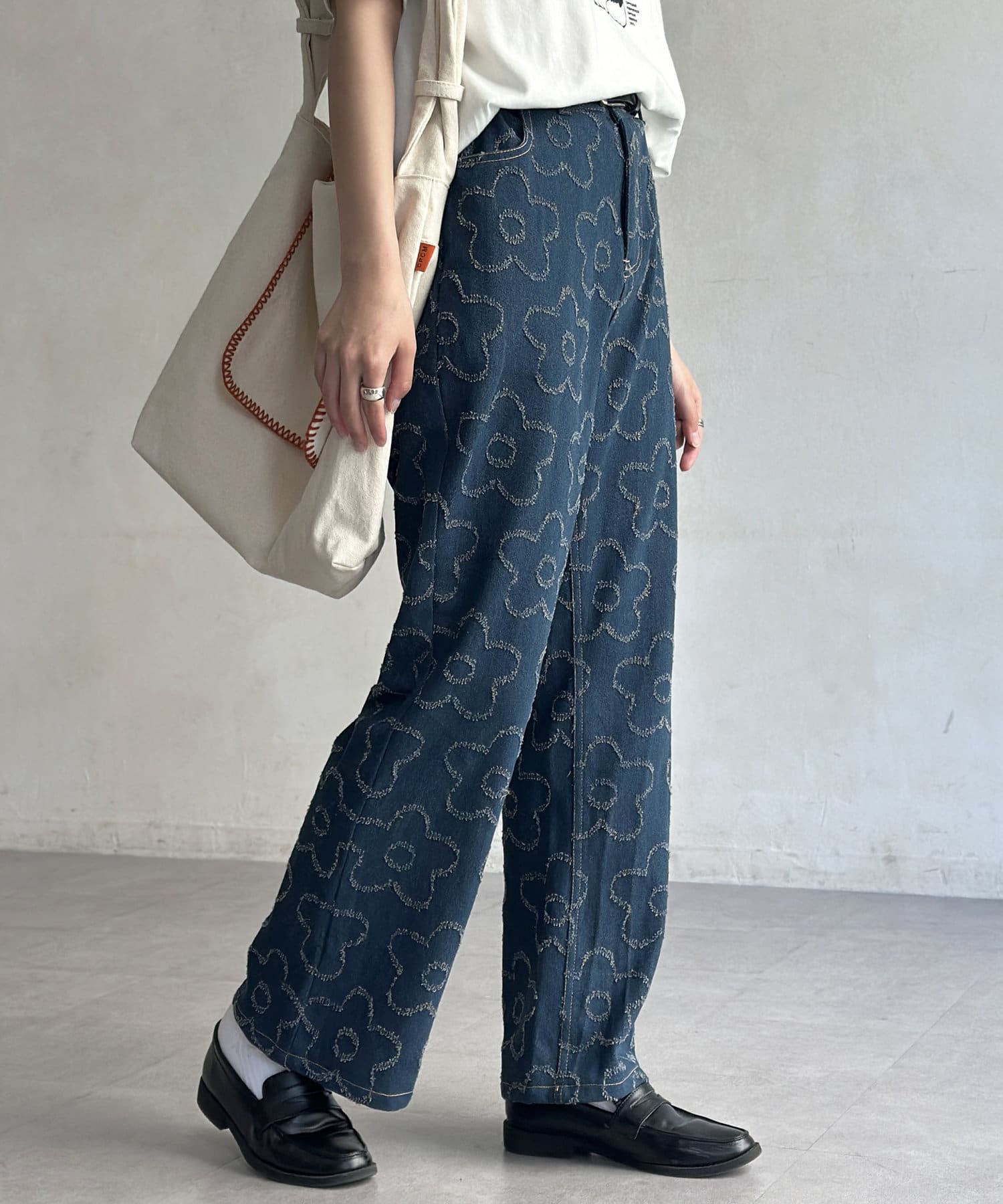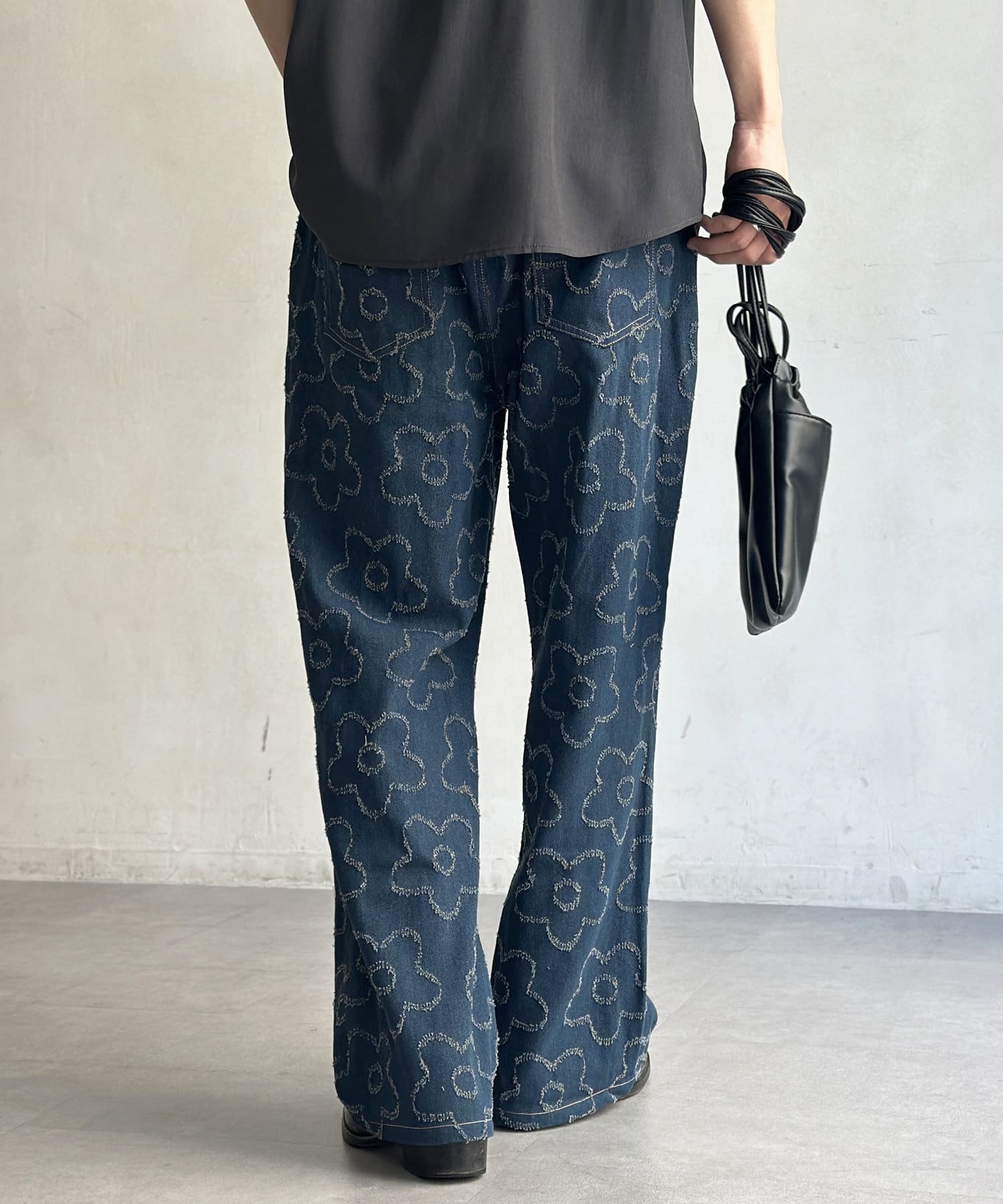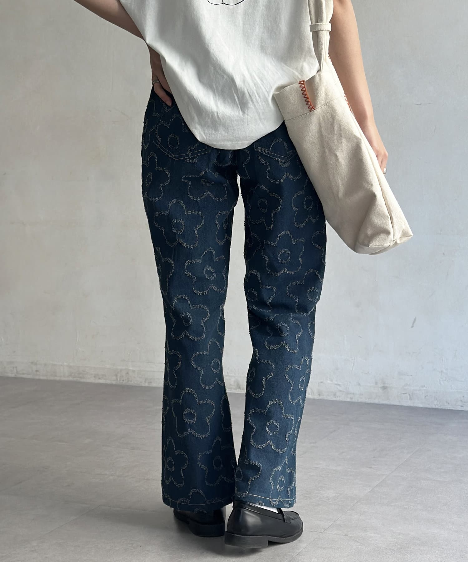 気分を上げる花柄刺繍のフレアデニムパンツ