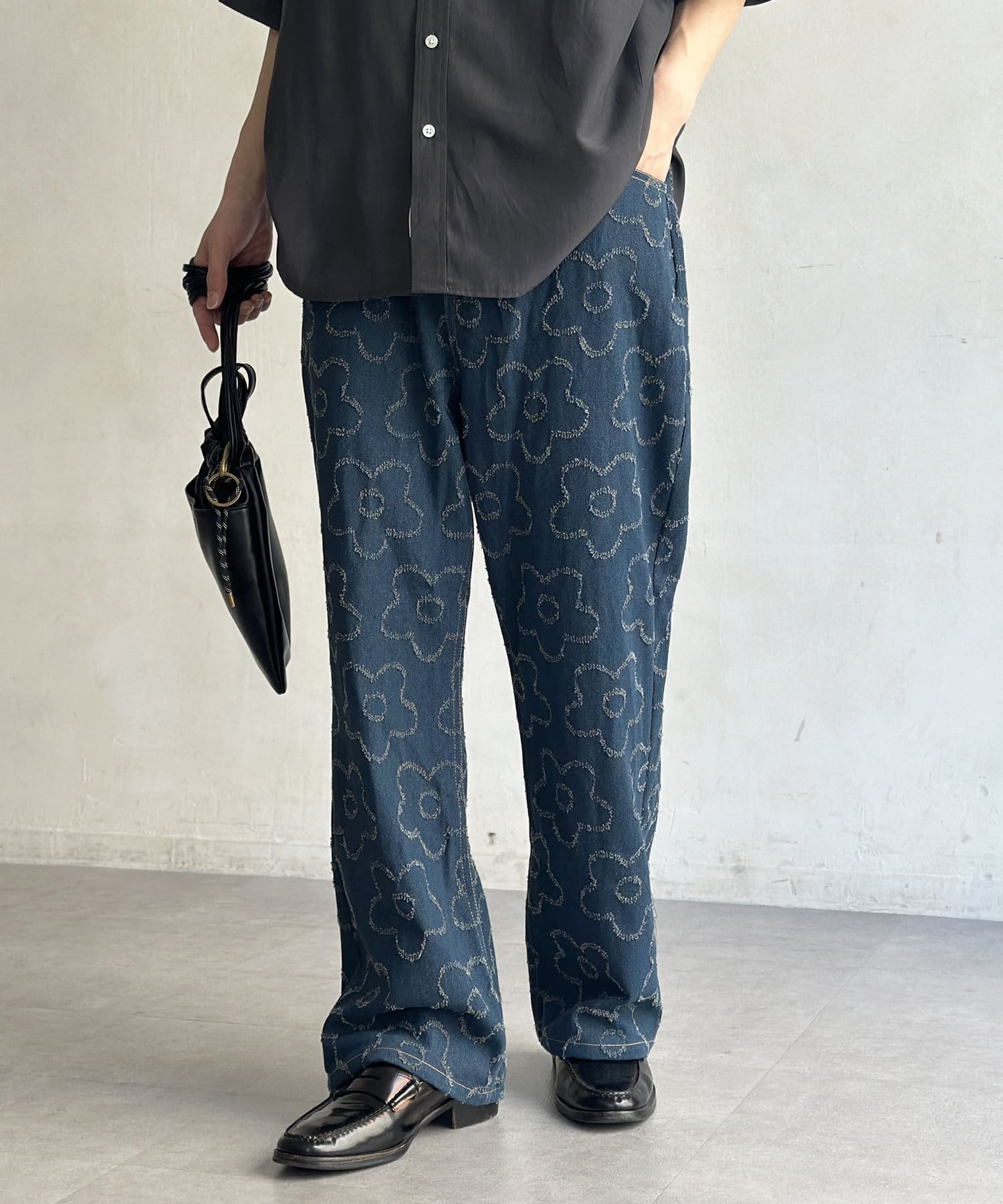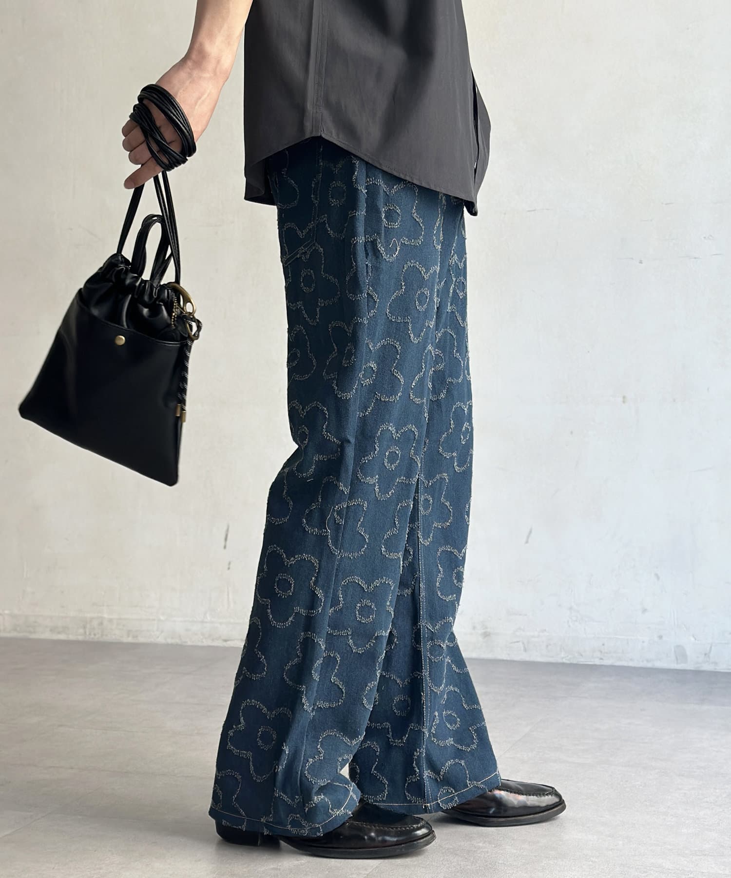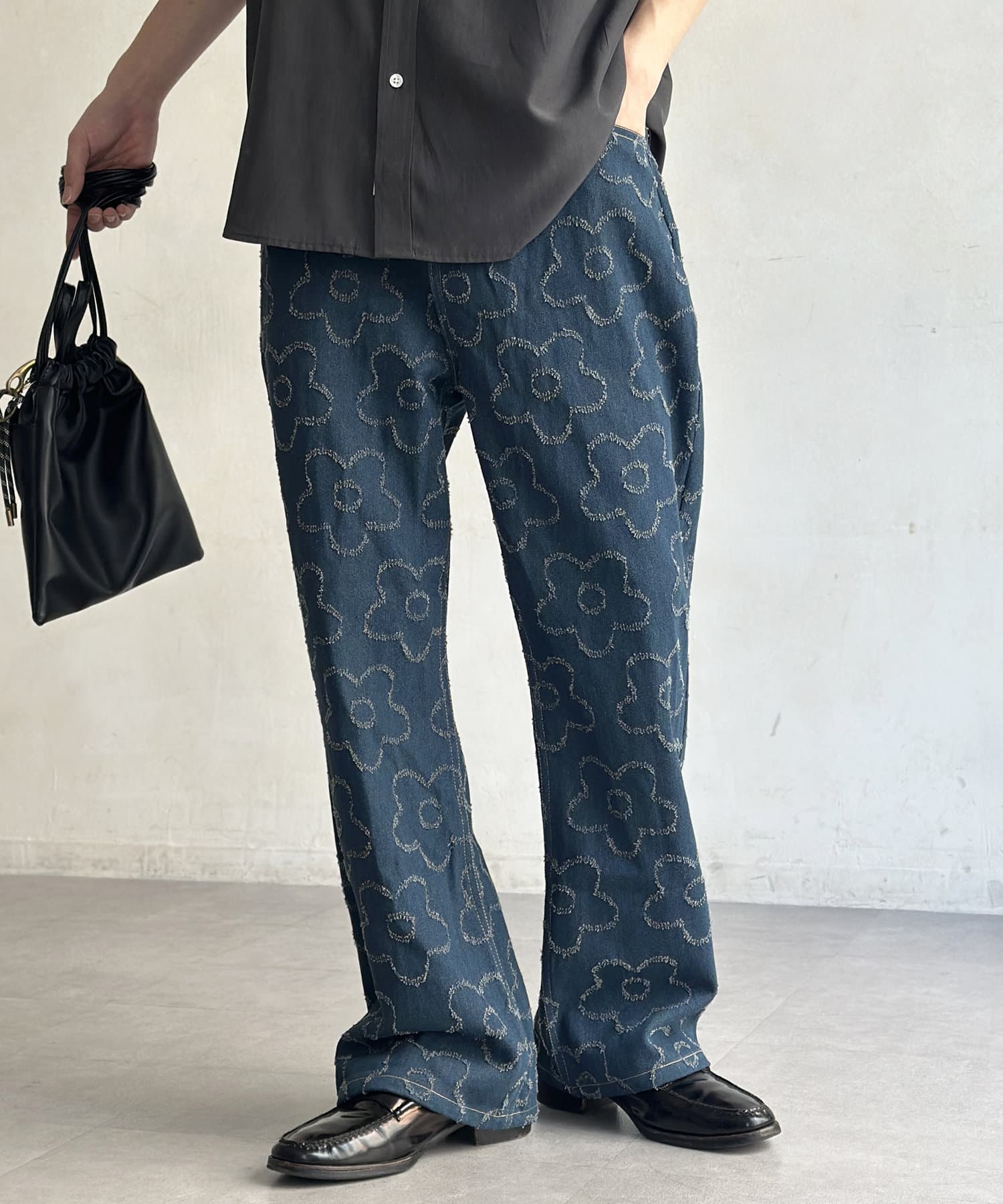 気分を上げる花柄刺繍のフレアデニムパンツ