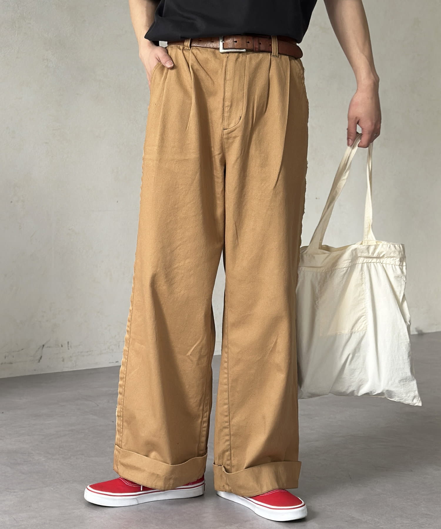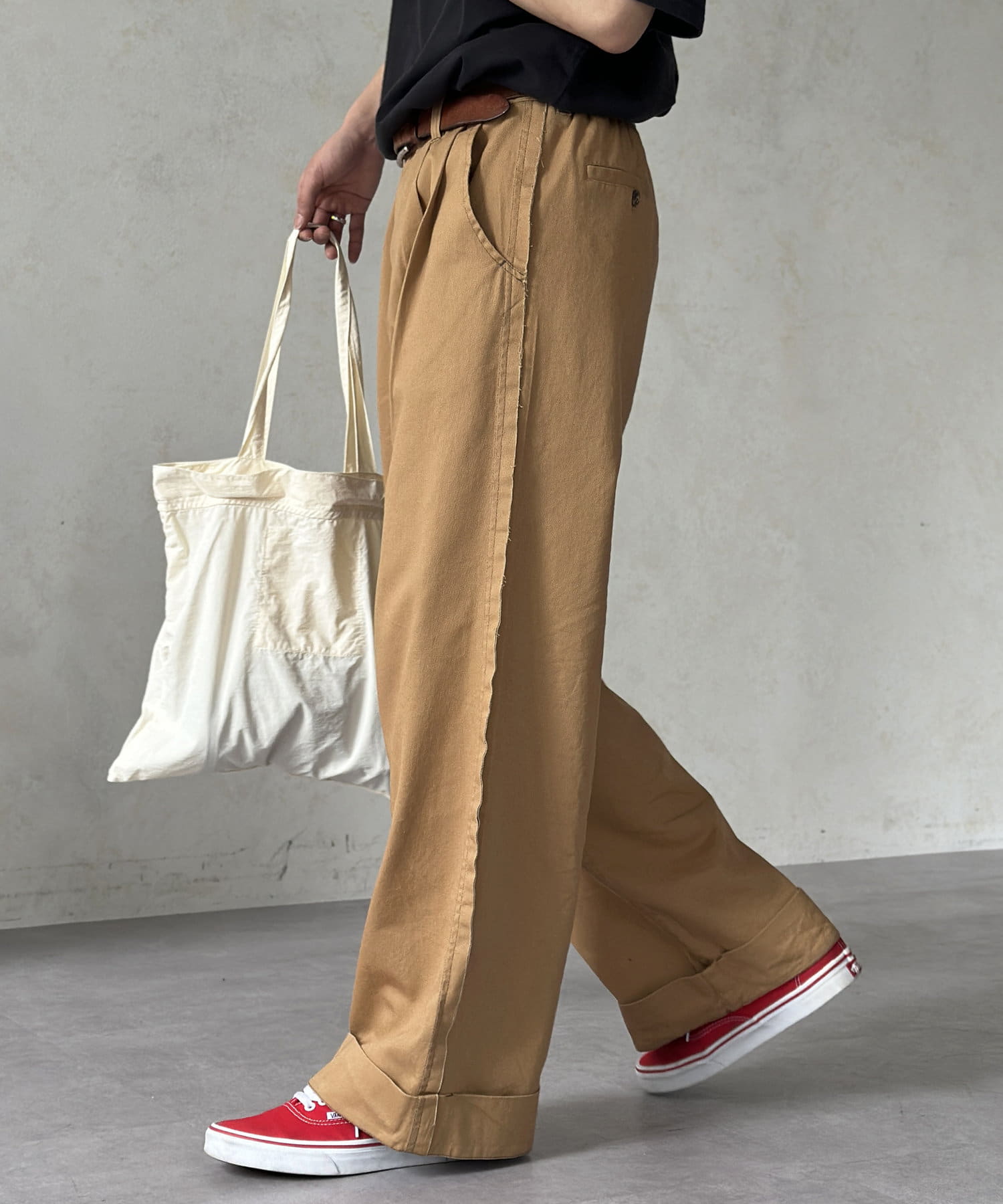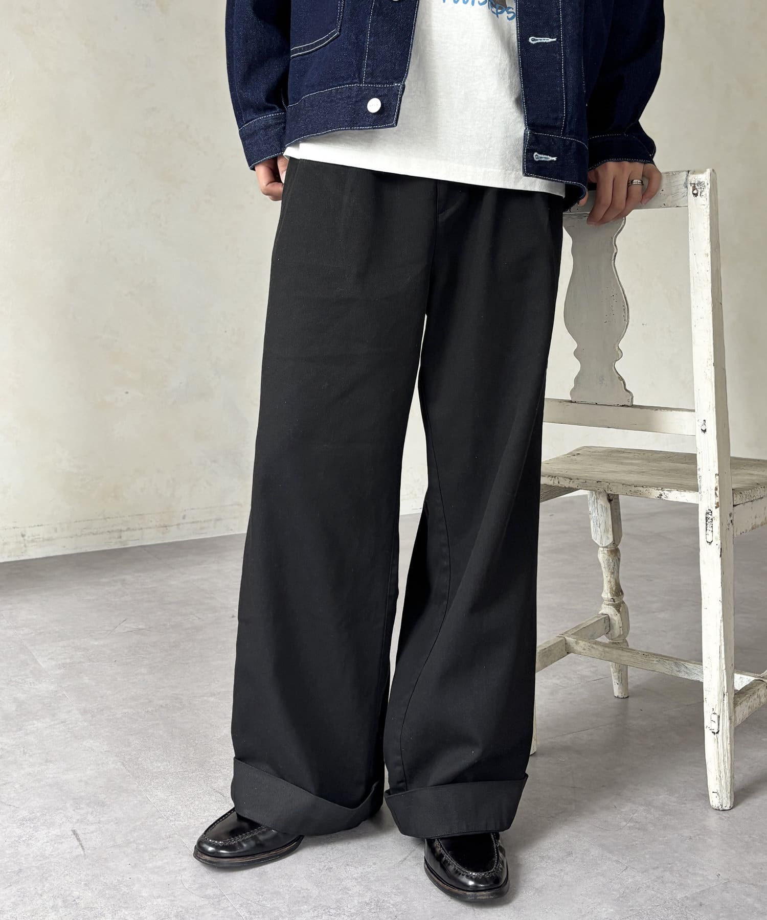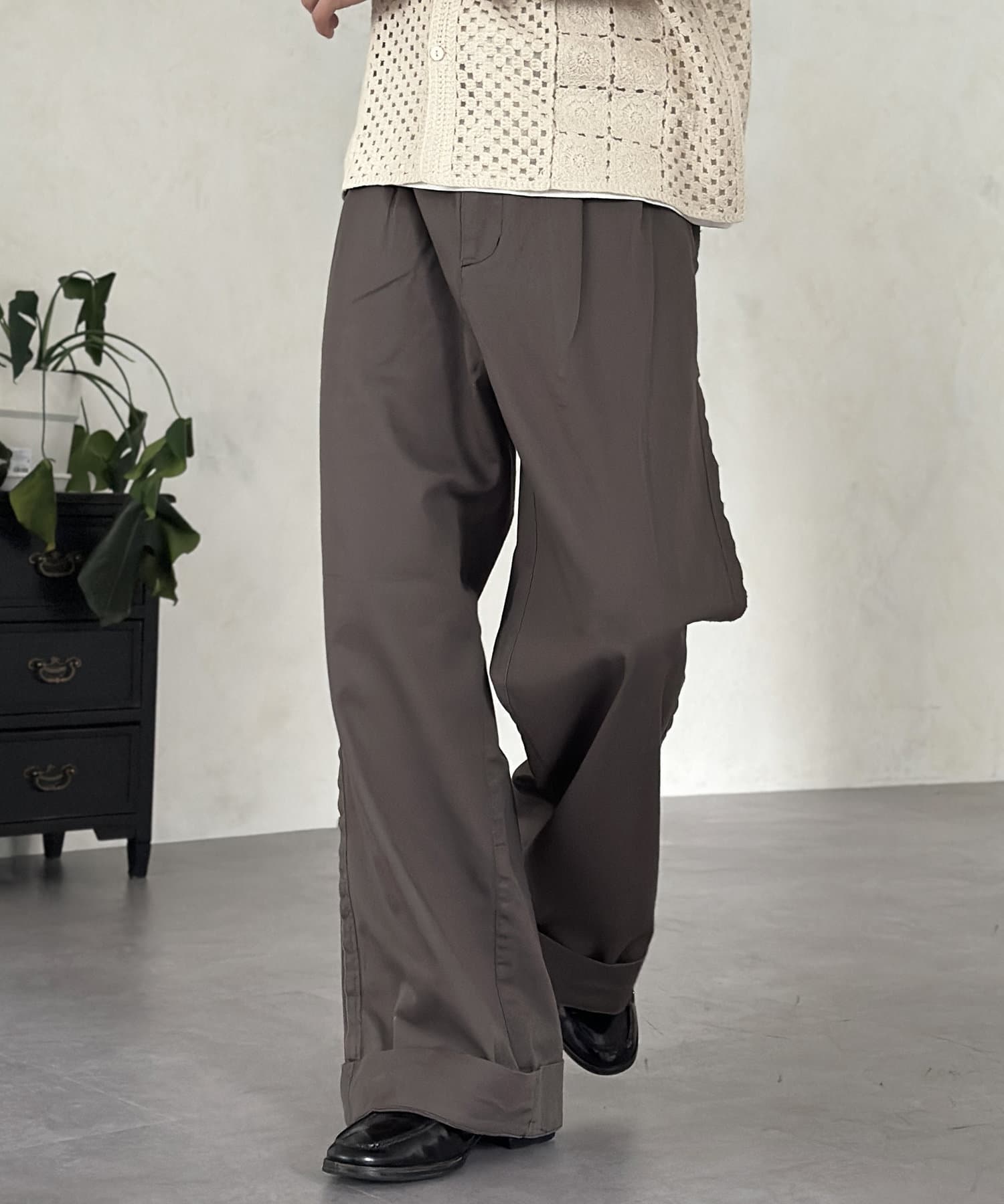 着回し力抜群!ロールアップが施された、美シルエットのワイドチノパンツ