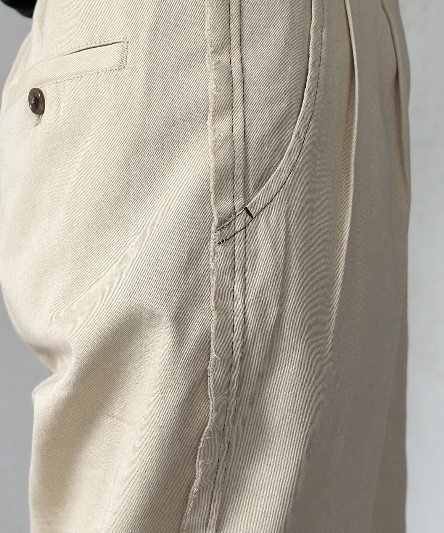 ・両サイドカットオフのデザイン仕様。着用~洗濯にて生地端ほつれる風合いを楽しめます。