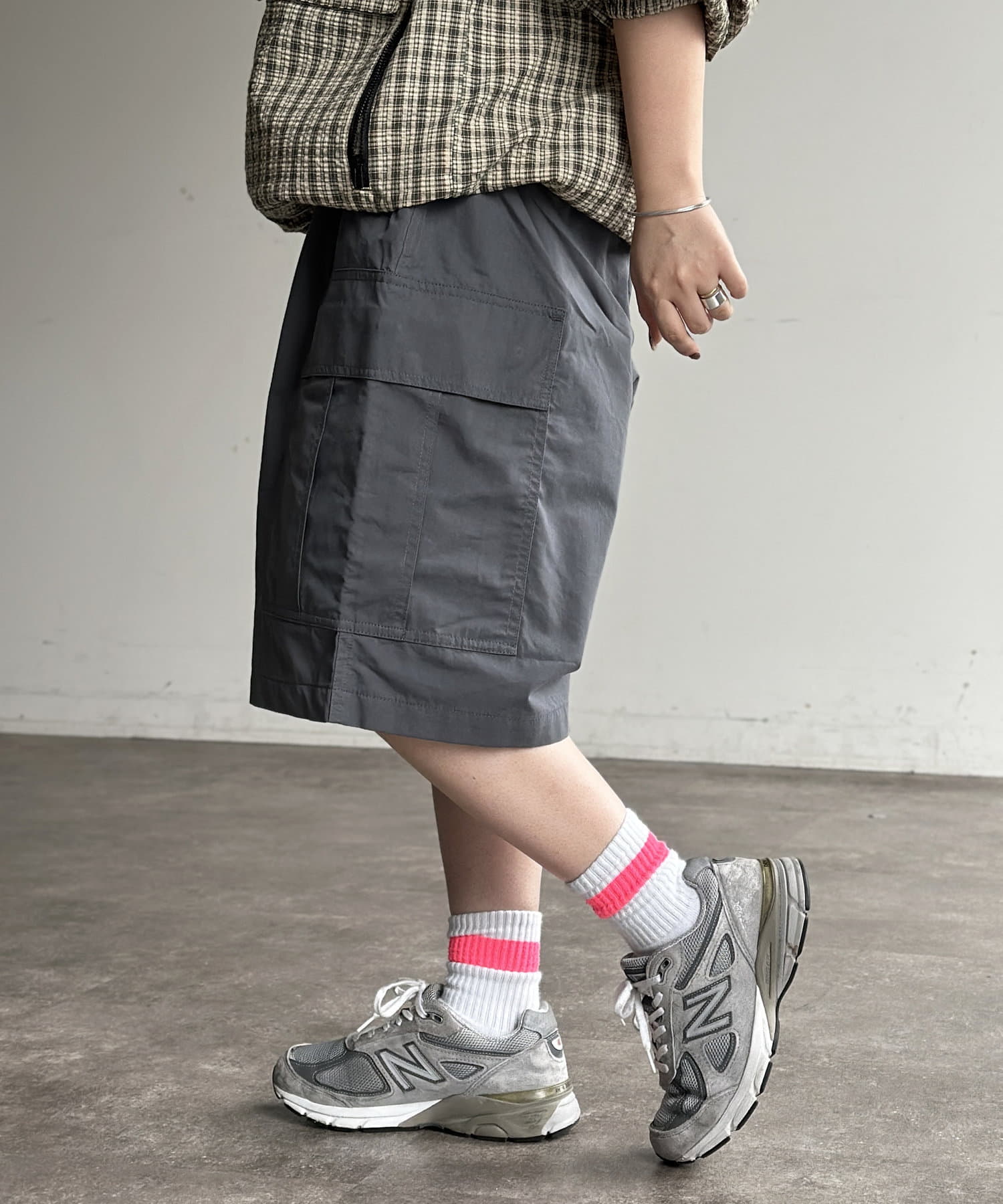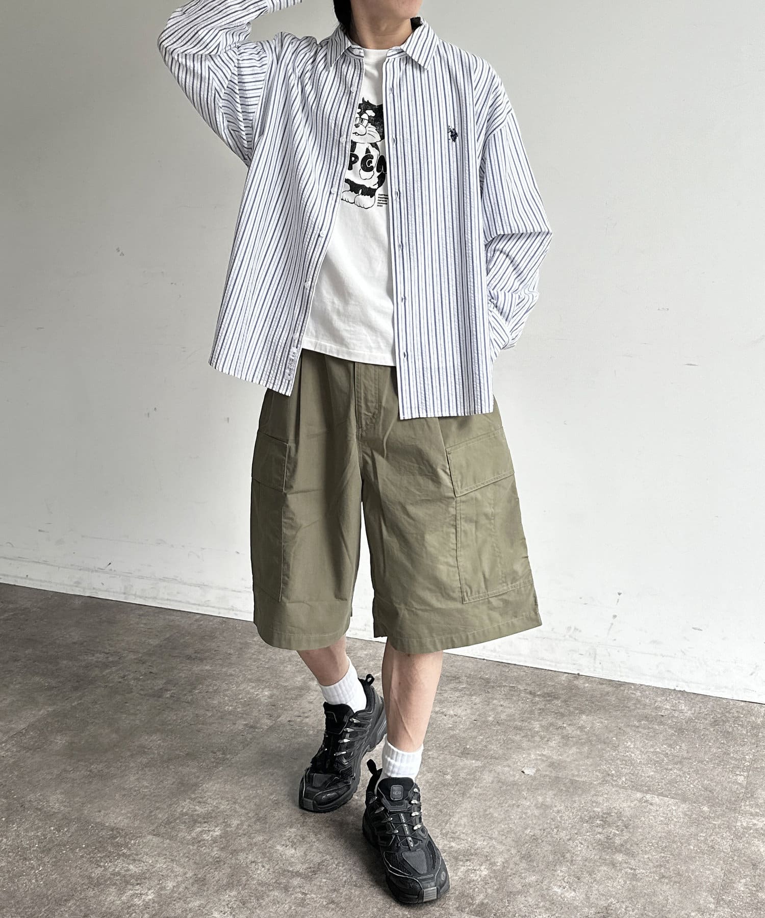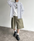 ・オーバーサイズのトップスと合わせ、リラックスしたカジュアルスタイル