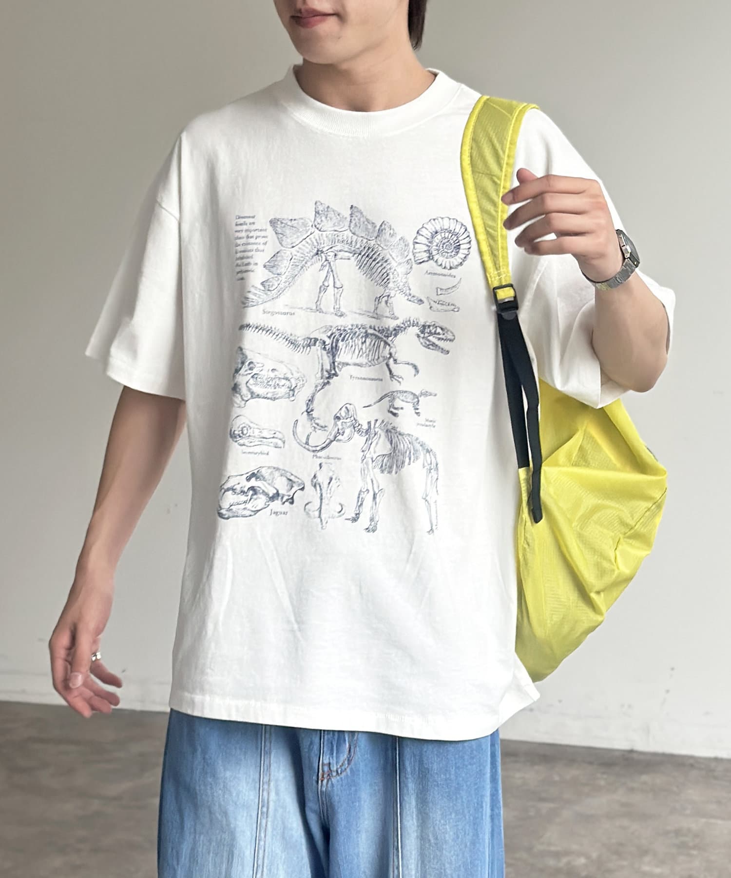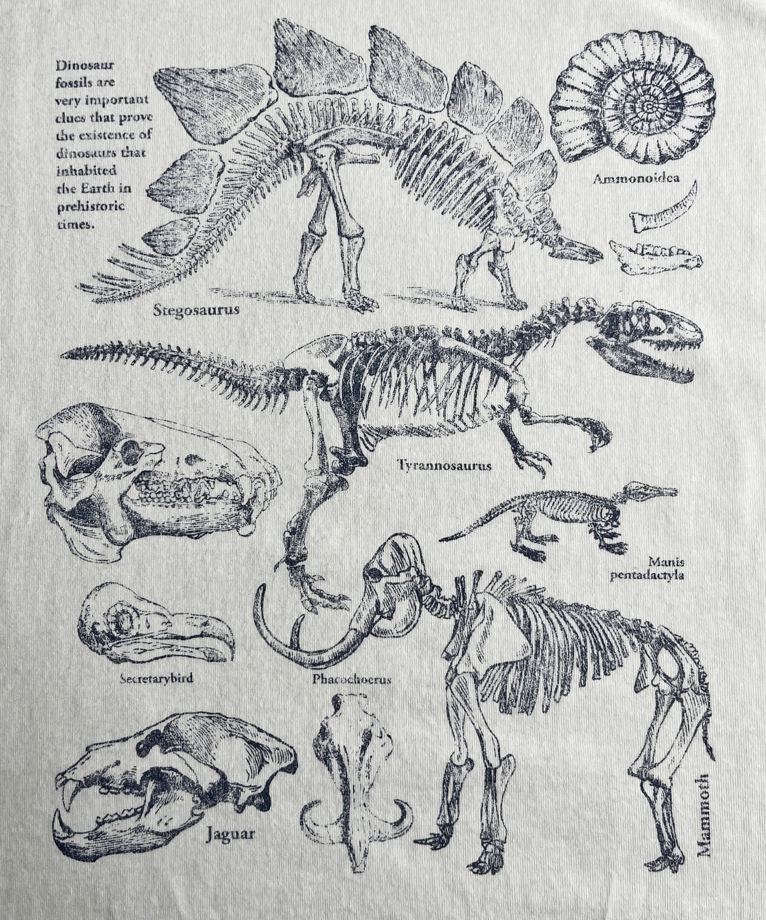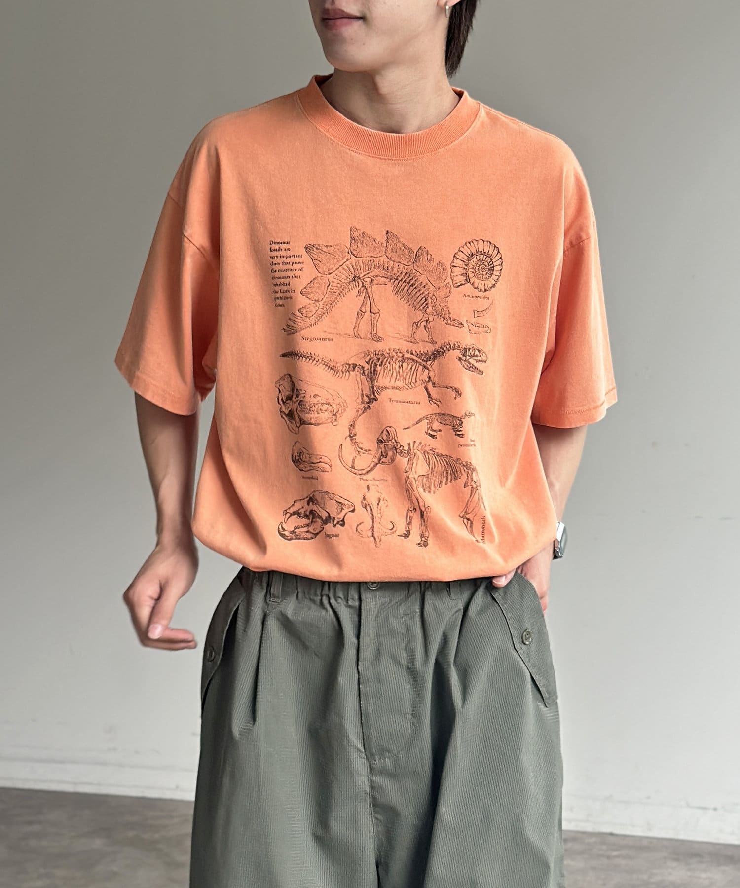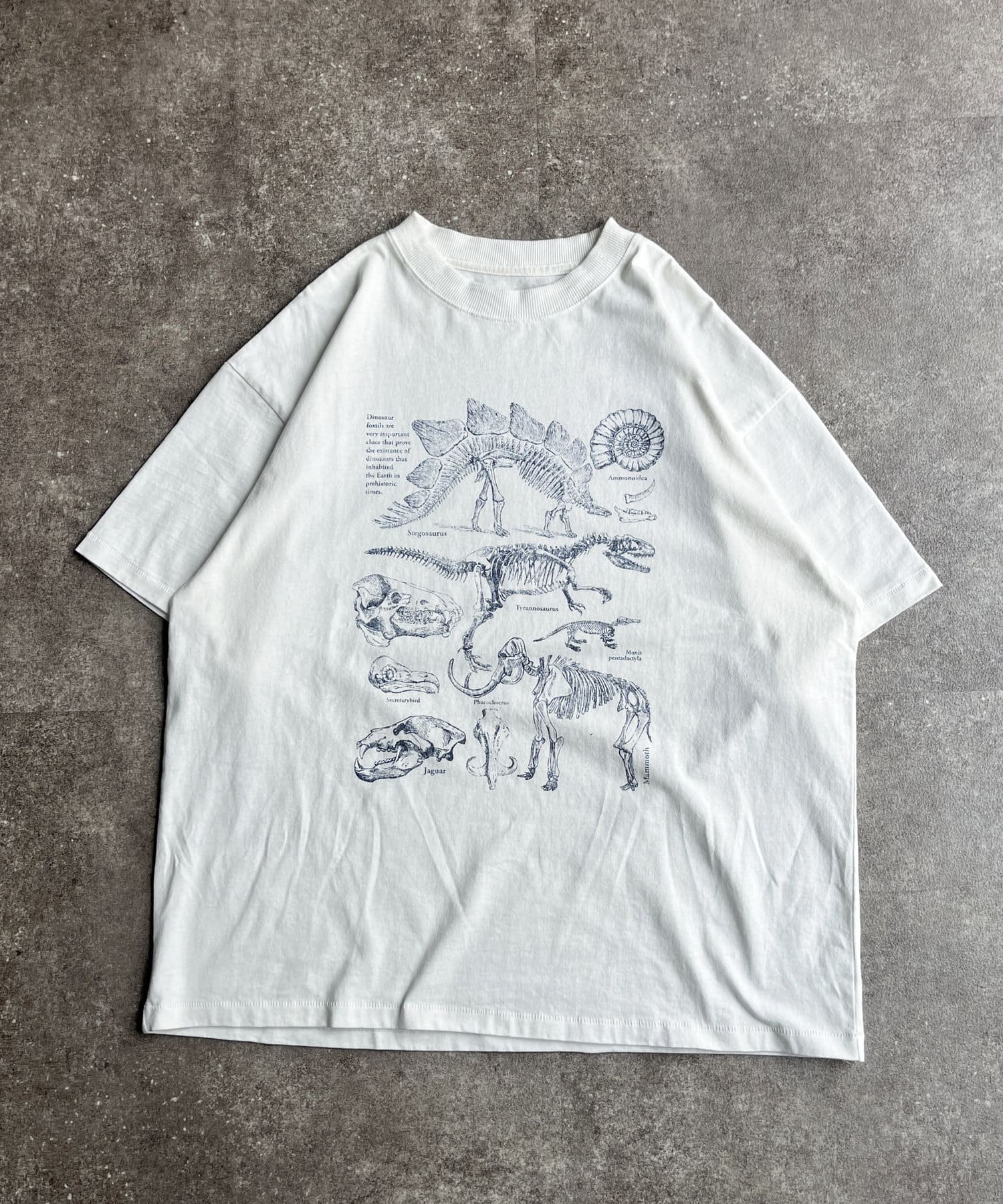 古代の化石模型がプリントされた、ヴィンテージライクなTシャツ