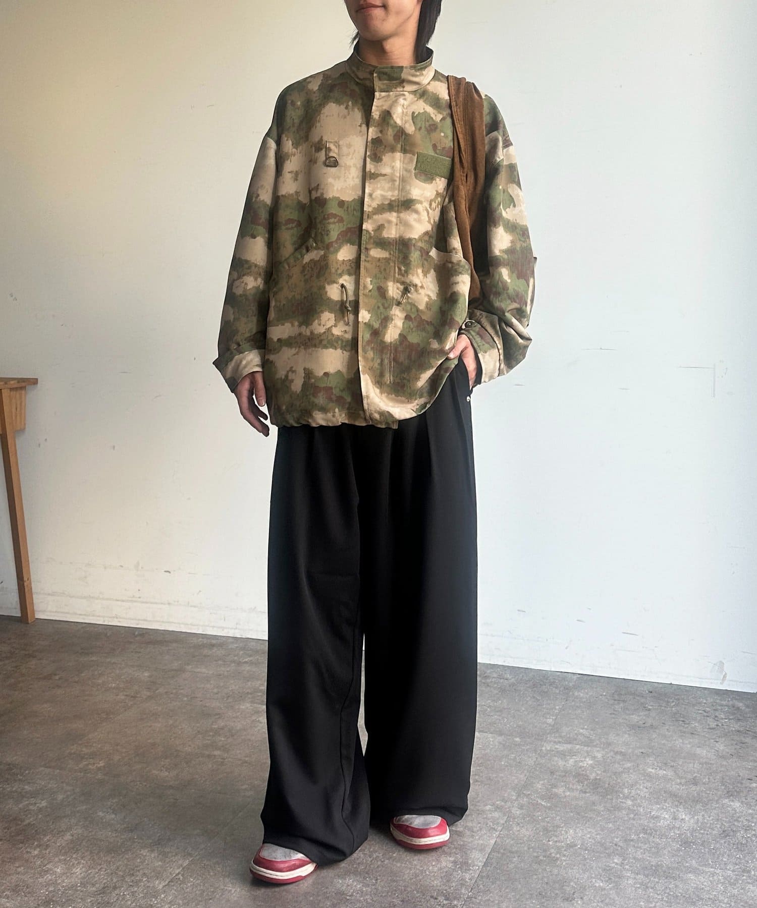 ・インナーにシンプルなTシャツを合わせ、ボトムスはワイドパンツでトレンド感のある着こなしに