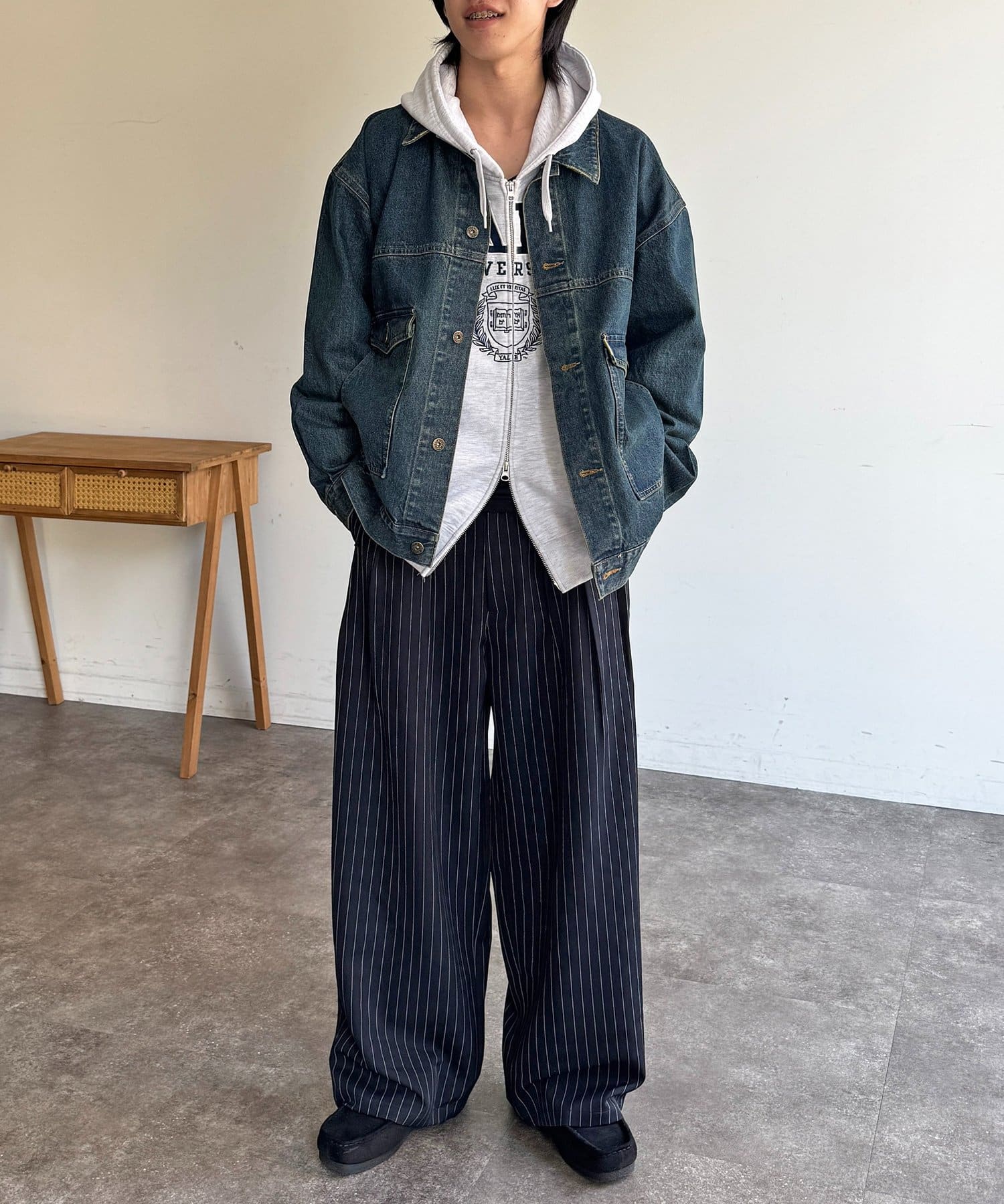 ・インナーにパーカーを合わせて、ストリートカジュアルな着こなしに。ボトムスはラインパンツでトレンド感をプラス。