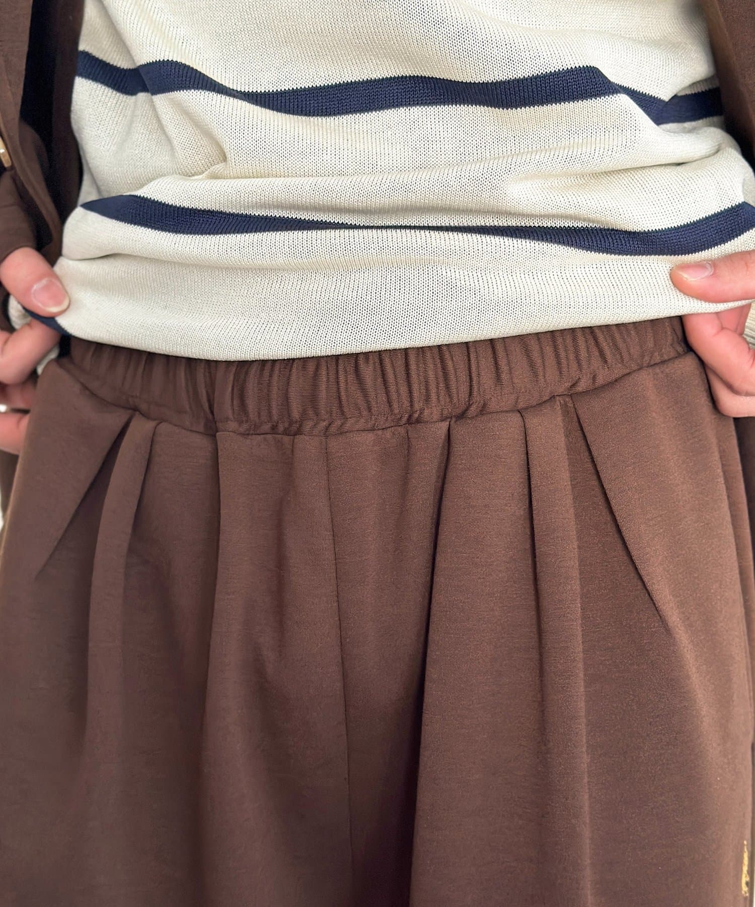 ポンチ素材ならではの、滑らかでハリのある生地感が上品な印象を与えます。
