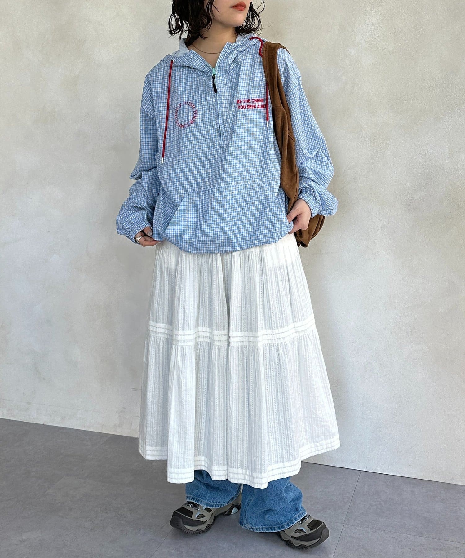 ・白のスカートと合わせて、大人可愛いカジュアルスタイルに