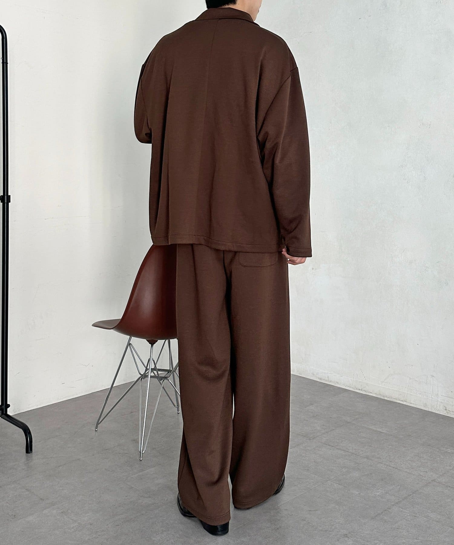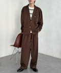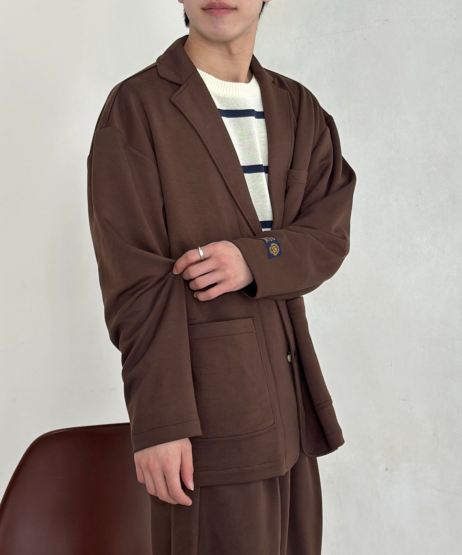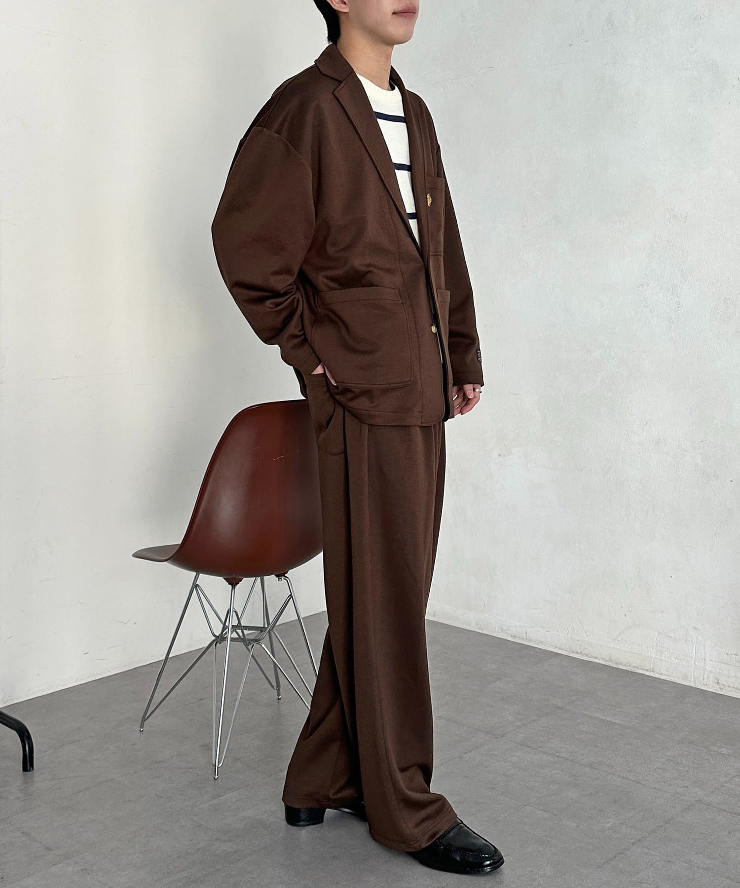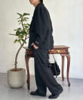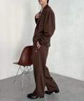 ・同素材のパンツと合わせたセットアップスタイル。インナーにボーダー柄のニットを合わせれば、品のある大人カジュアルが完成します。