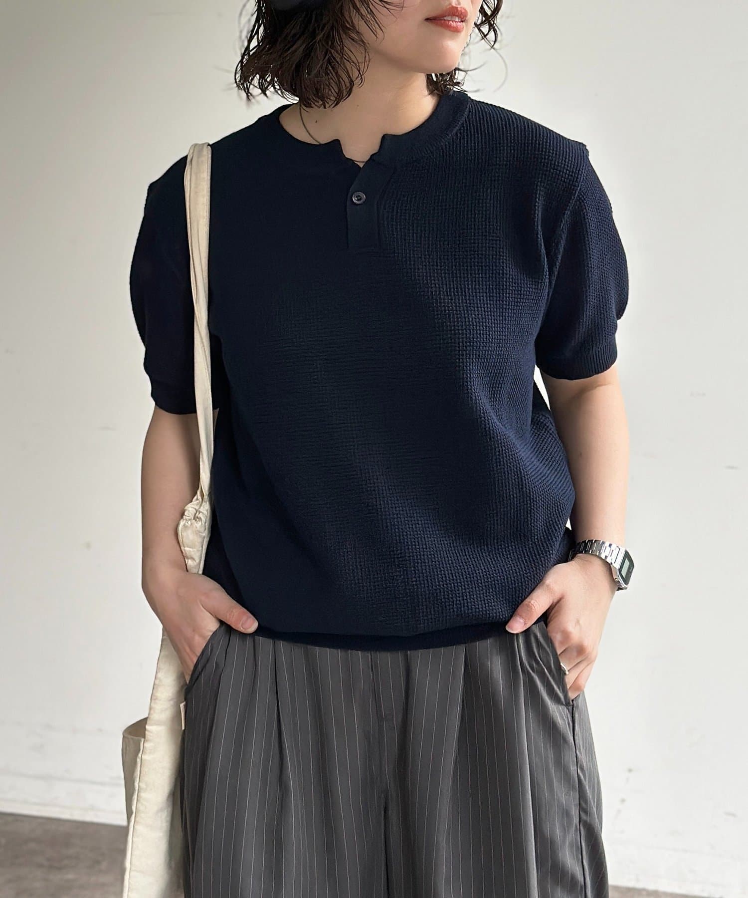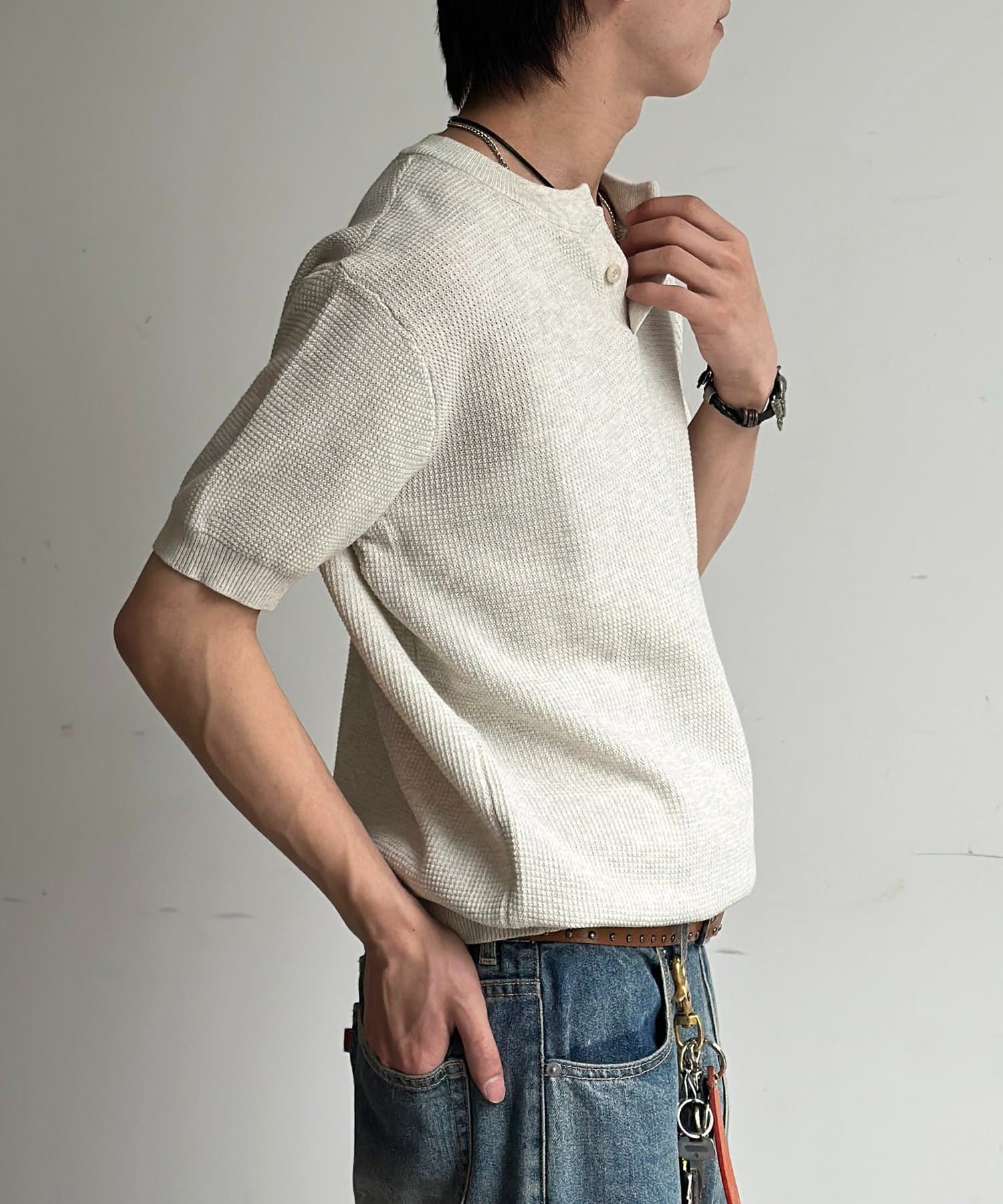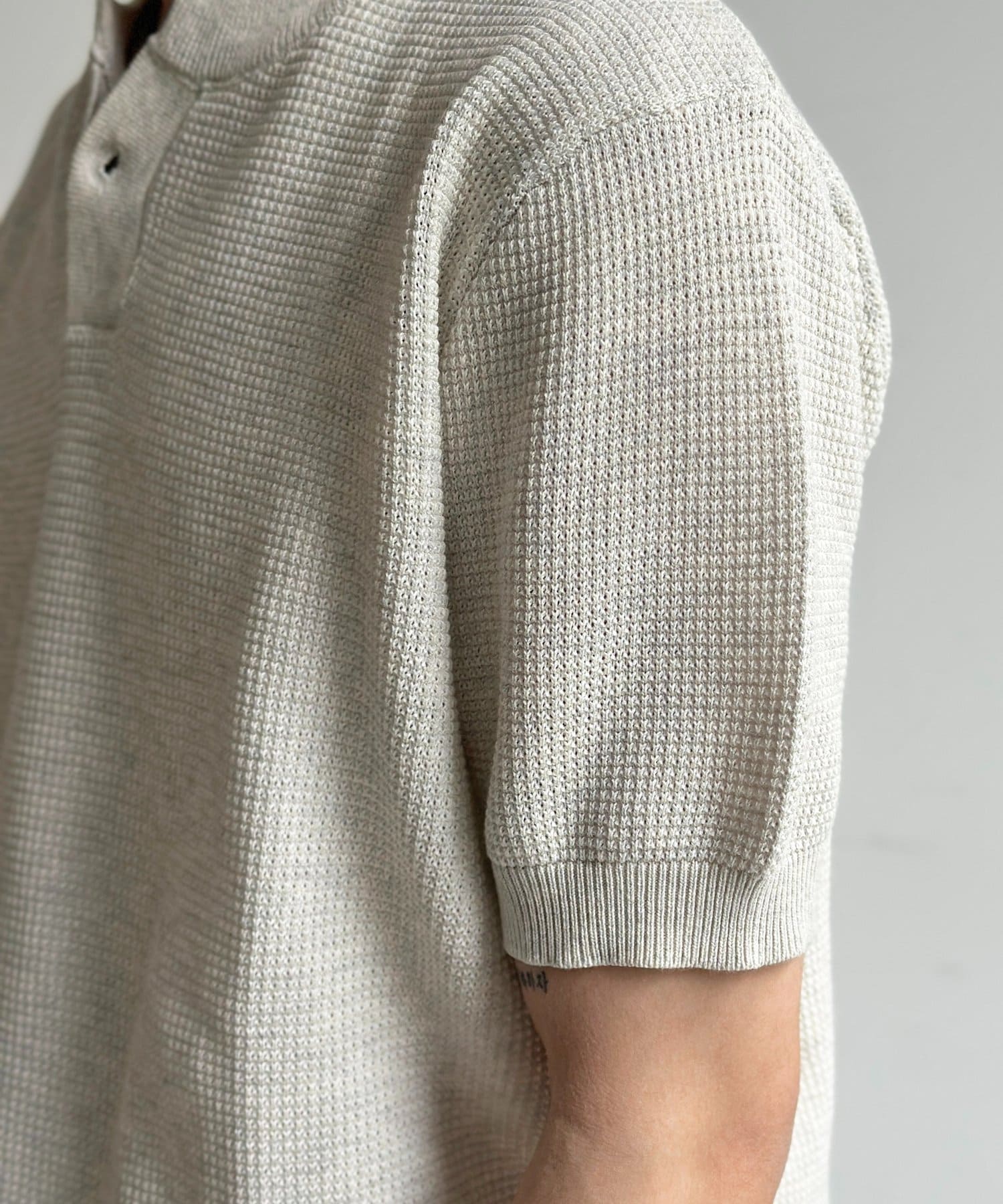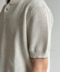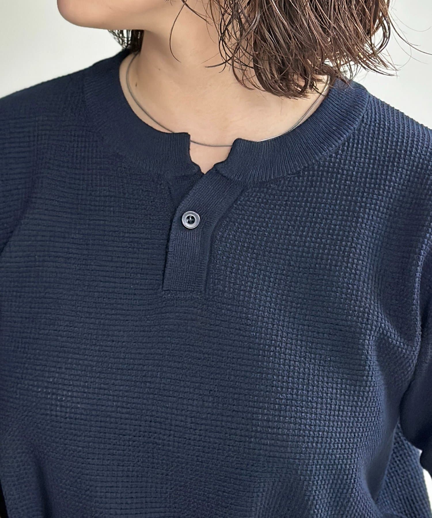豊かな表情を見せるワッフル調の編地が、シンプルな着こなしに奥行きをプラスします。