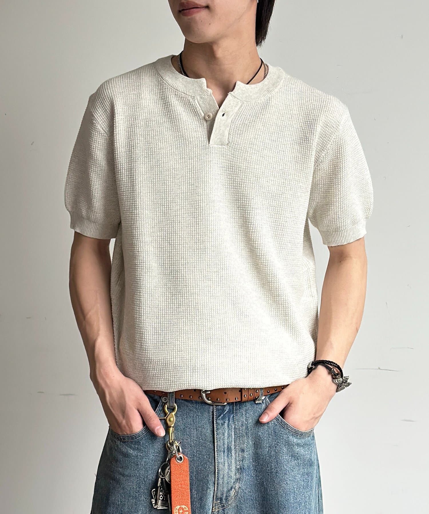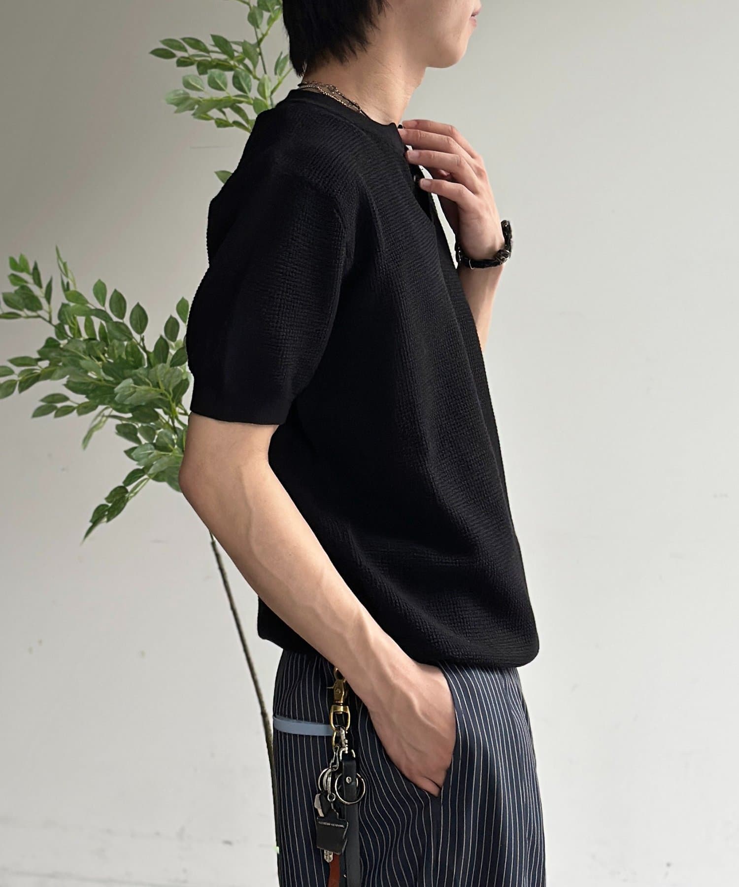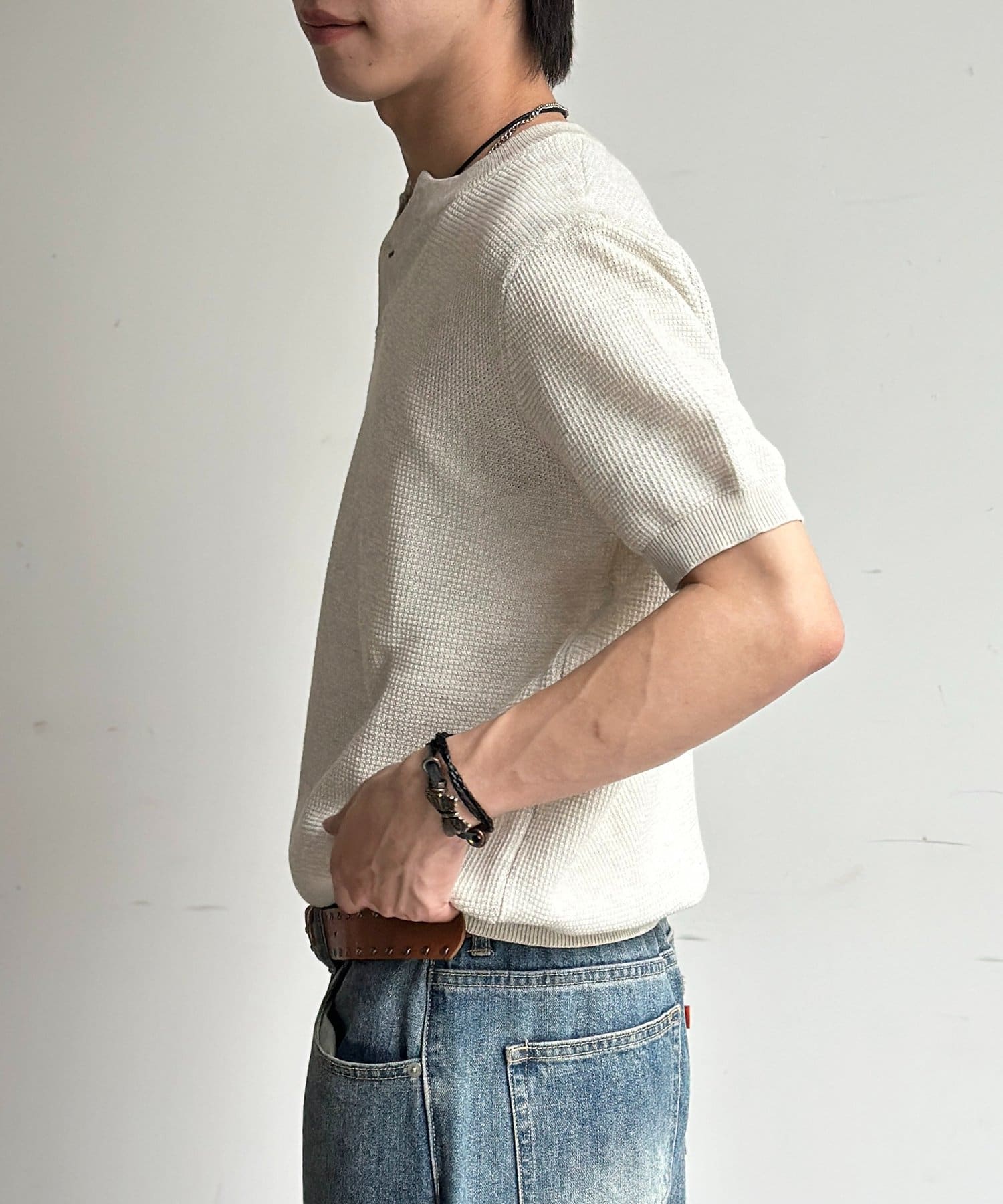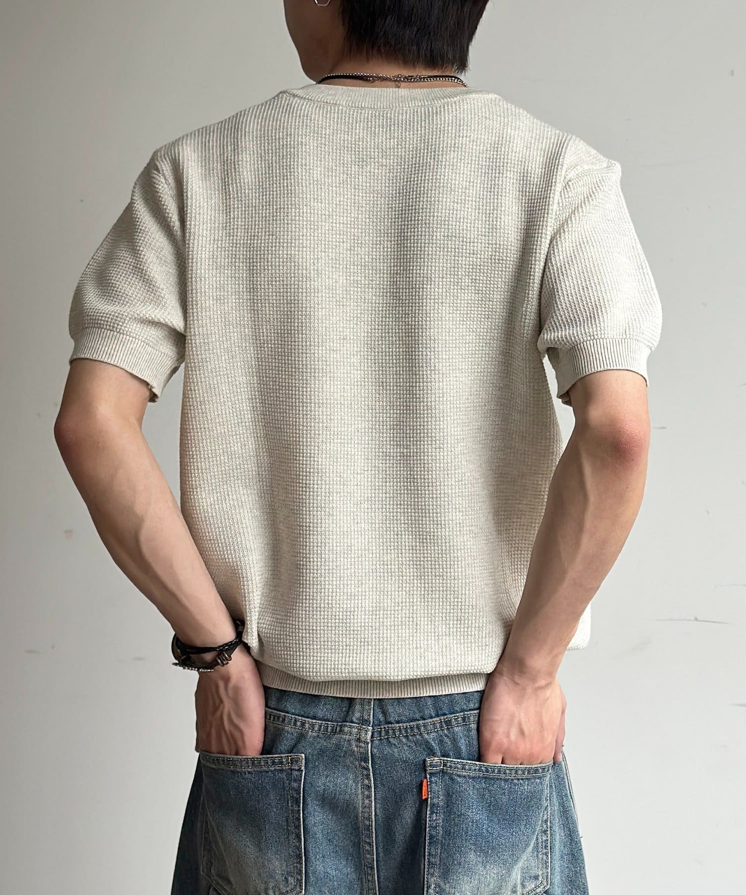 豊かな表情を見せるワッフル調の編地が、シンプルな着こなしに奥行きをプラスします。