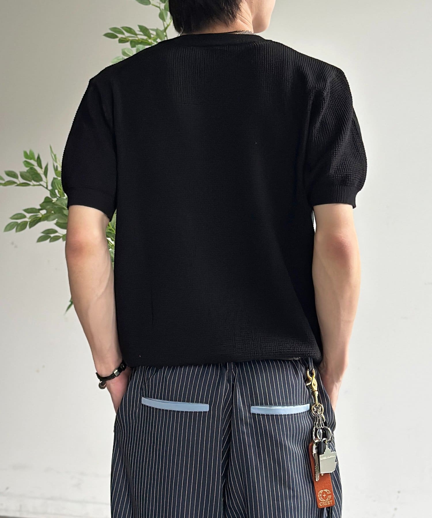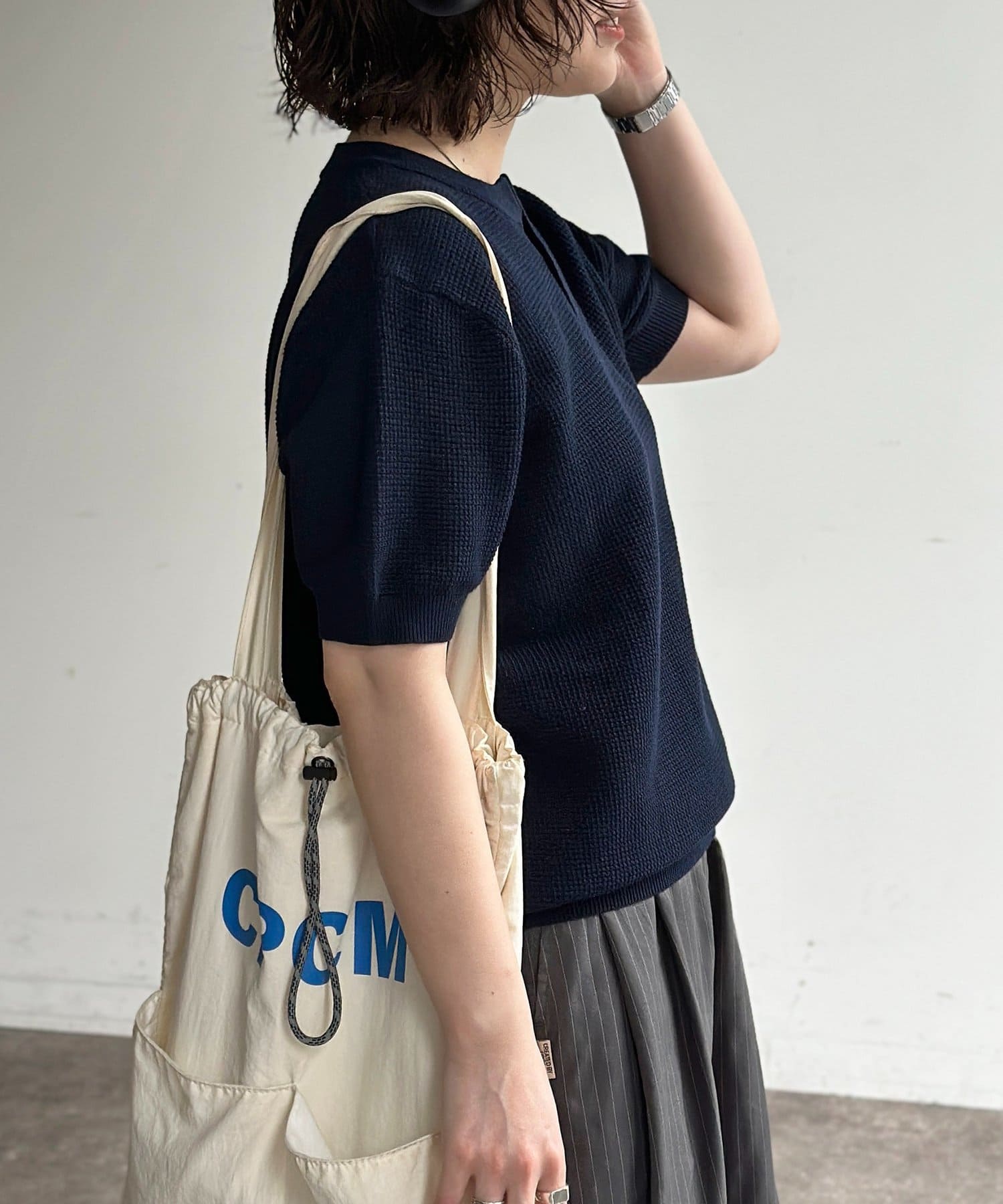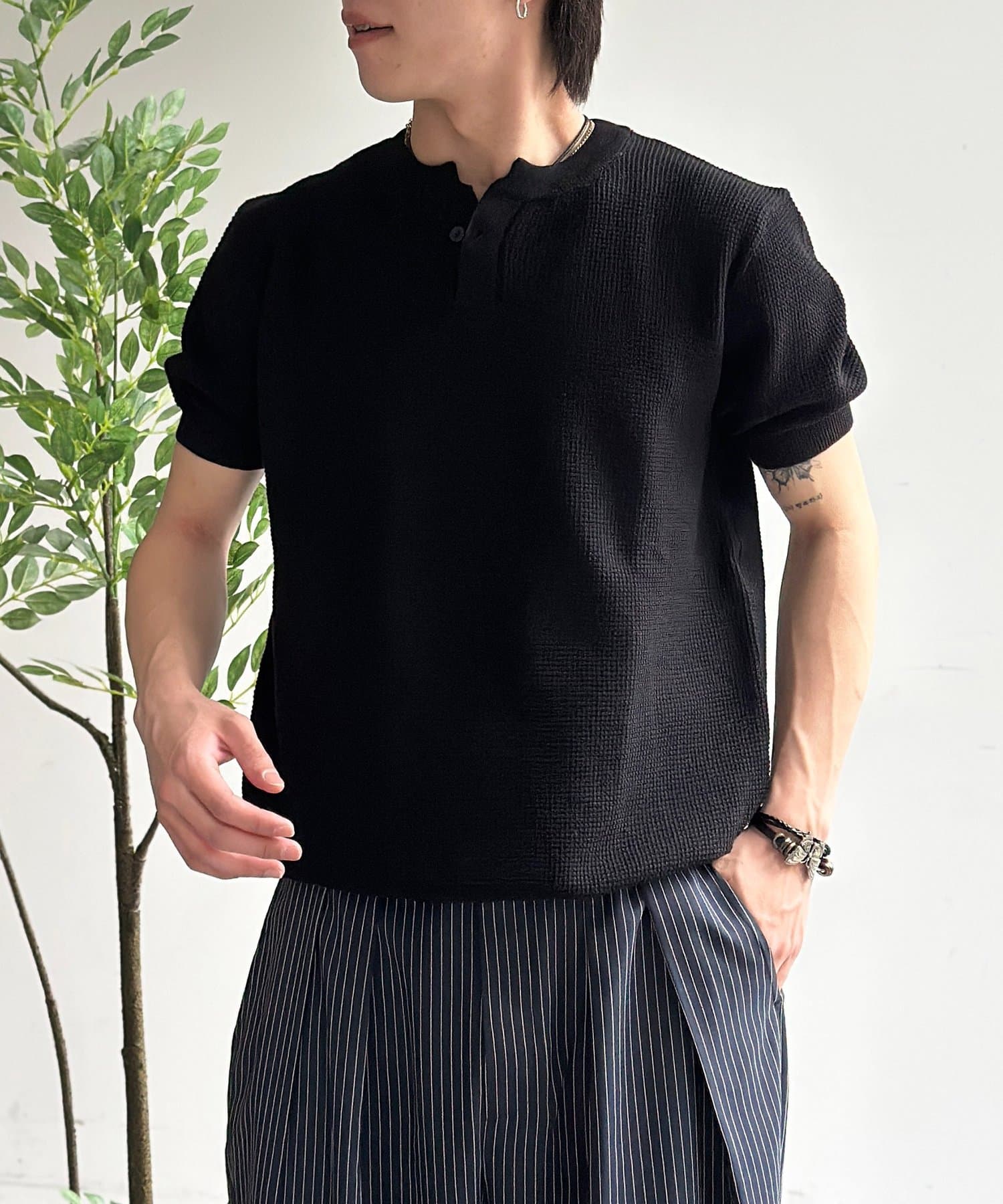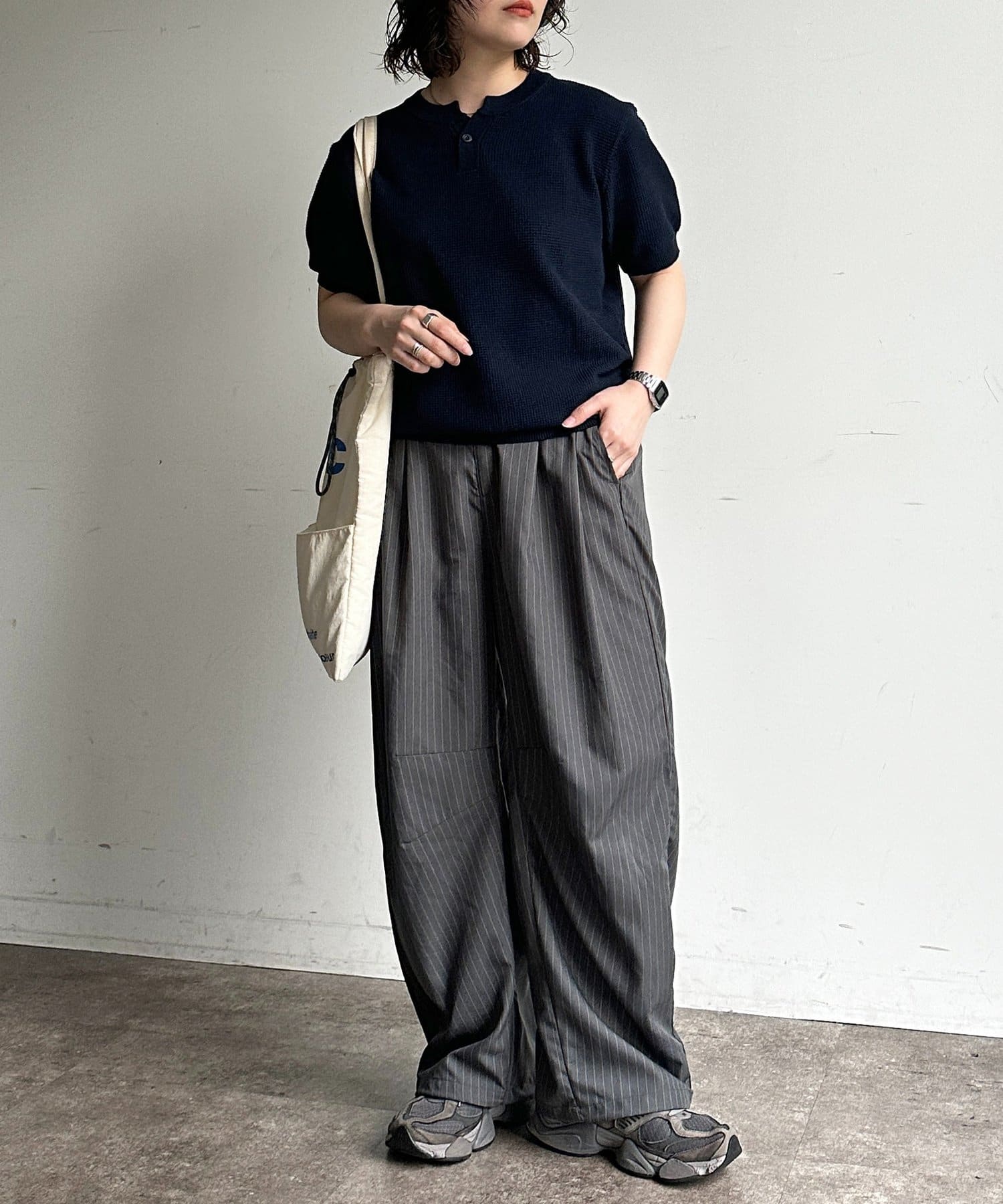 豊かな表情を見せるワッフル調の編地が、シンプルな着こなしに奥行きをプラスします。